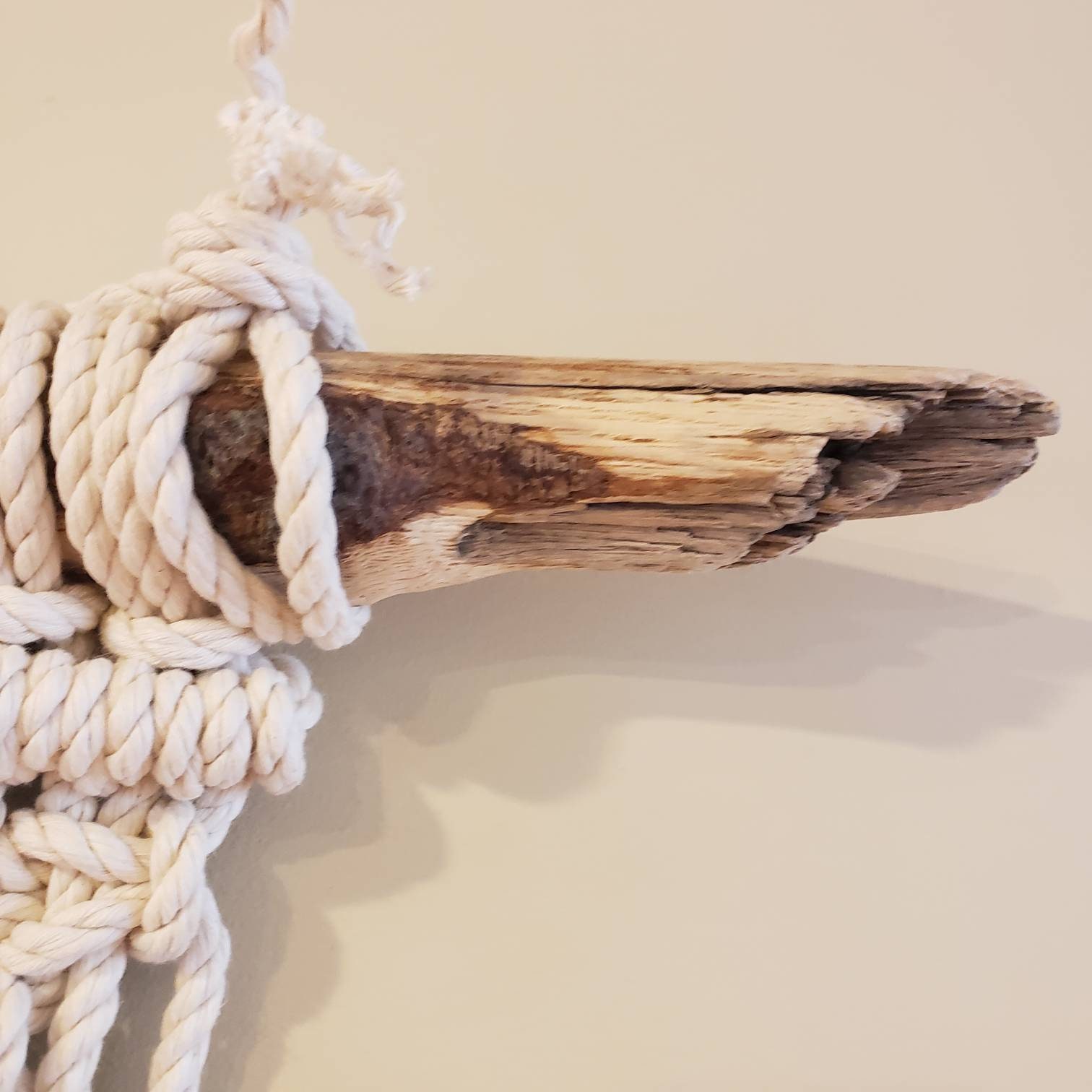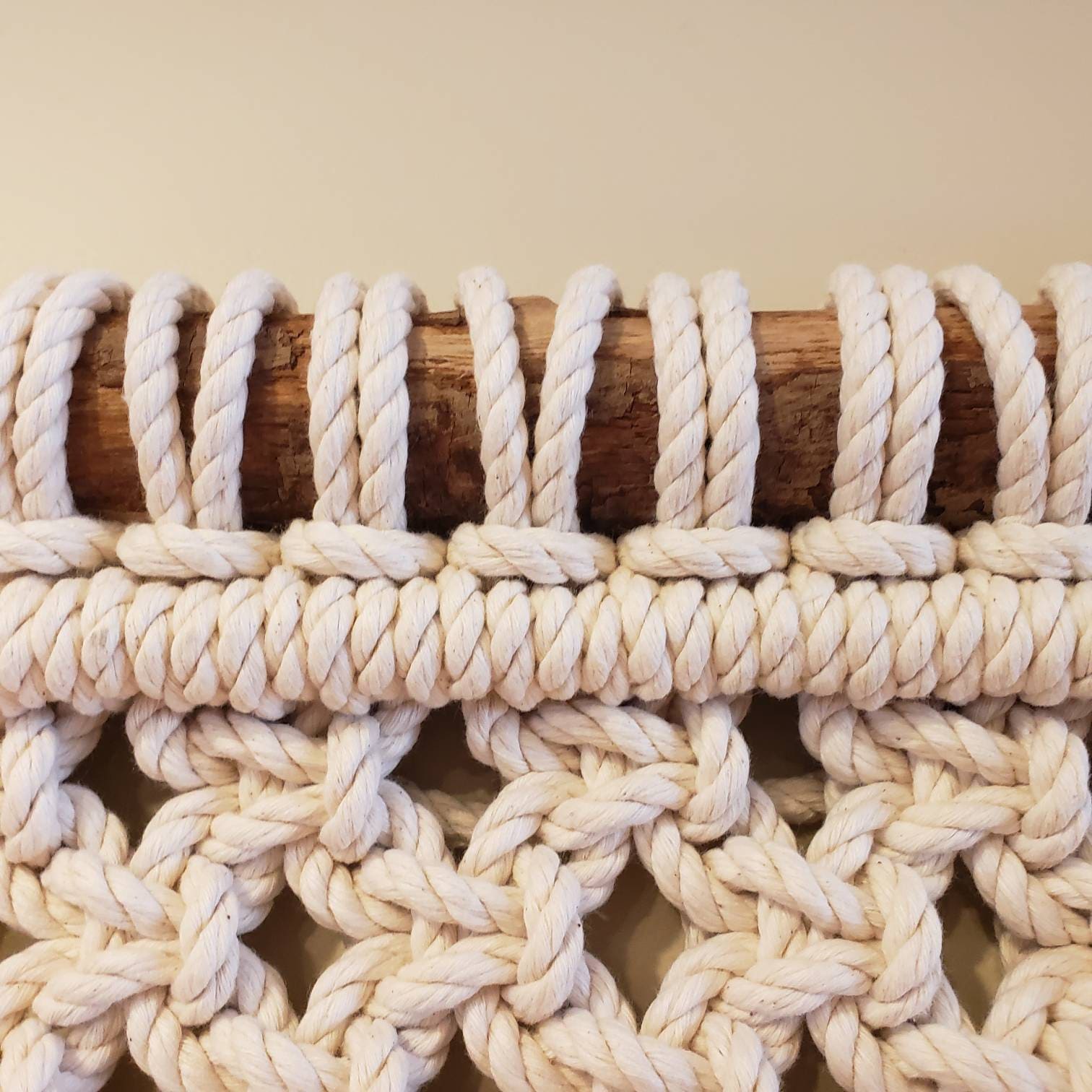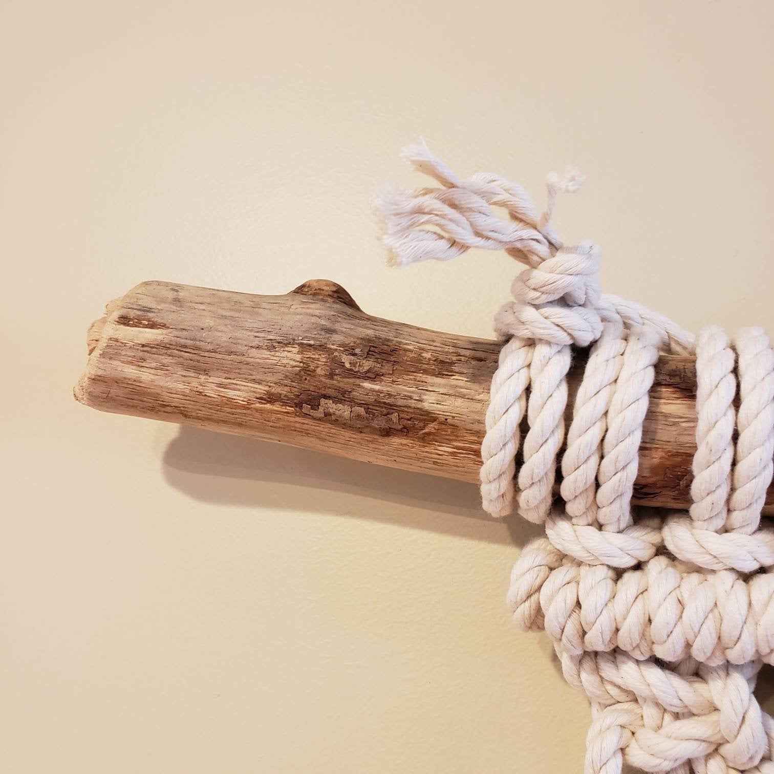 The Handmade Macrame Wall Hanging is made with 8mm Natural Cotton cord hanging off of a unique piece of Driftwood.