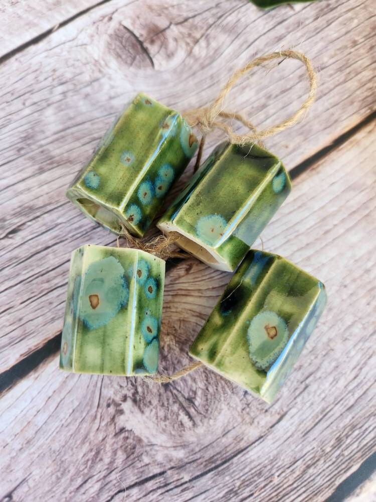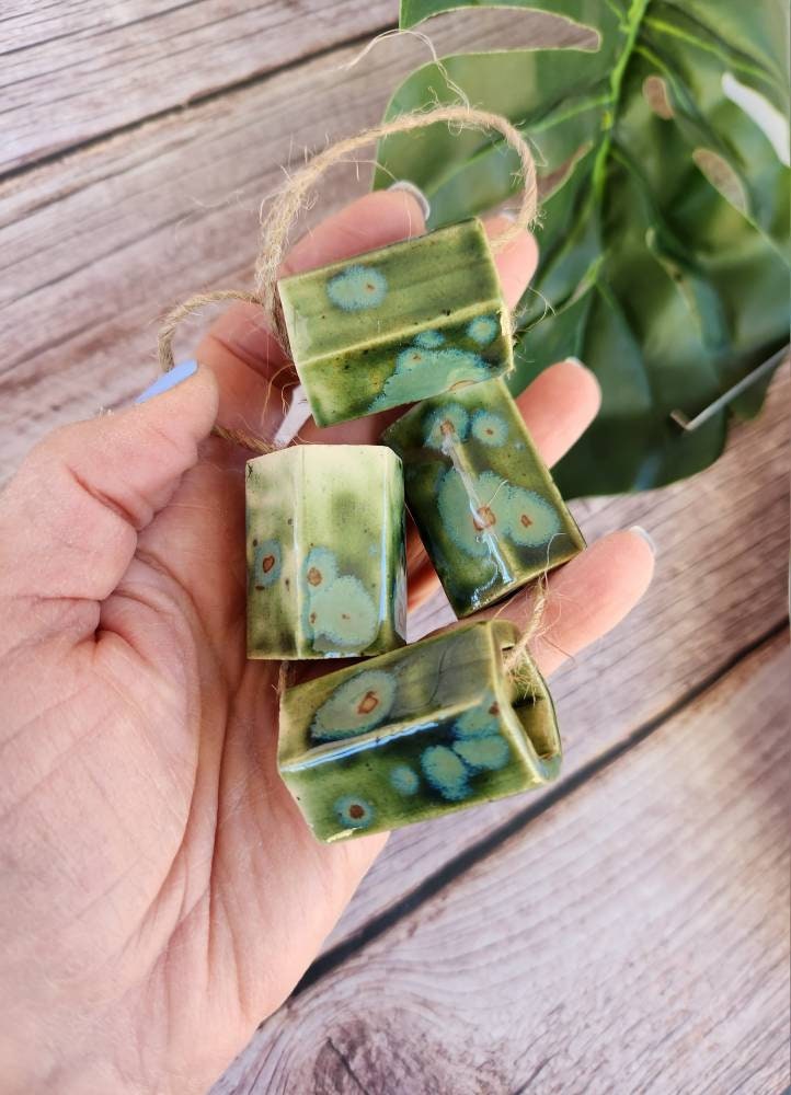 The 3 iridescent green and blue beads measure approximately 1.75" in length and .75" in width. Please see the picture of this bead showcased in Beth's fiber art @fibervibes 305.