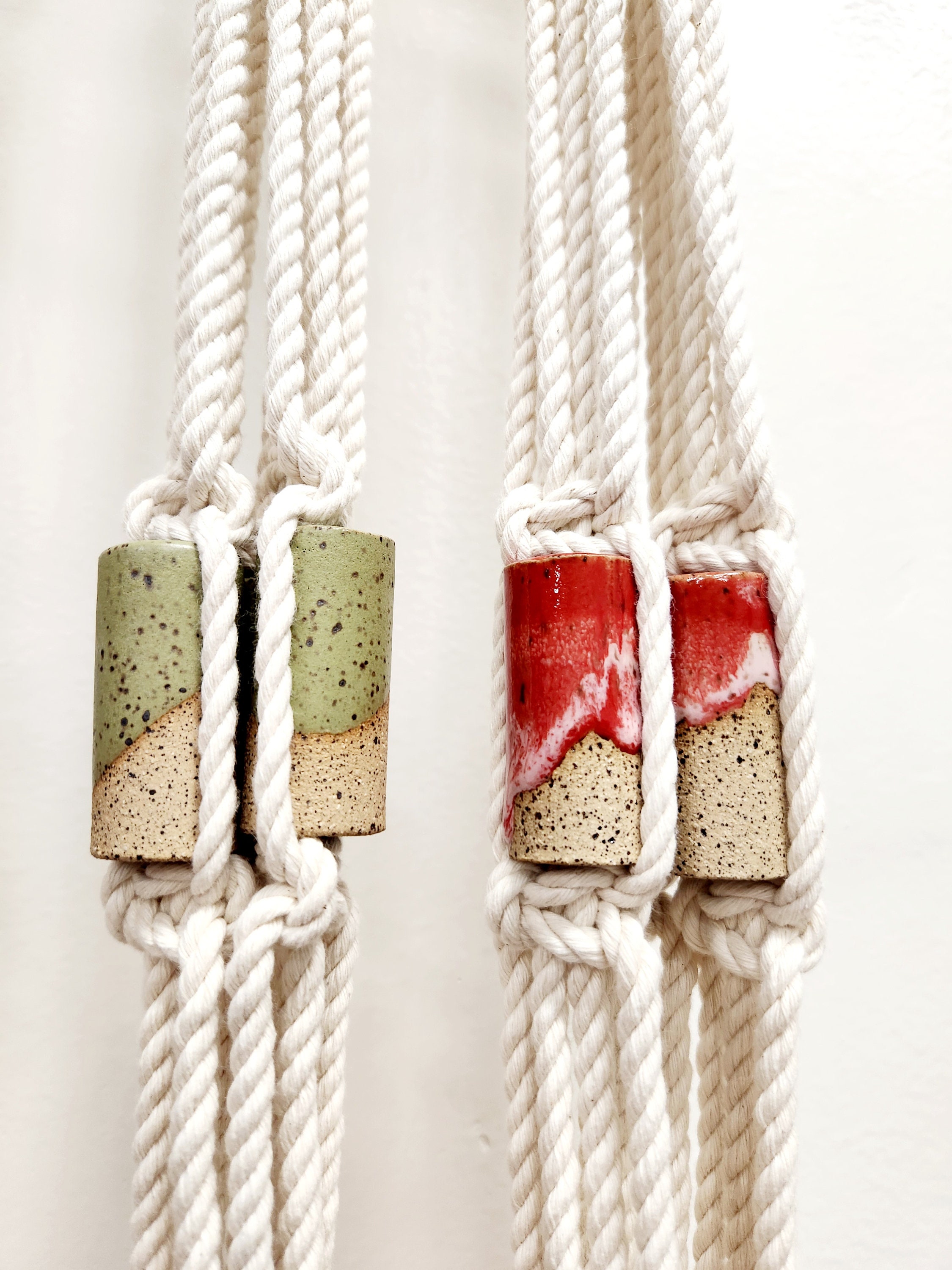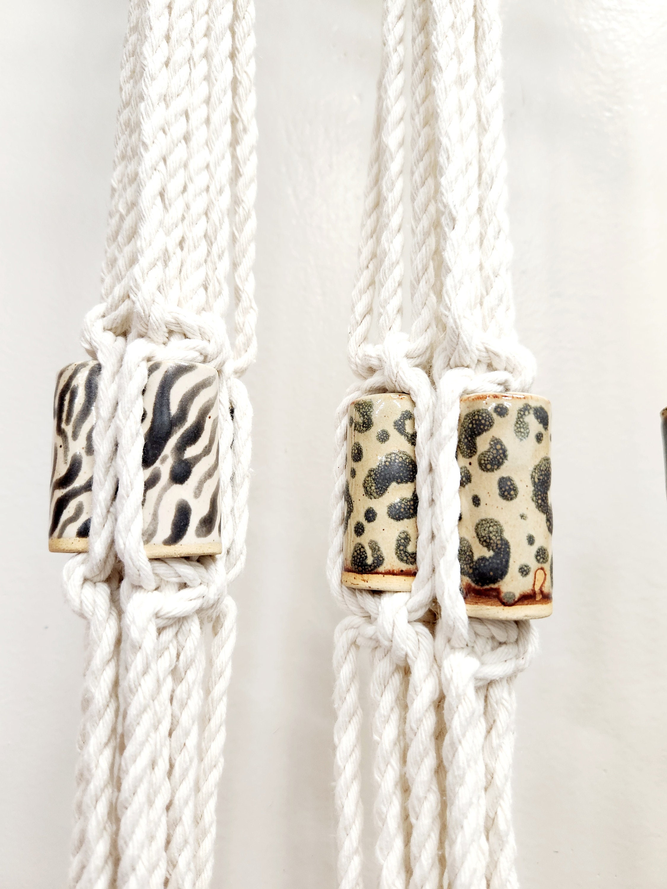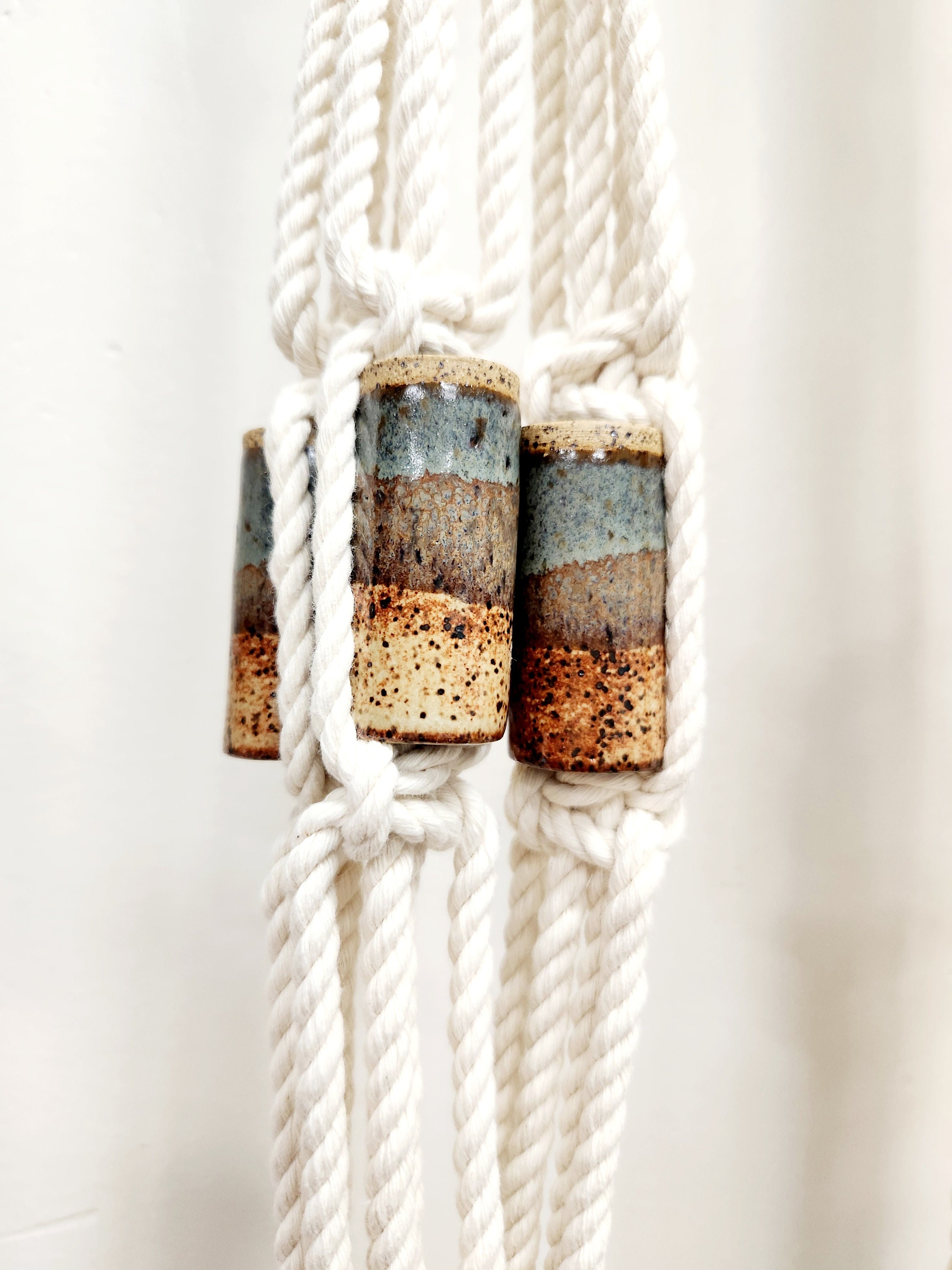These Macrame Plant holders are made from natural cotton cord and detailed with handcrafted ceramic beads. Each one hangs from a solid brass ring, making it very sturdy, and can accommodate most planters. I'v used all sizes of my handcrafted ceramic planters in these, and they fit great. The beads measure approximately 1.75" long. Measurements are from top of brass ring to bottom fringe.