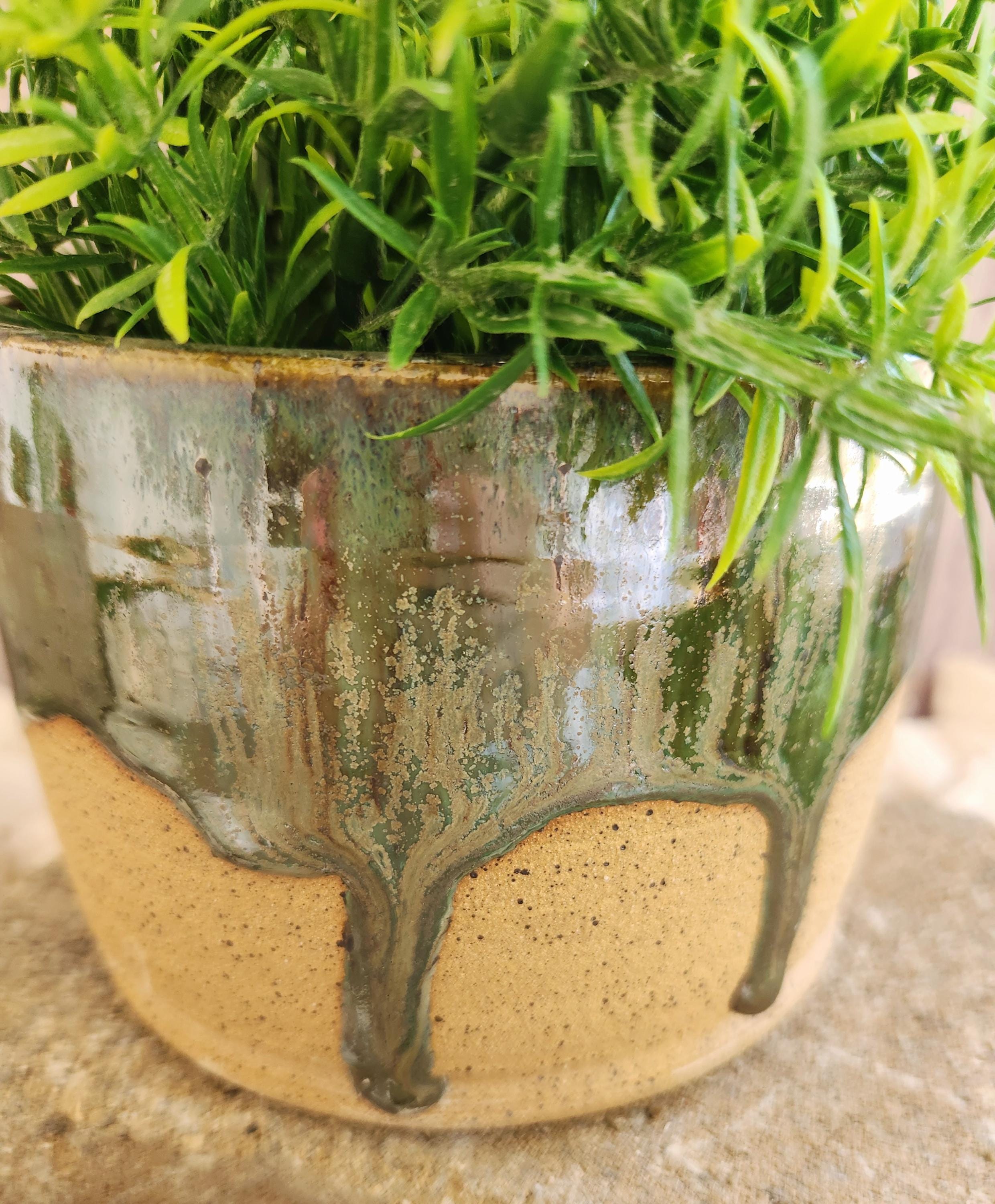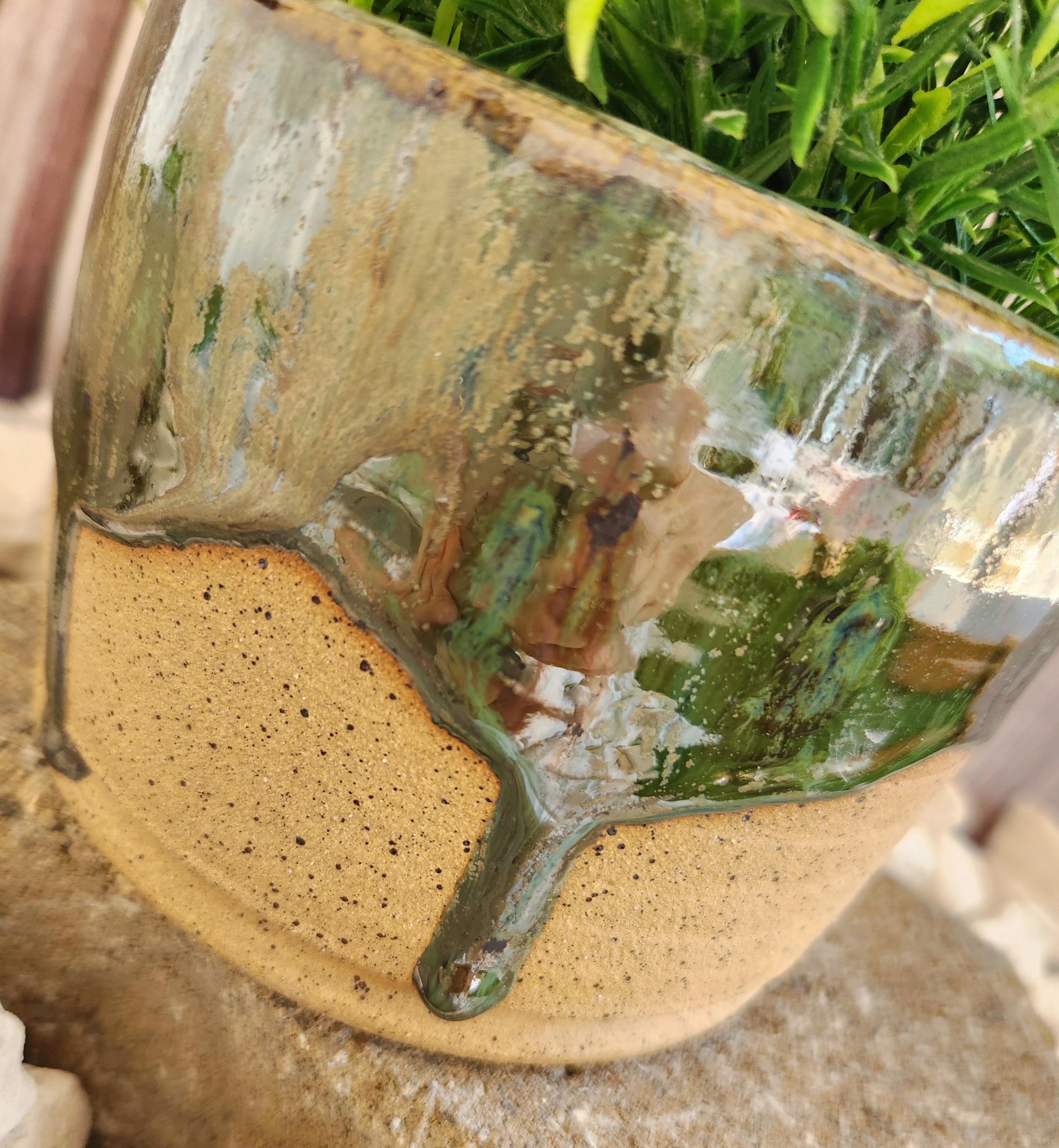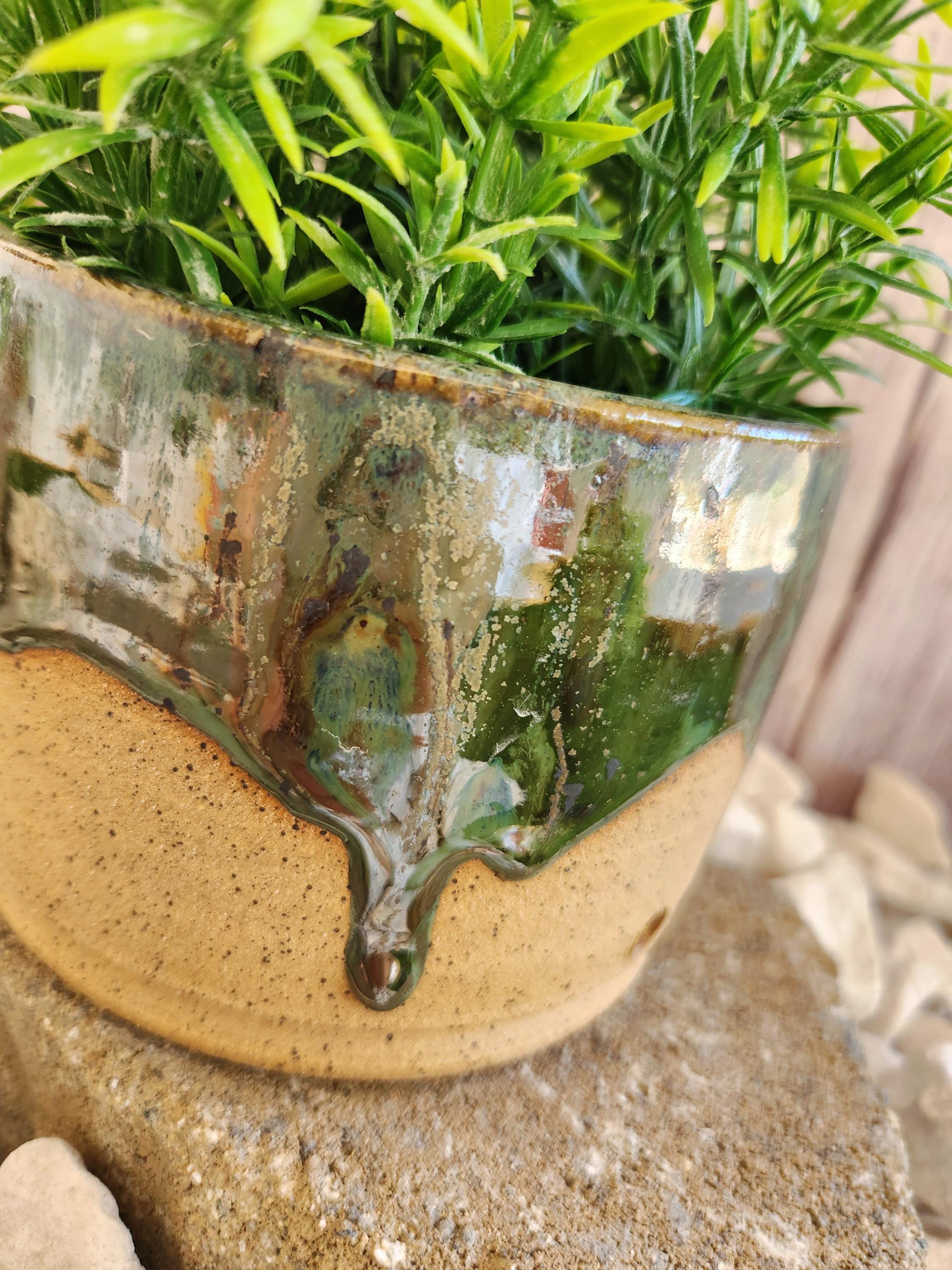 This buff speckled clay planter is finished in a super shiny green iridescent glaze finish. With it's drippy finish all around, the iridescent green and highlights of gold but it won't disappoint. Pictures don't do it justice.