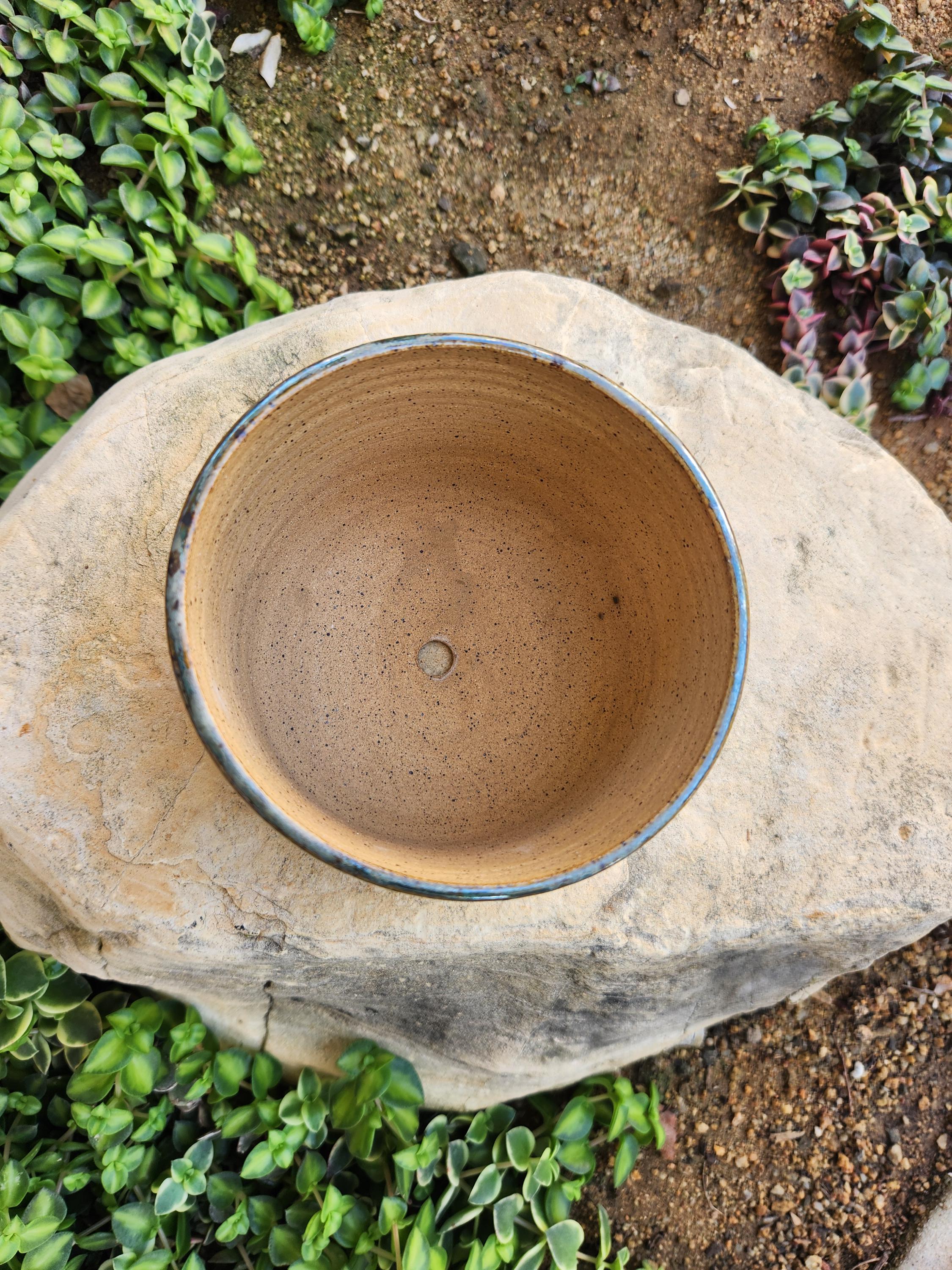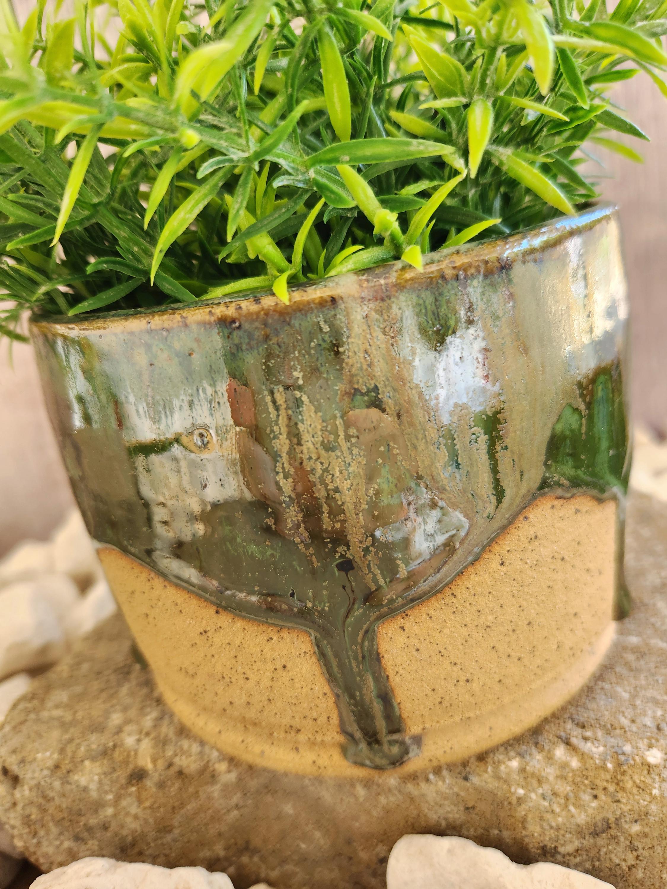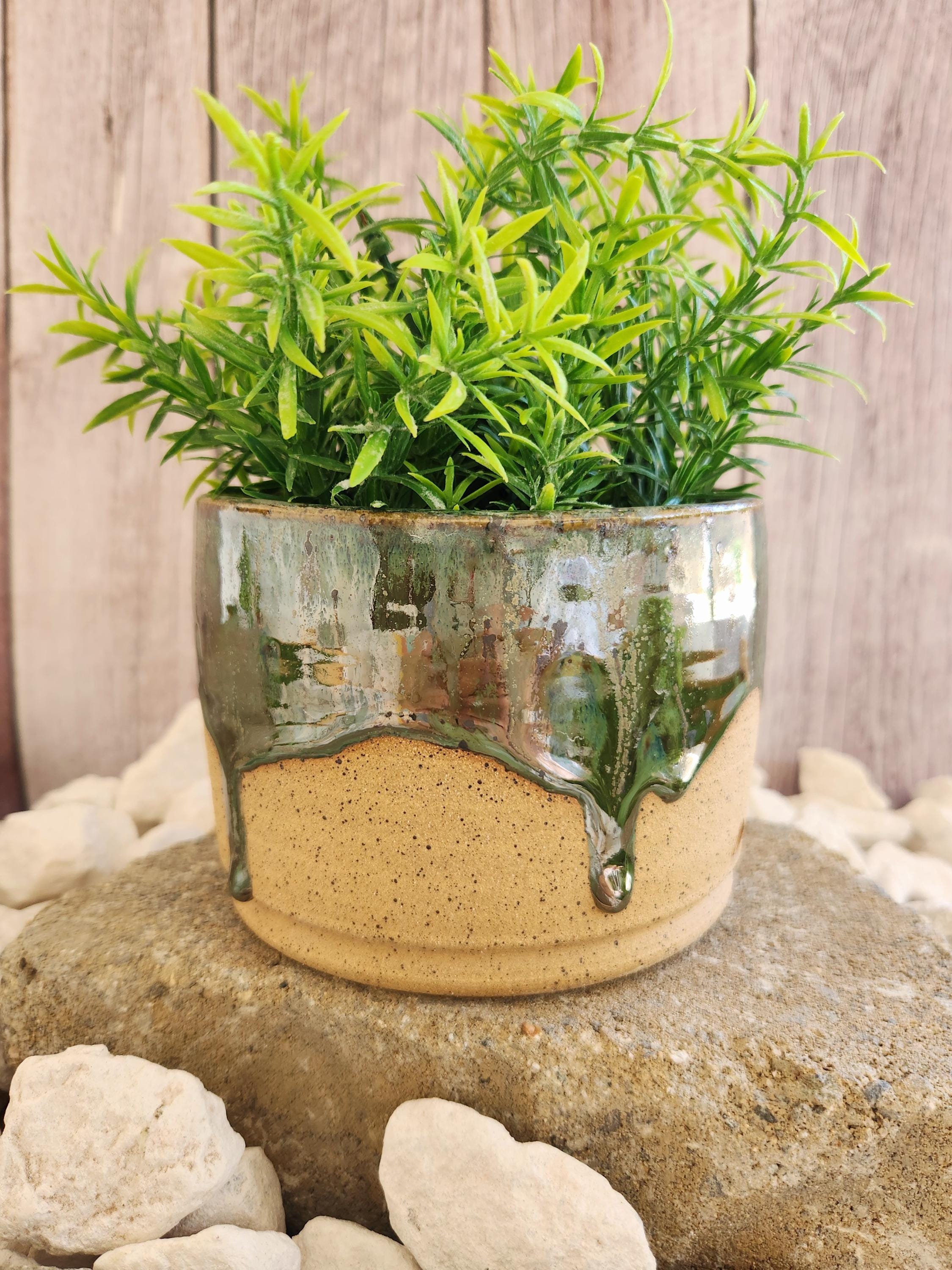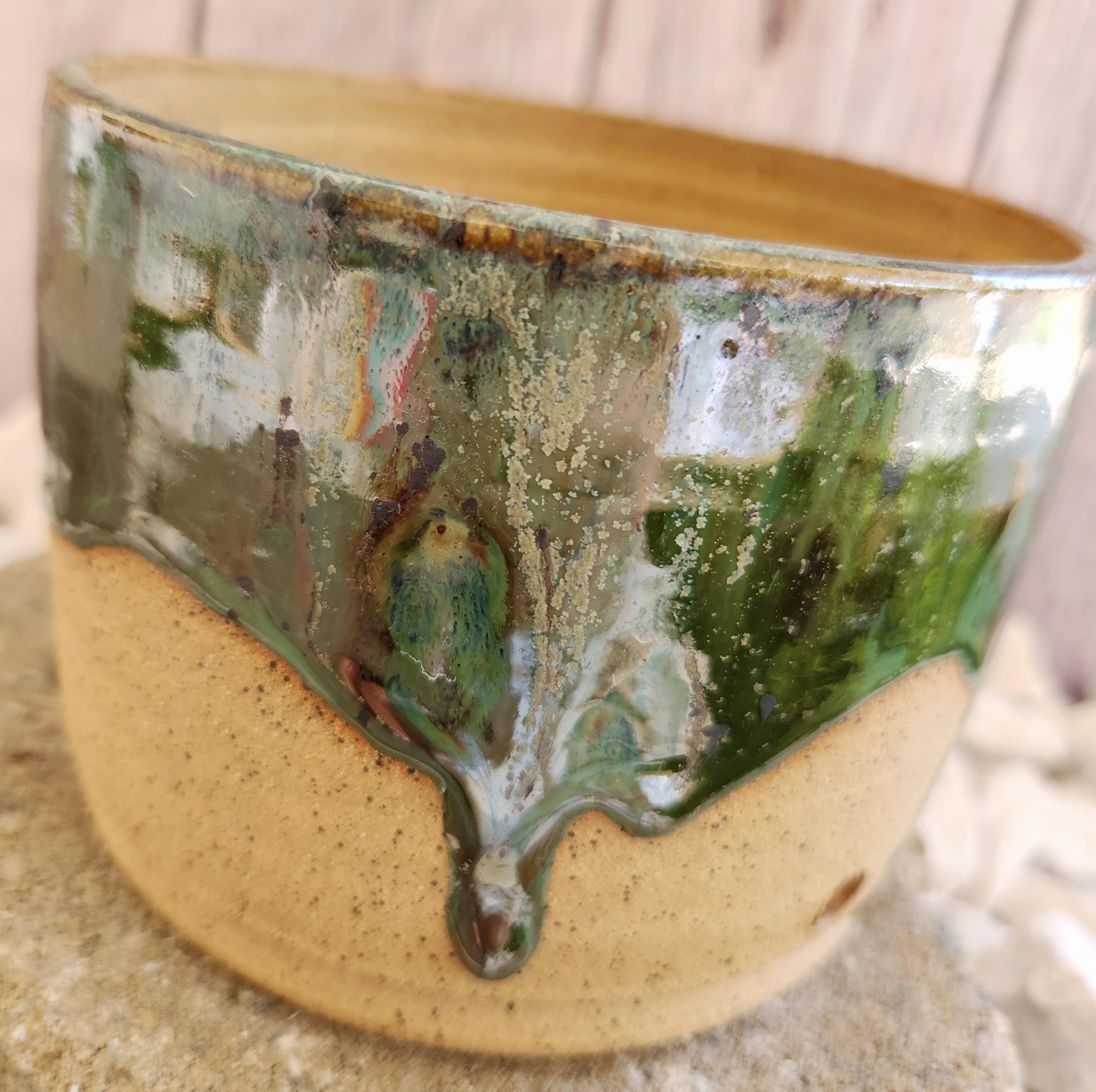 This buff speckled clay planter is finished in a super shiny green iridescent glaze finish. With it's drippy finish all around, the iridescent green and highlights of gold but it won't disappoint. Pictures don't do it justice.