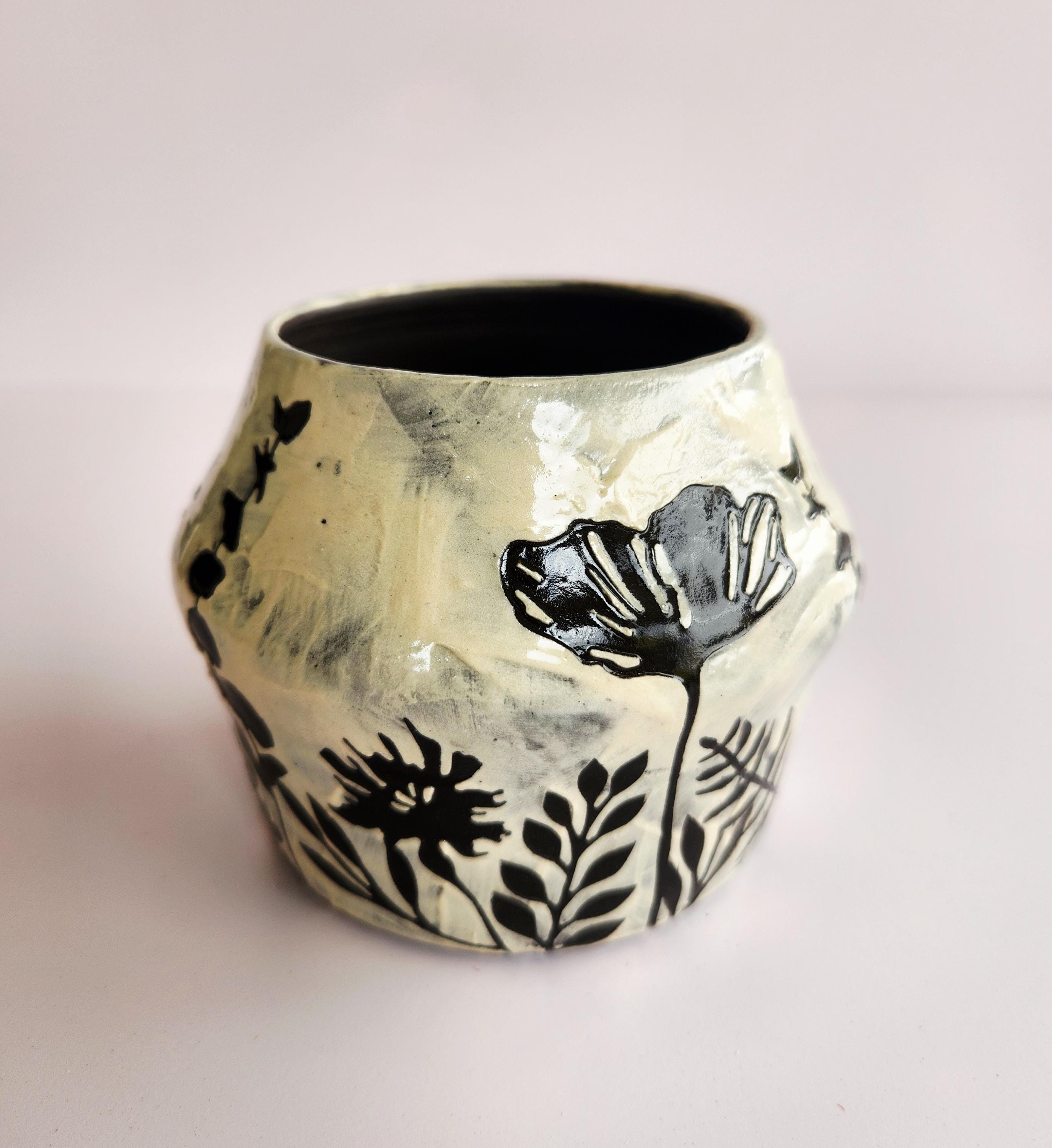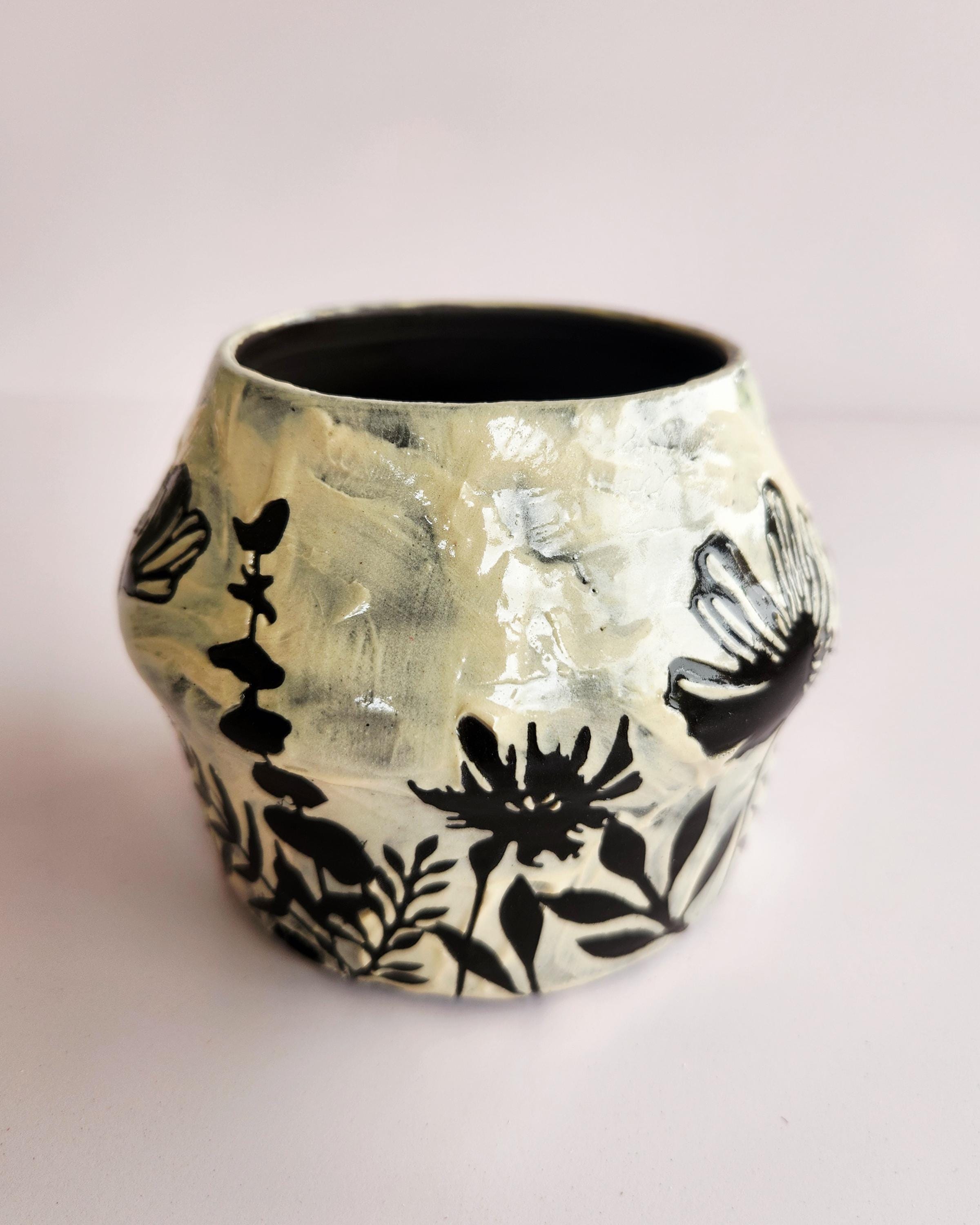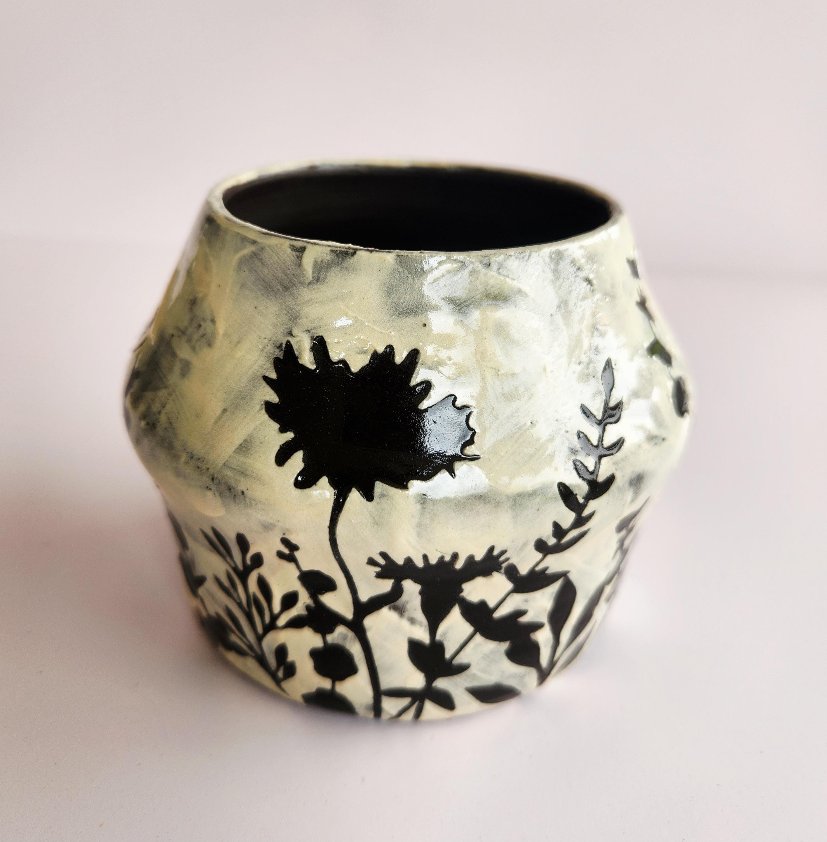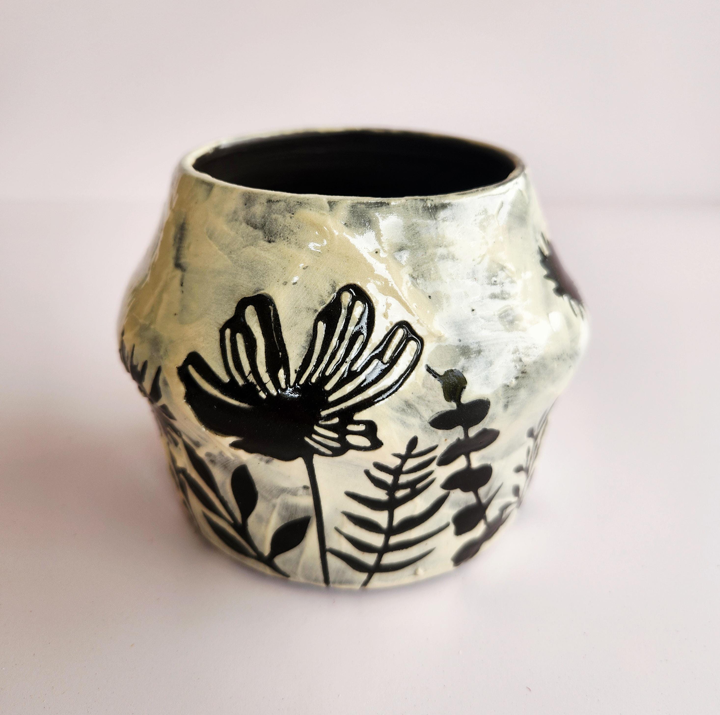 This small vase has a unique, organic feel and appearance. It's made from Chocolate brown clay with a cream glaze. The design has been made from my handmade stencils and finished in a shiny clear glaze. Great for a small flower arrangement.