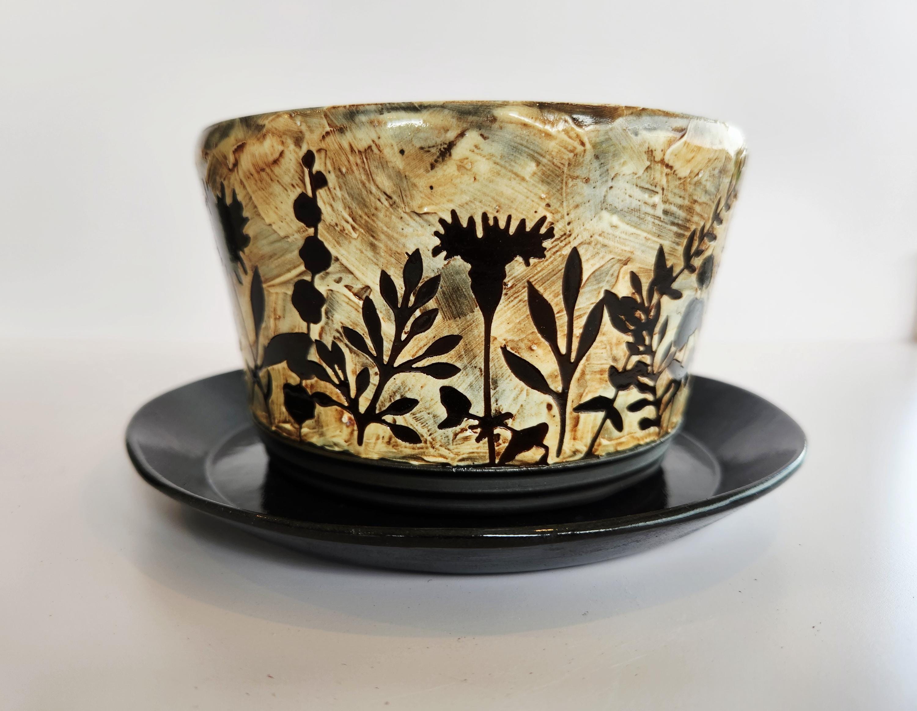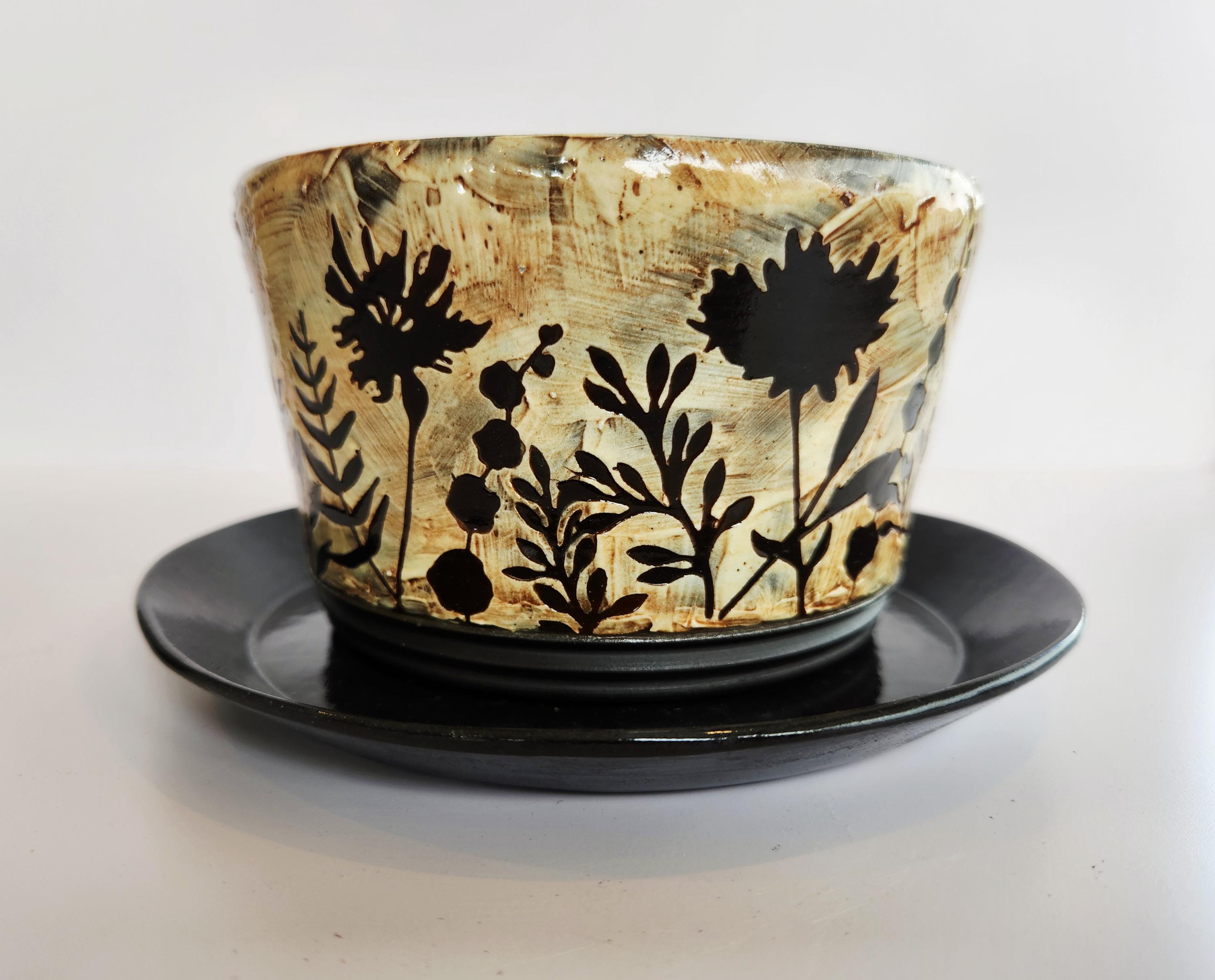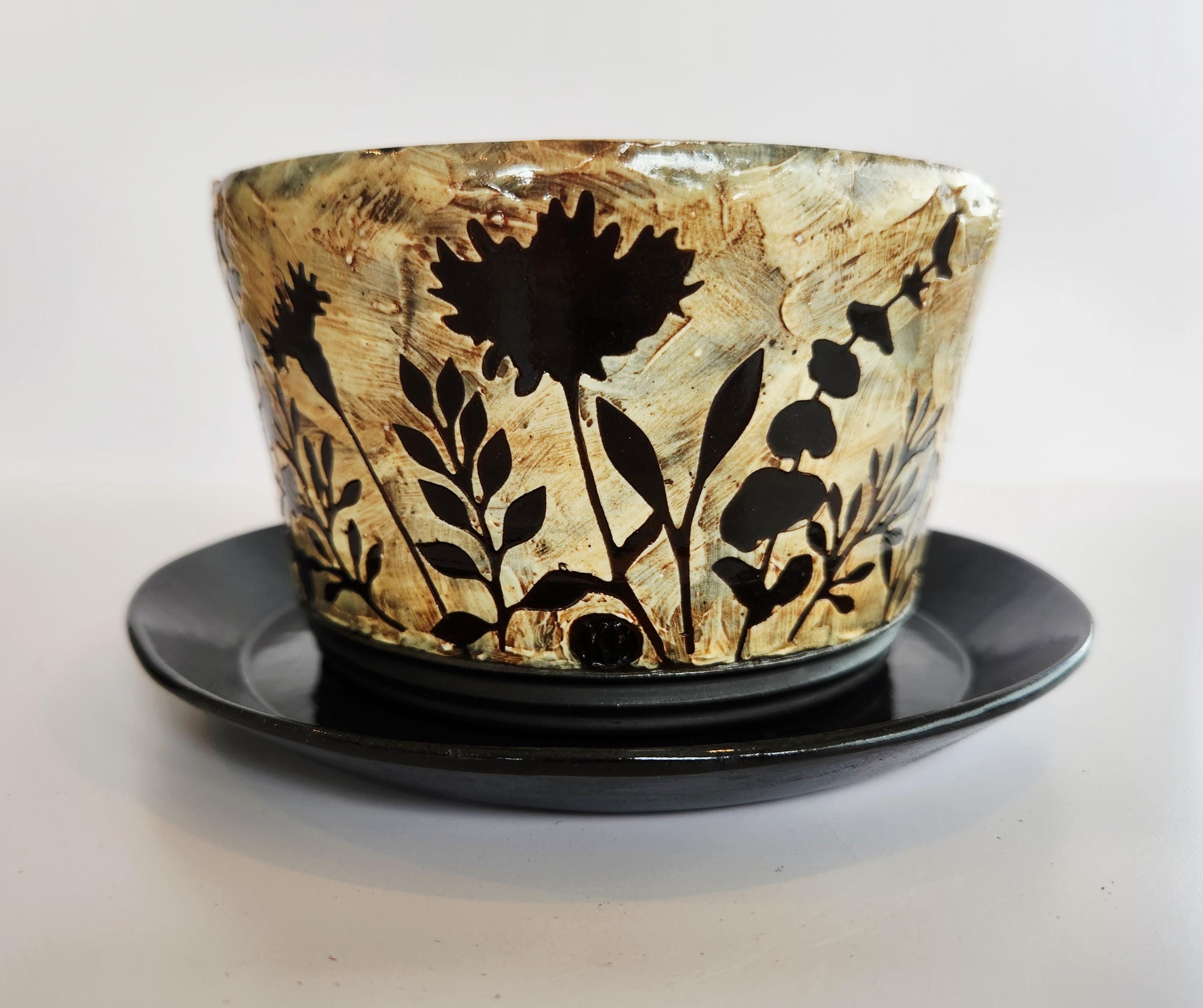 This planter has a unique, organic feel and appearance. It's made from Chocolate brown clay with a cream glaze. The design has been made from my handmade stencils and finished in a shiny clear glaze.
