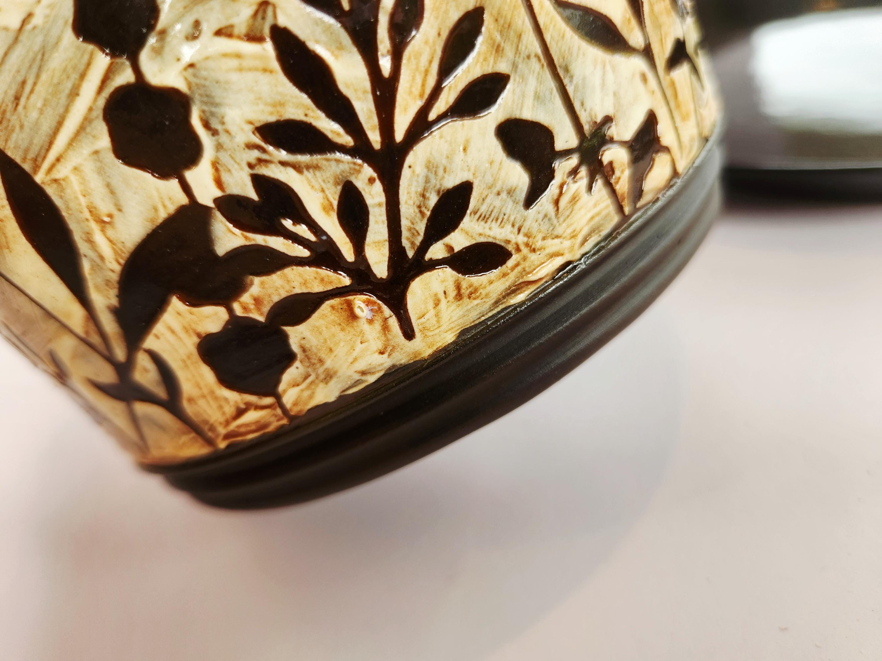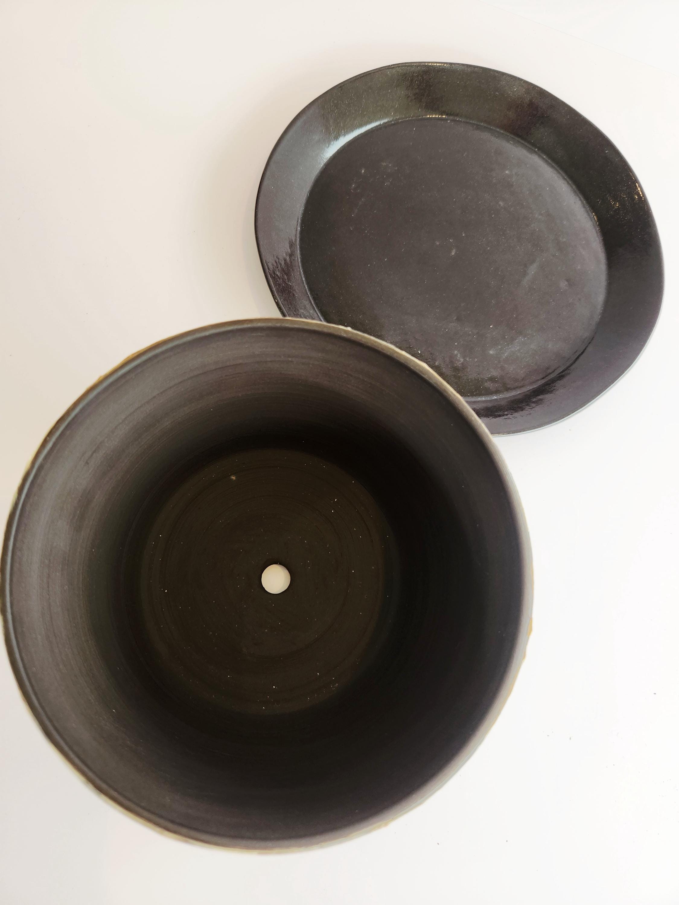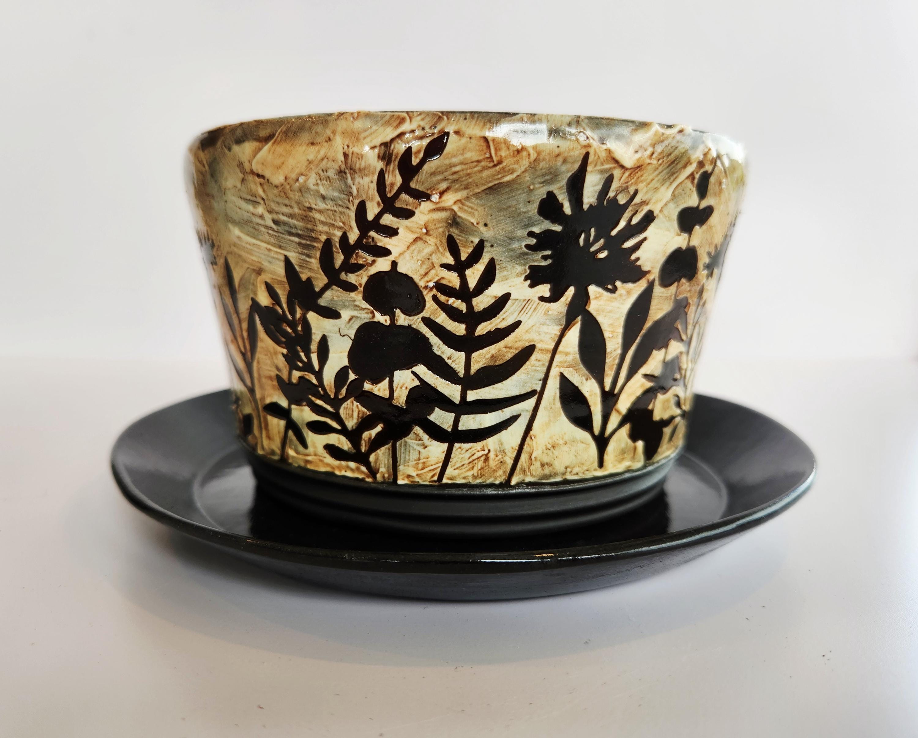 This planter has a unique, organic feel and appearance. It's made from Chocolate brown clay with a cream glaze. The design has been made from my handmade stencils and finished in a shiny clear glaze.