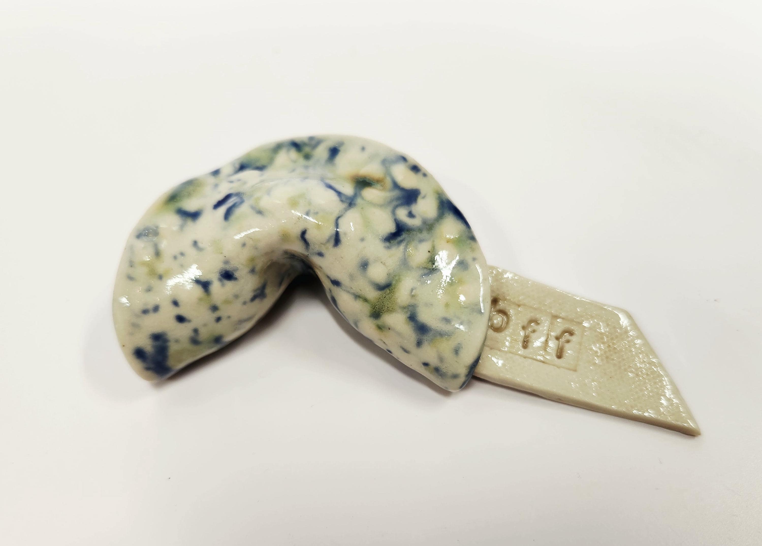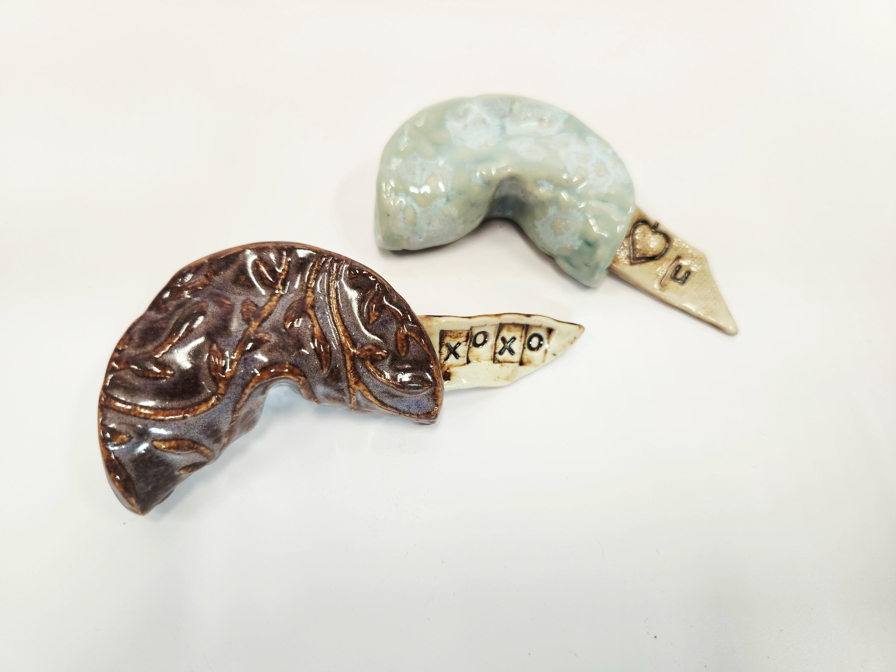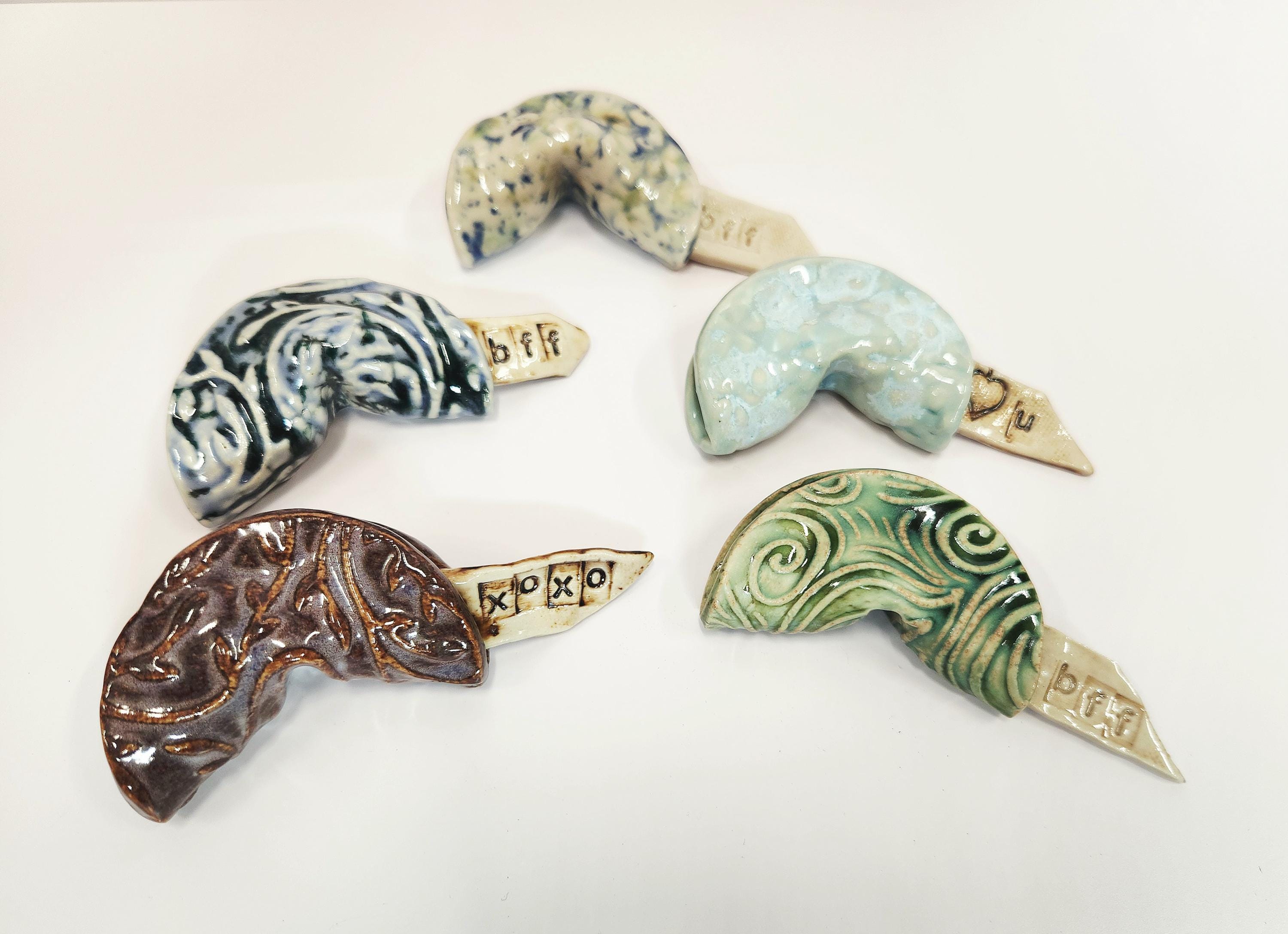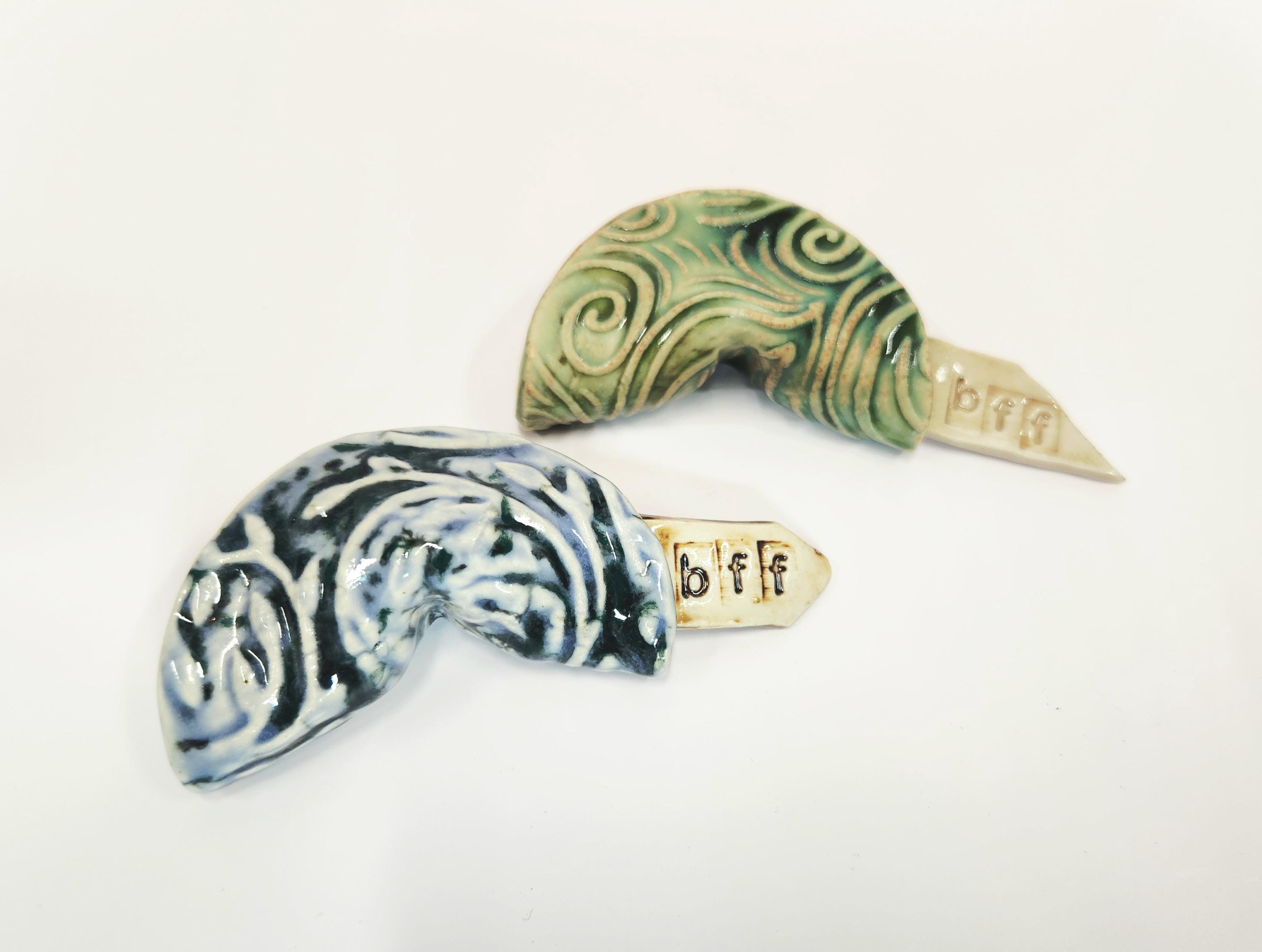 Each Fortune Cookie is unique and one of a kind. Handcrafted each with a unique pattern and glaze, these ceramic cookies have their own special message. Great to tuck in a lunch as a sweet surprise of hidden for that special someone to find. Sure to be a special gift for anyone....