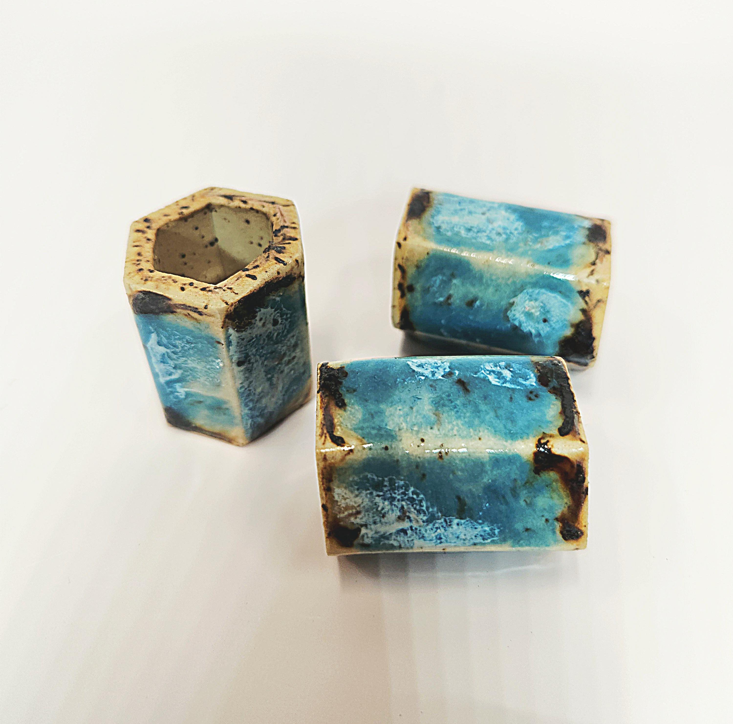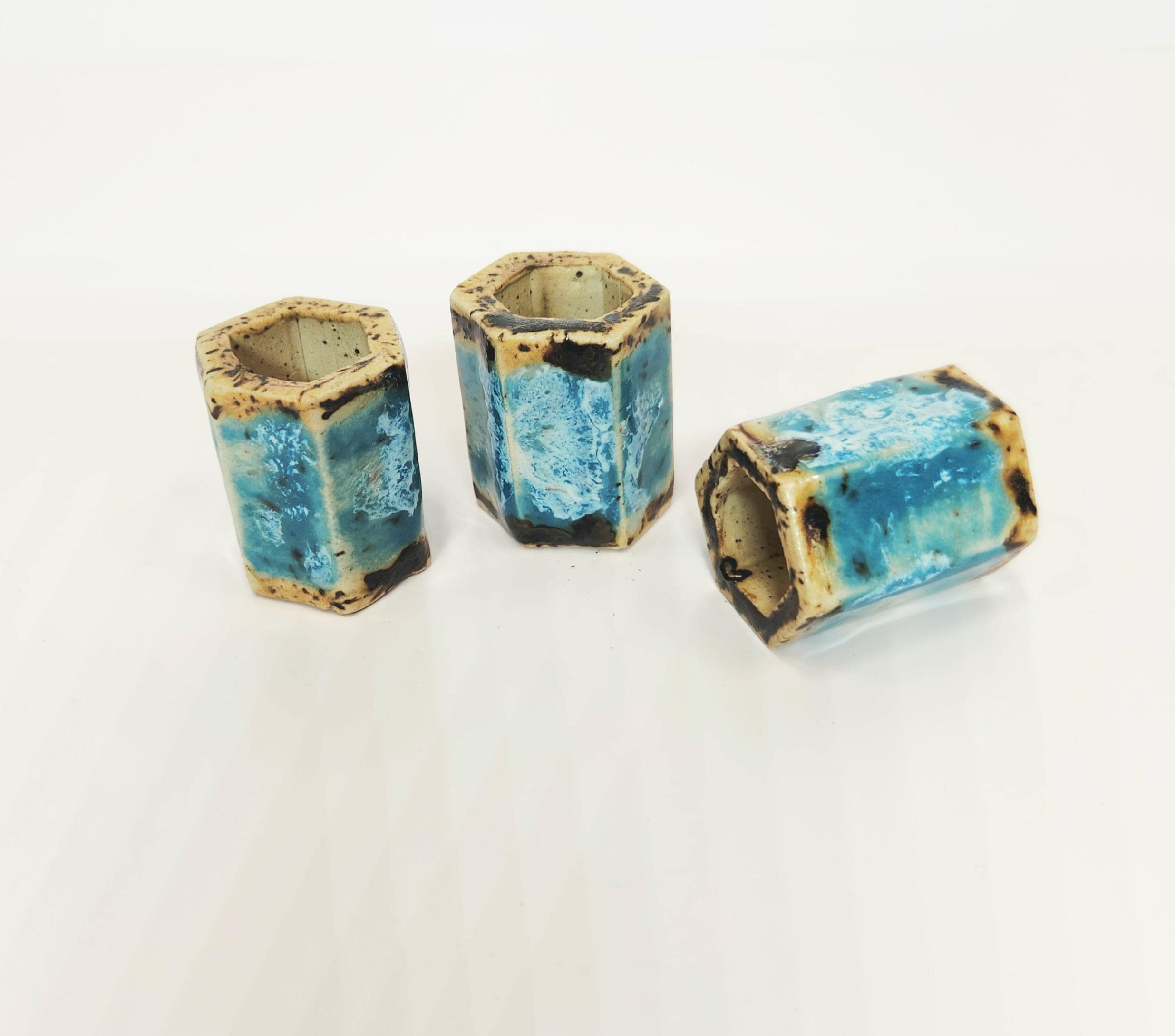 I do my best to match the beads as closely as possible as each one is handmade. This set includes 3 beads; each finished in turquoise blue with highlights of creamy white and brown specks throughout. The edges are finished in a cream with brown speckles