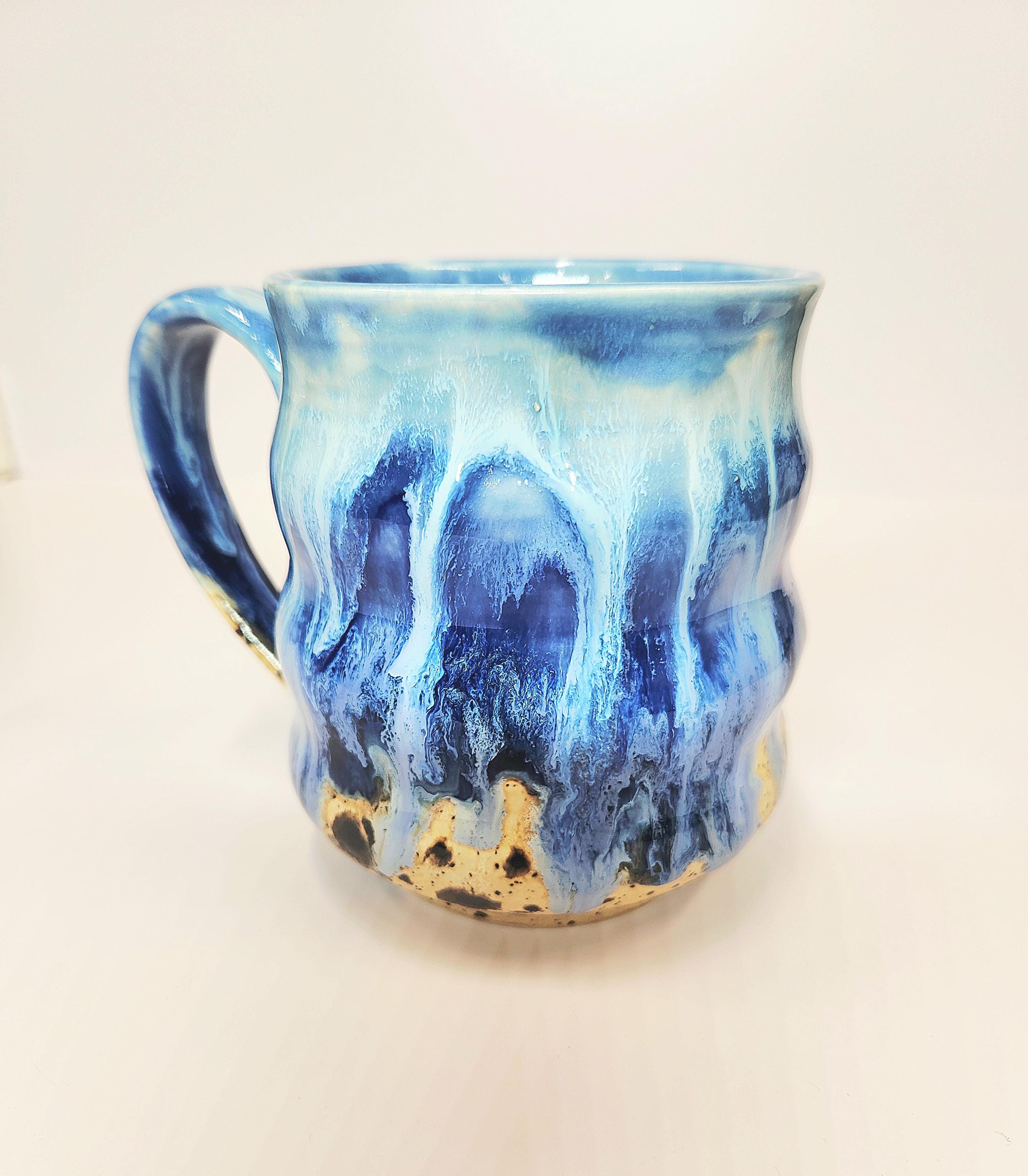 The wavy style mugs are exceptionally durable, crafted using "slip molds" that ensure a consistent and uniform appearance. Measuring 3.75" in width and 5" in height, these mugs have a generous capacity of 20 fluid ounces, making them ideal for serving various beverages.