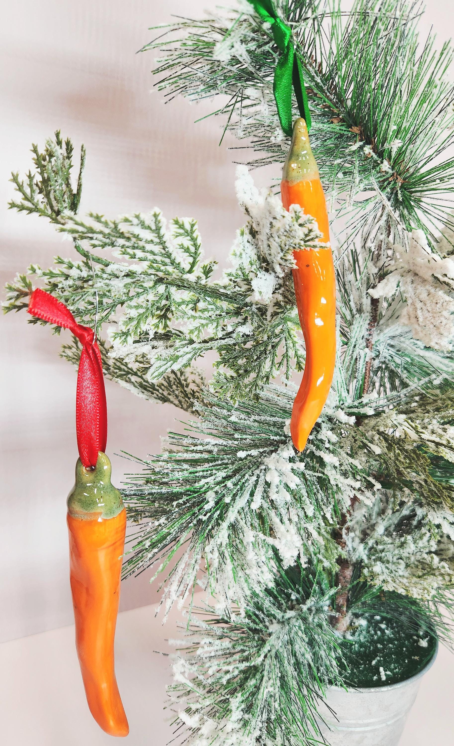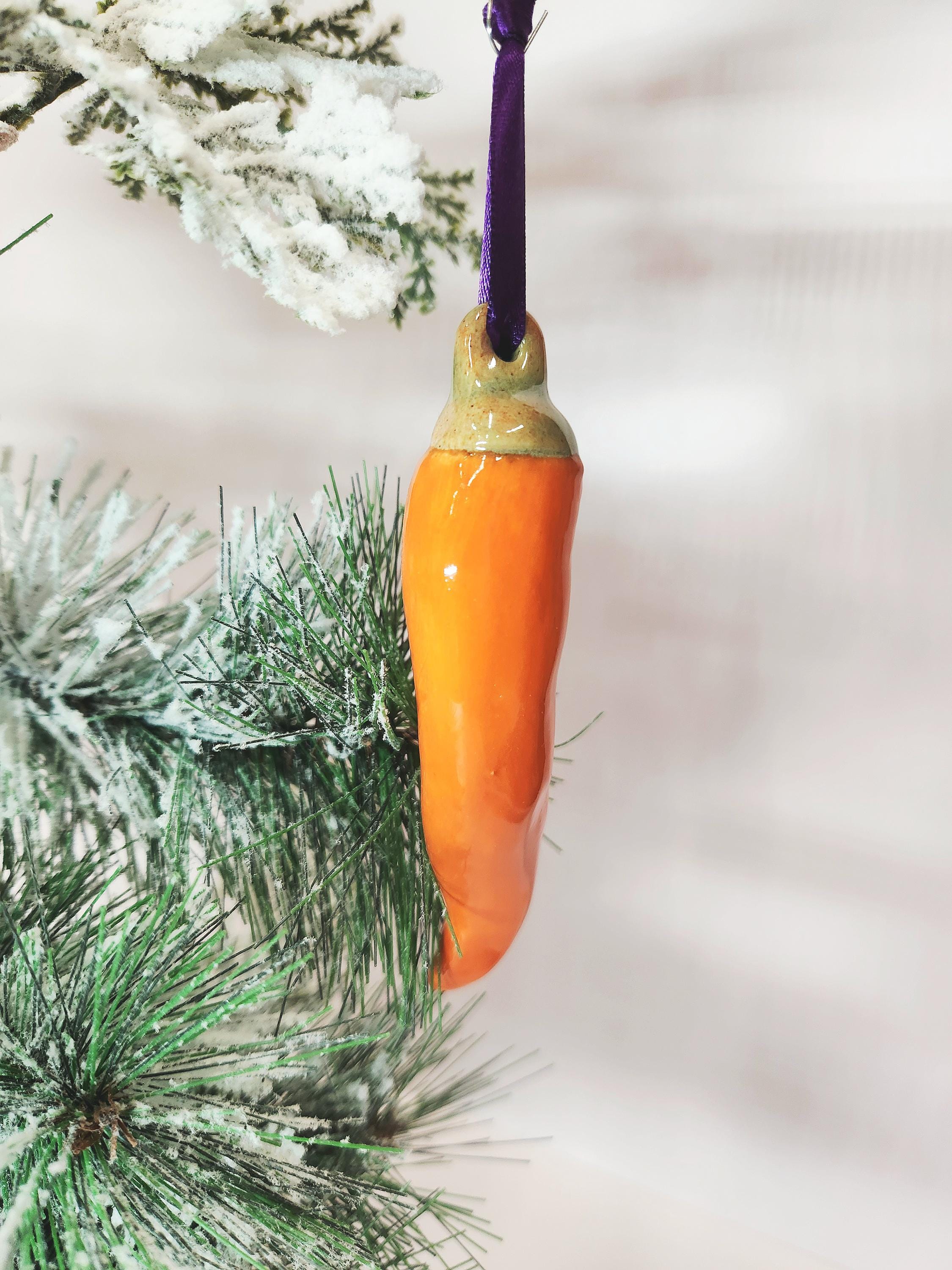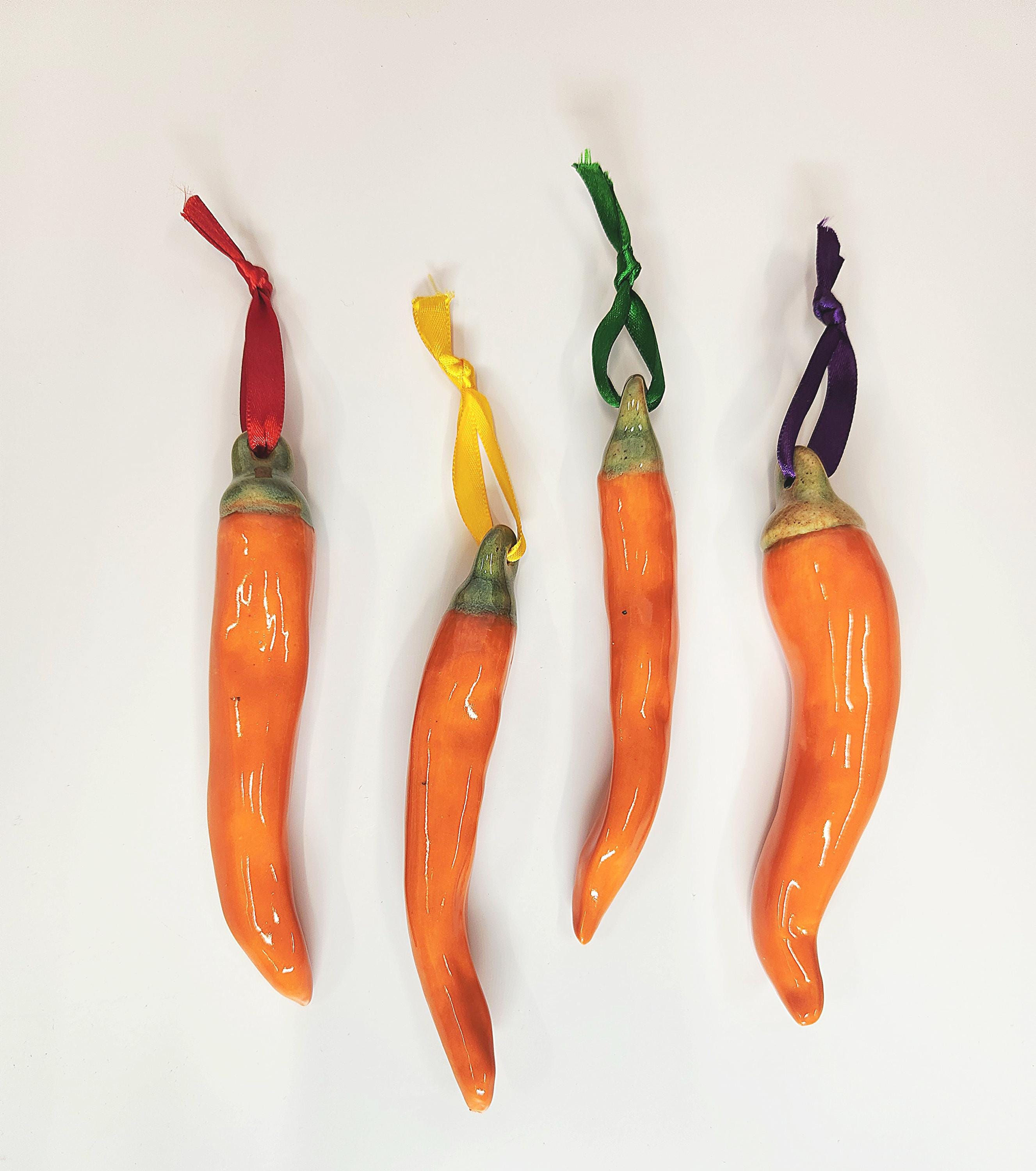 This set of four ceramic handcrafted chili pepper ornaments are finished in a glossy Orange glaze. There is one large, one medium and two smaller sizes included in this set. These are perfect for adding a festive touch to your Holiday decor, a unique gift for an ornament exchange, or even as a decoration on a gift.