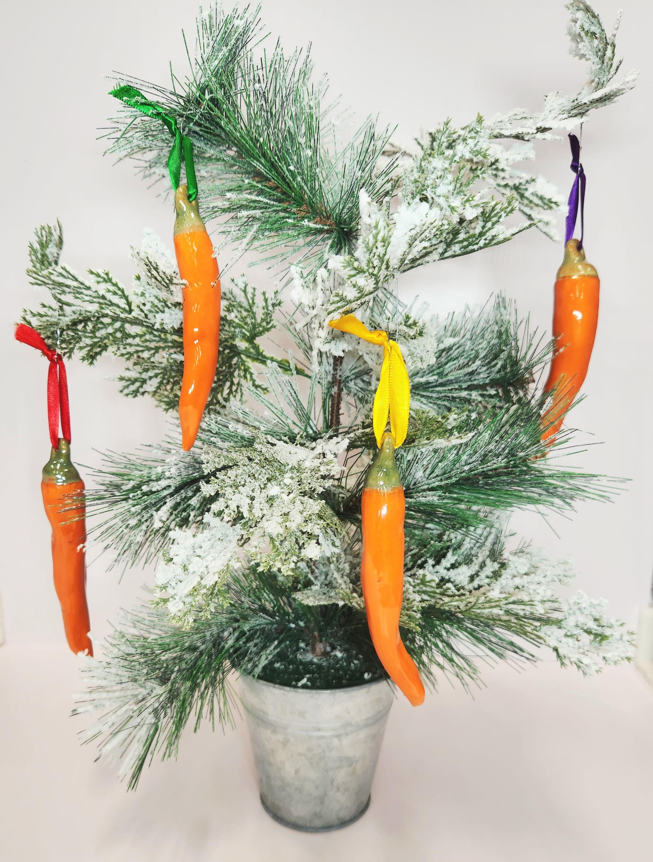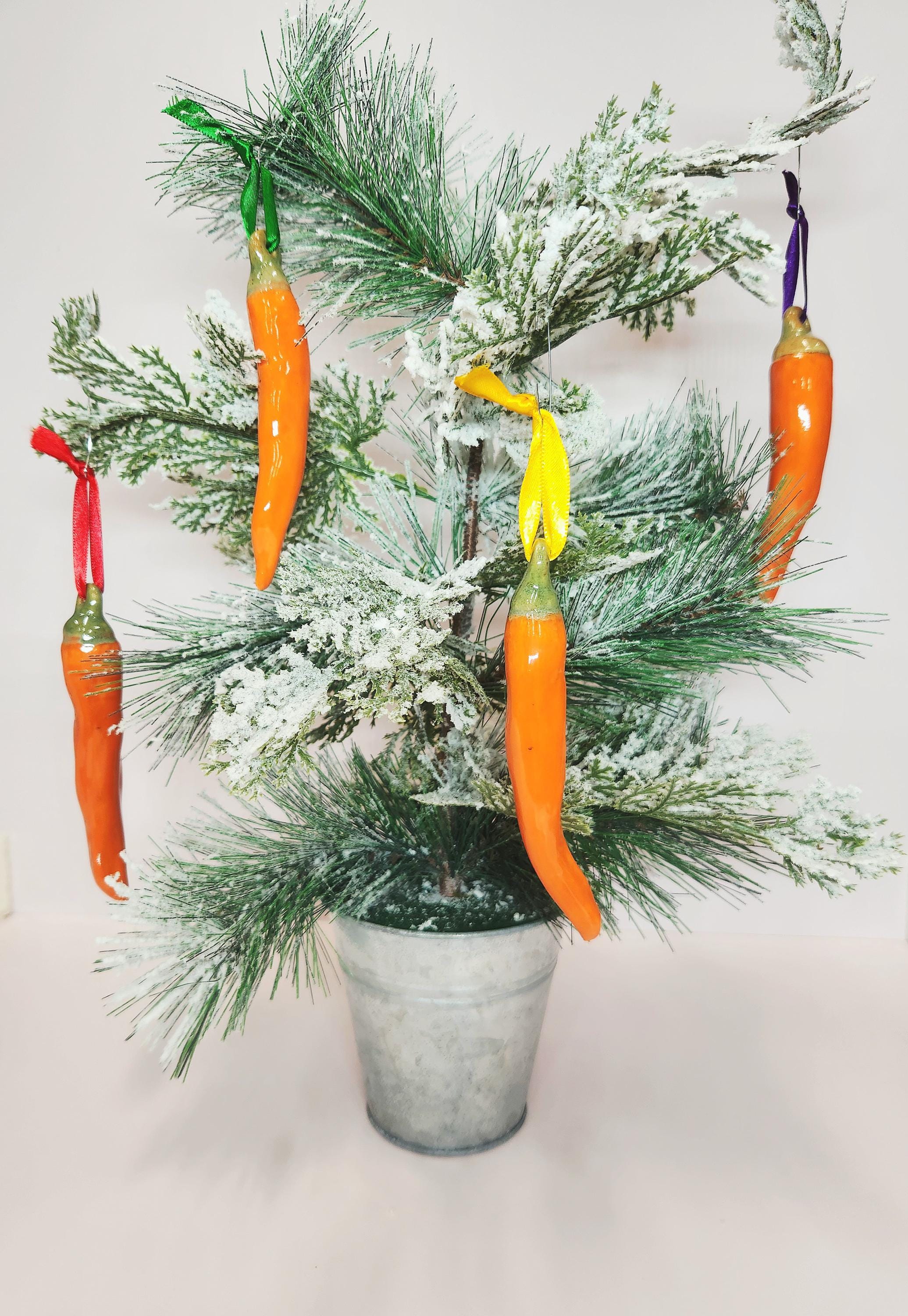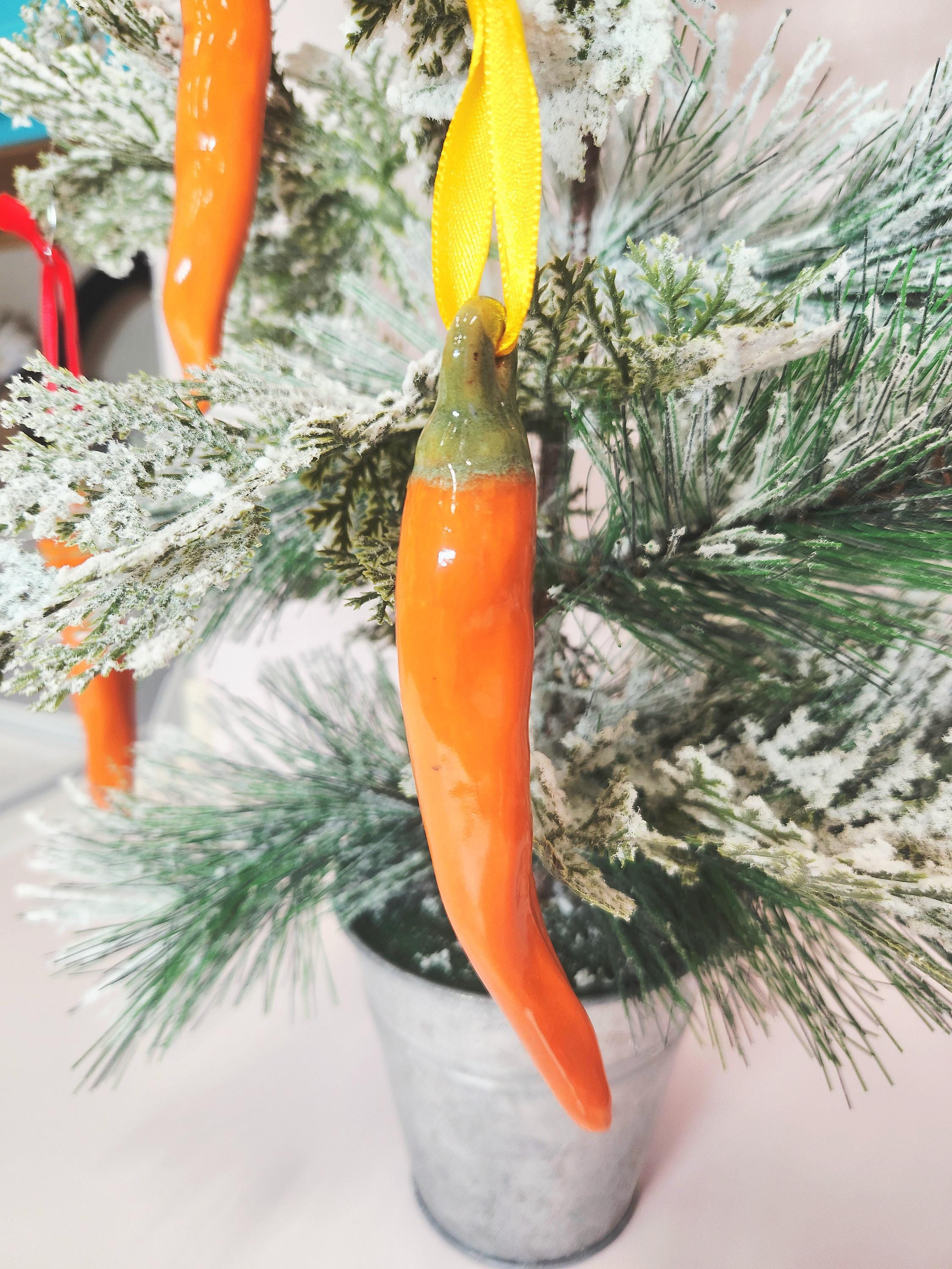 This set of four ceramic handcrafted chili pepper ornaments are finished in a glossy Orange glaze. There is one large, one medium and two smaller sizes included in this set. These are perfect for adding a festive touch to your Holiday decor, a unique gift for an ornament exchange, or even as a decoration on a gift.