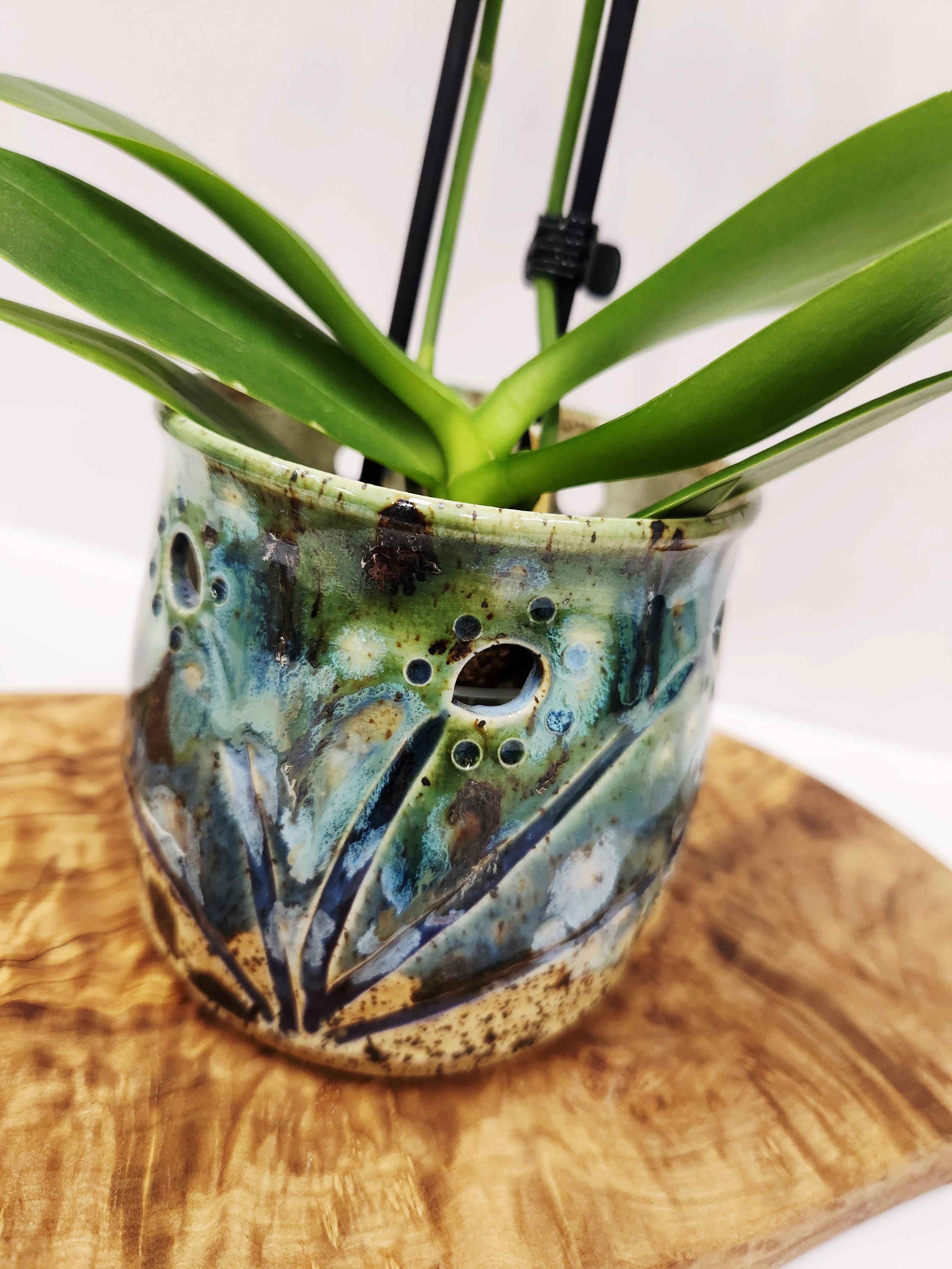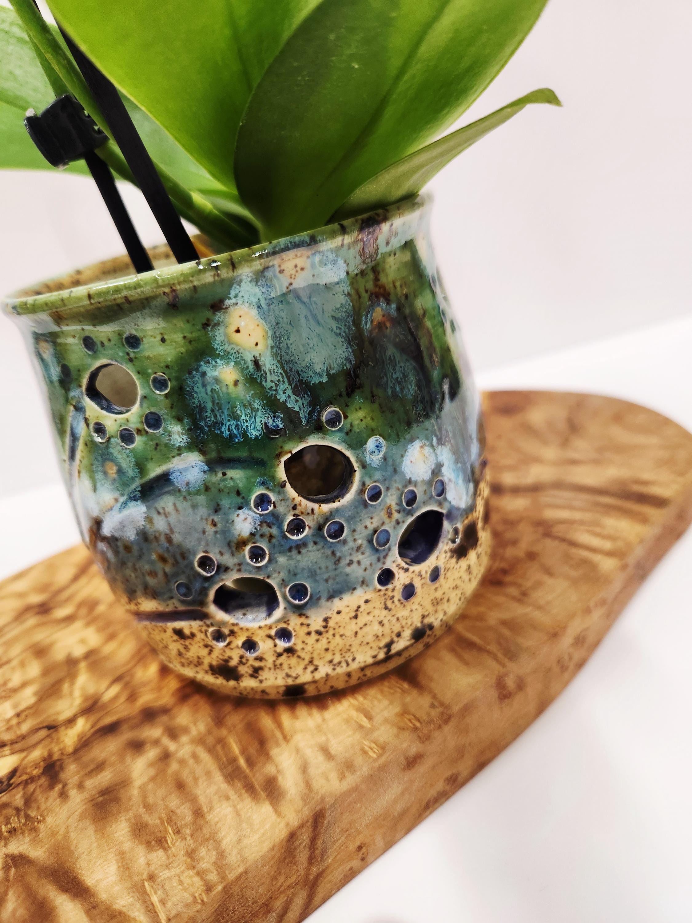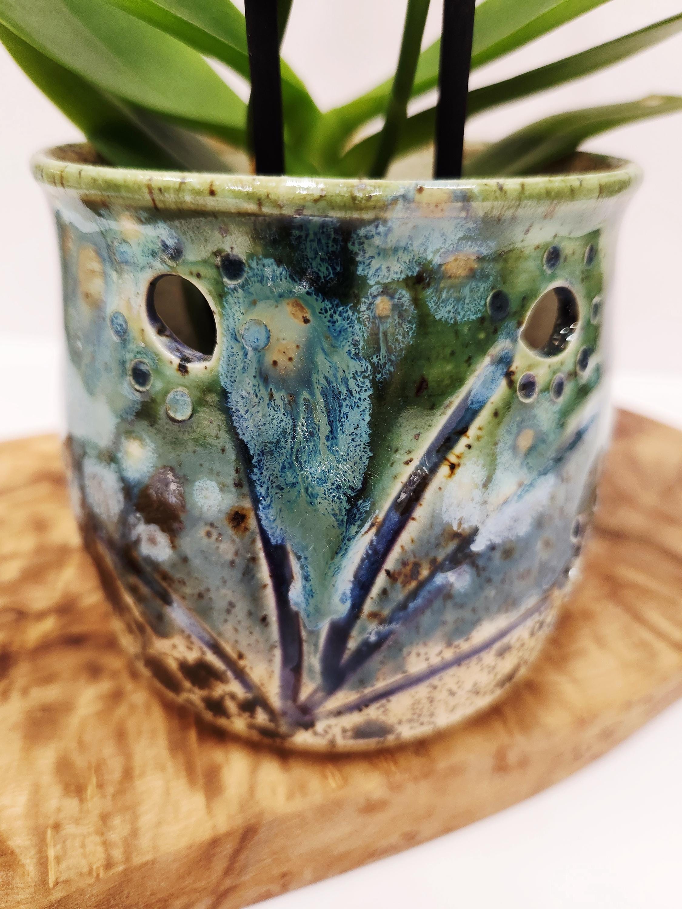 This Orchid planter is made from cream speckled clay and finished in shades of olive green, blue, turquoise, lavender and shades of purple. It is hard to capture the beauty of these finishes but promise it won't disappoint you!!