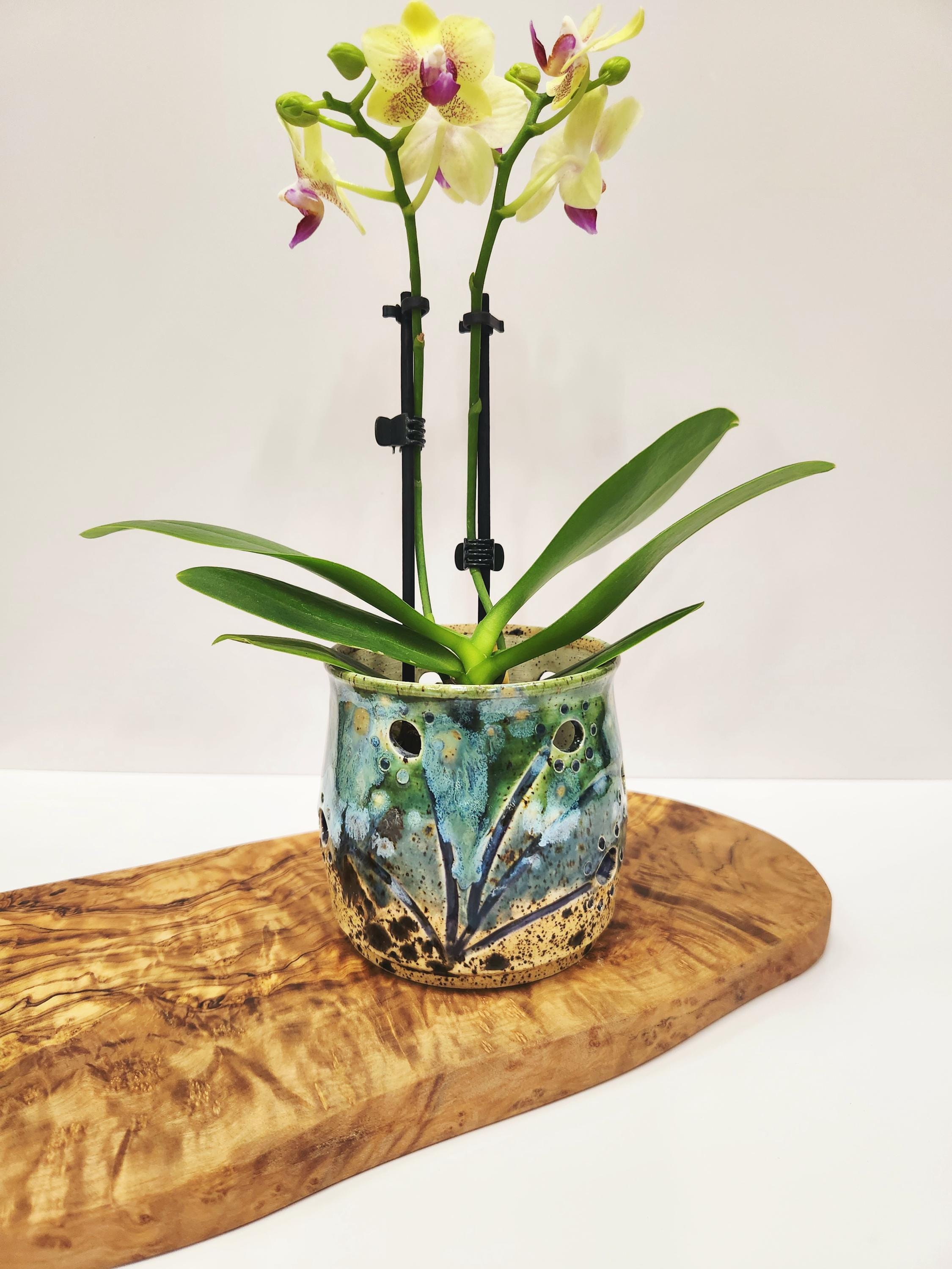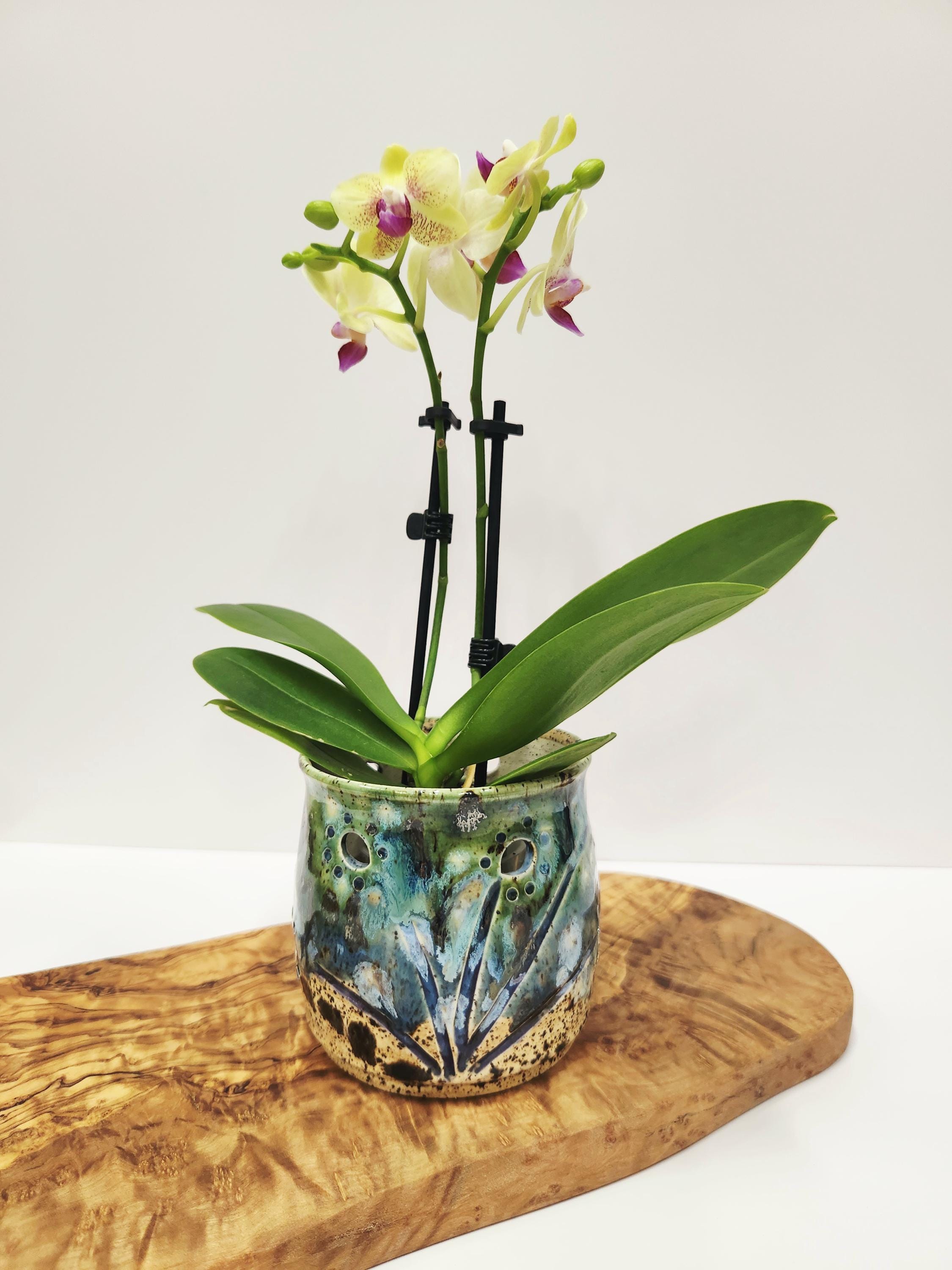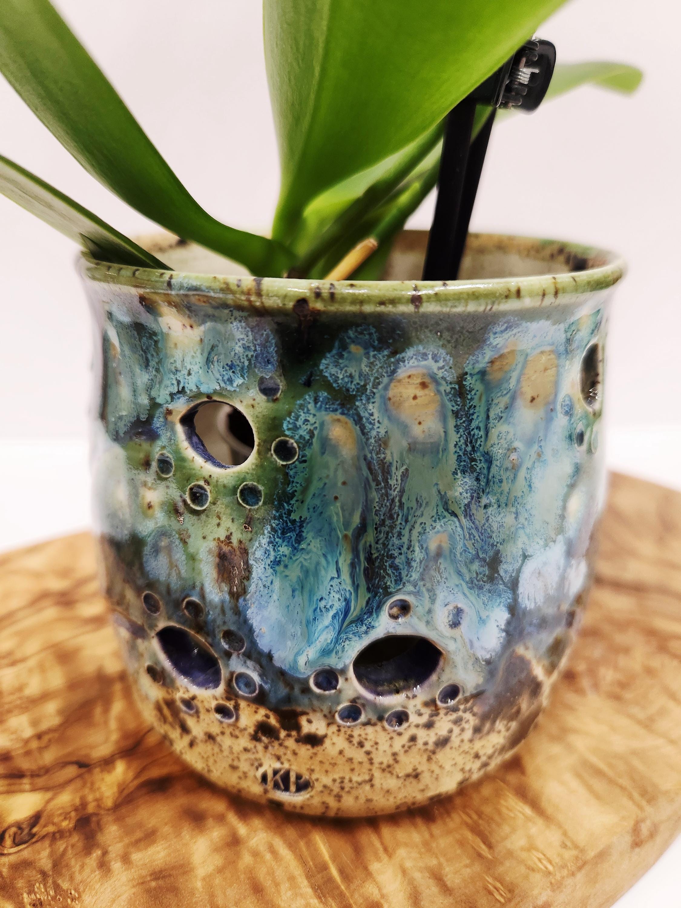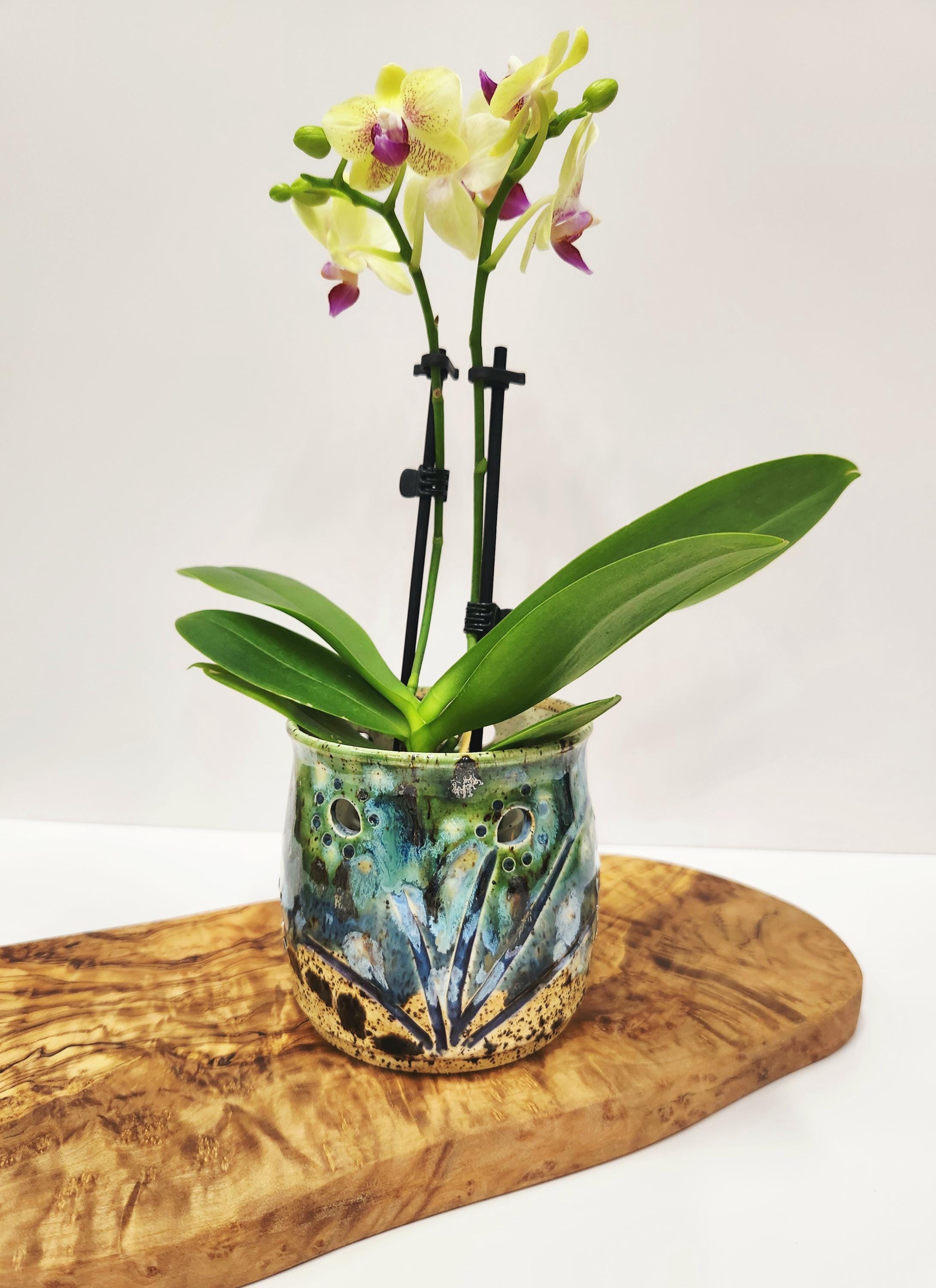 This Orchid planter is made from cream speckled clay and finished in shades of olive green, blue, turquoise, lavender and shades of purple. It is hard to capture the beauty of these finishes but promise it won't disappoint you!!
