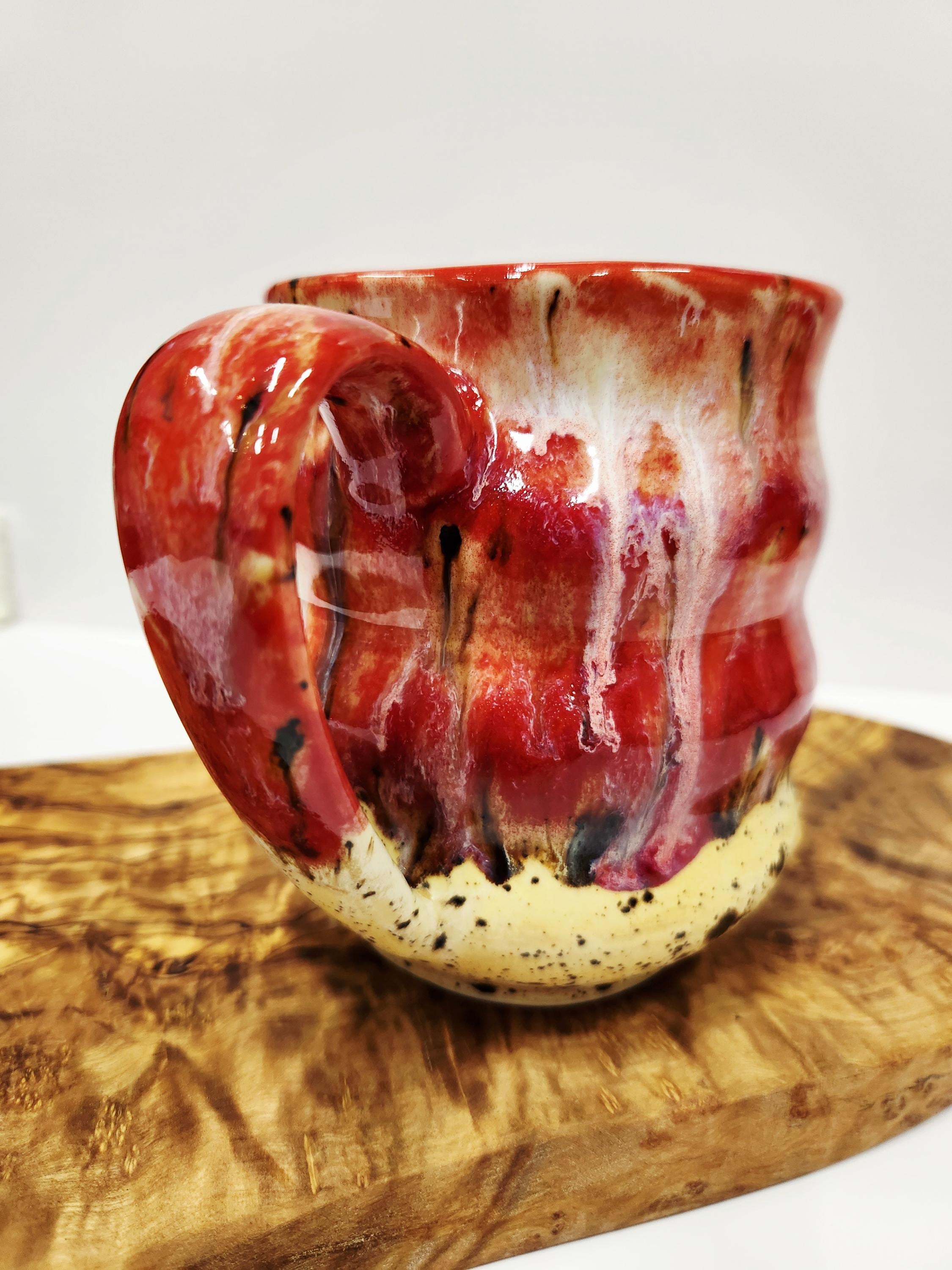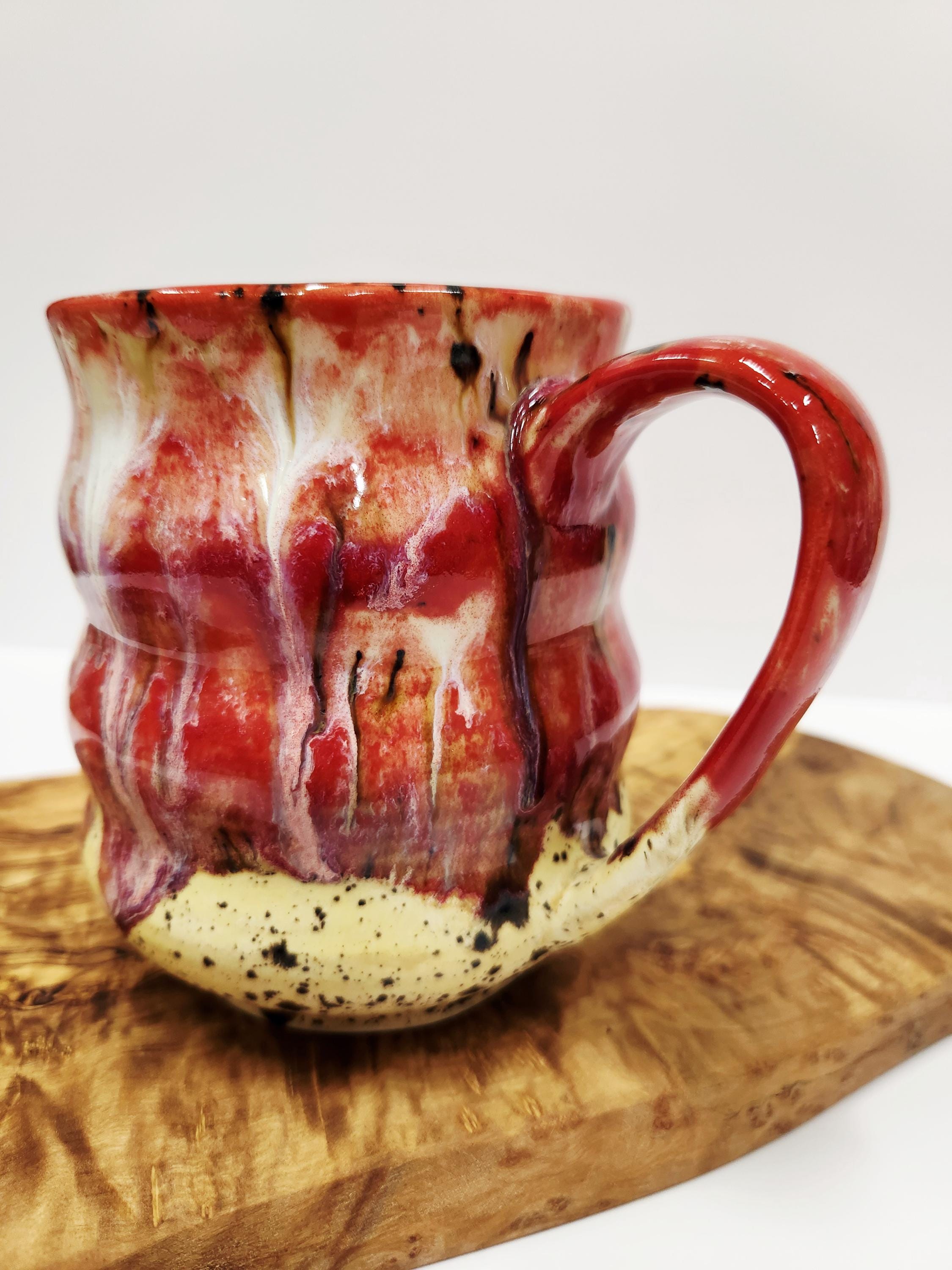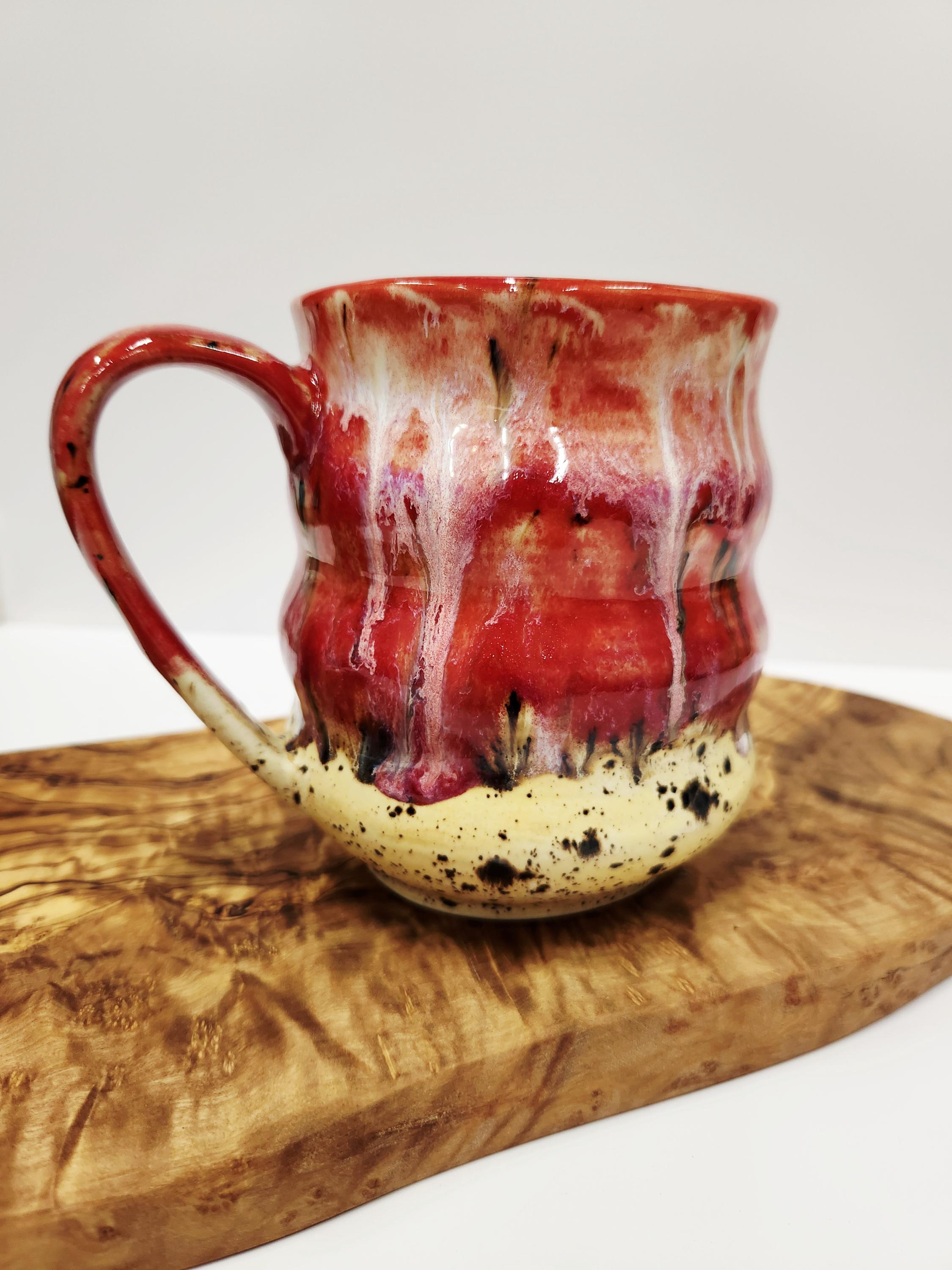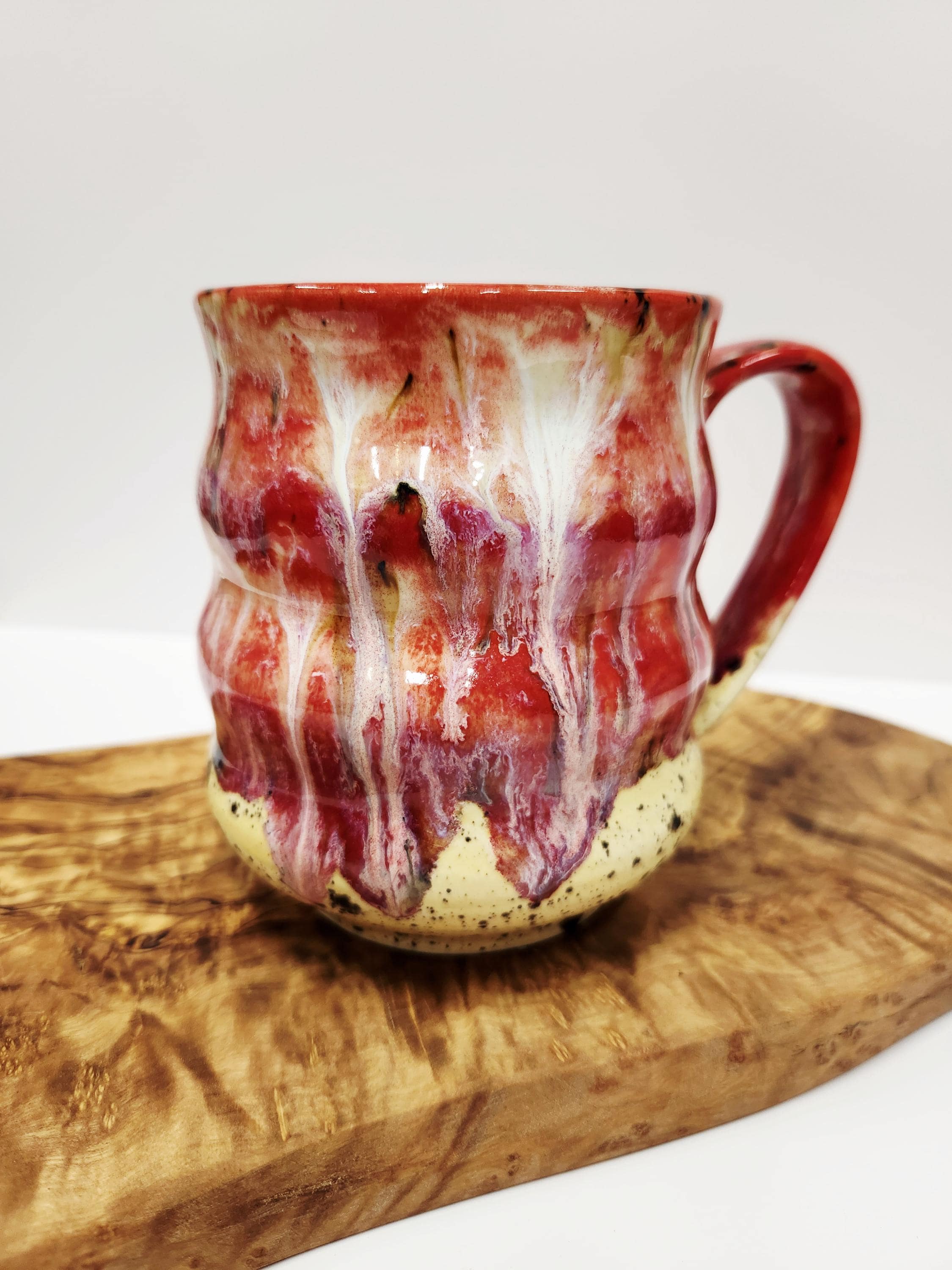 Each of these uniquely crafted ceramic pottery mugs boasts a distinctive drip glaze finish, rendering them truly one of a kind. When I initially embarked on this finishing technique, I've employed six to seven different glazes, gradually increasing the number to nine. Presently, I utilize a range of eleven to thirteen distinct colors and types of glazes for each mug, using various application techniques. These mugs consistently exceed expectations and promise they won't disappoint.