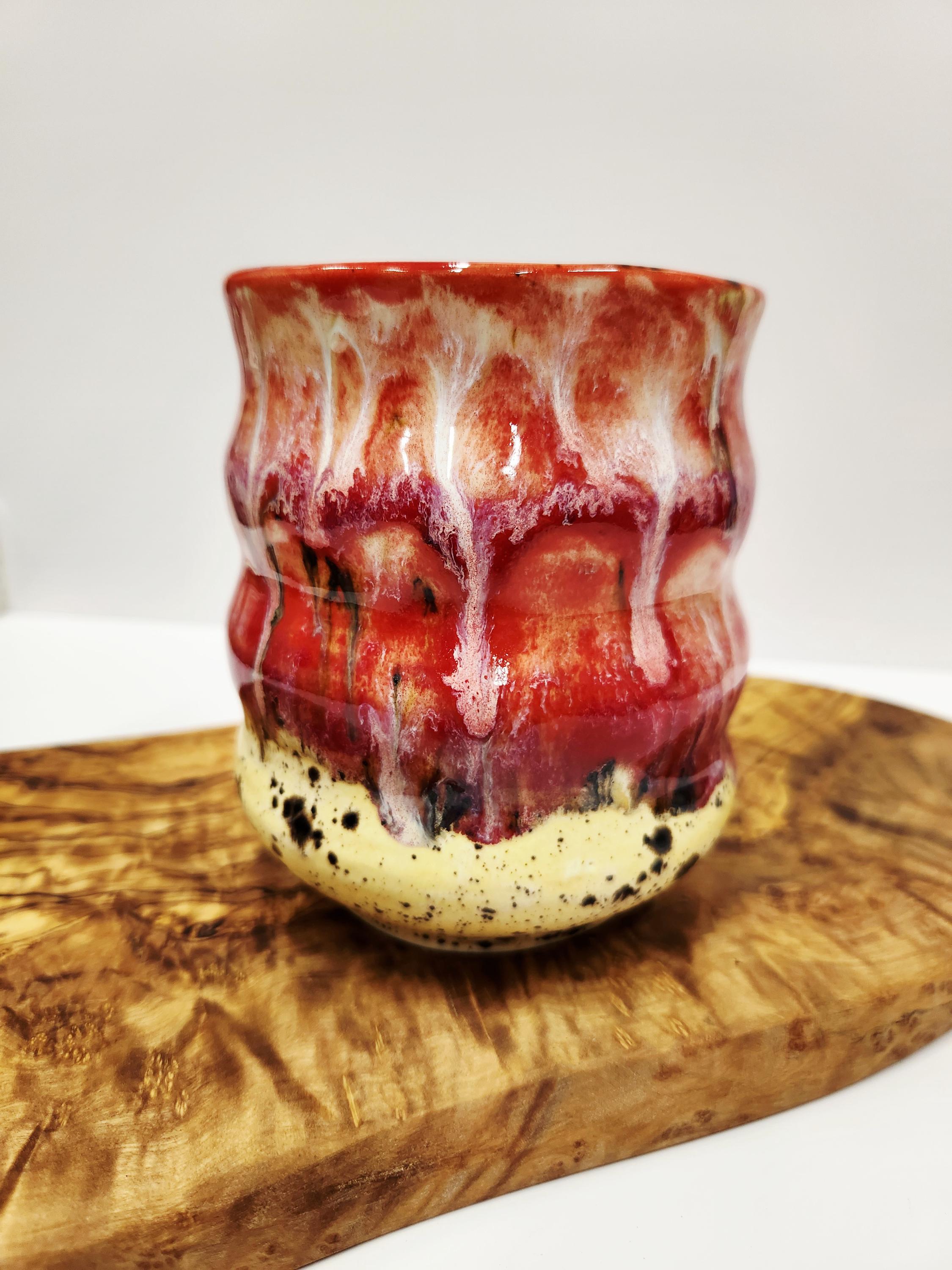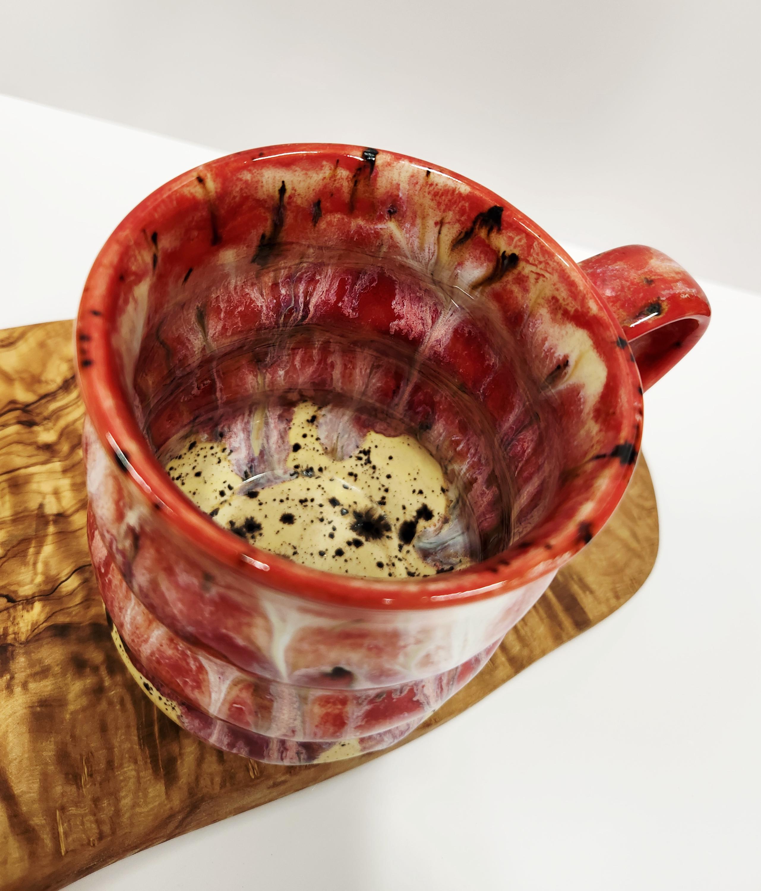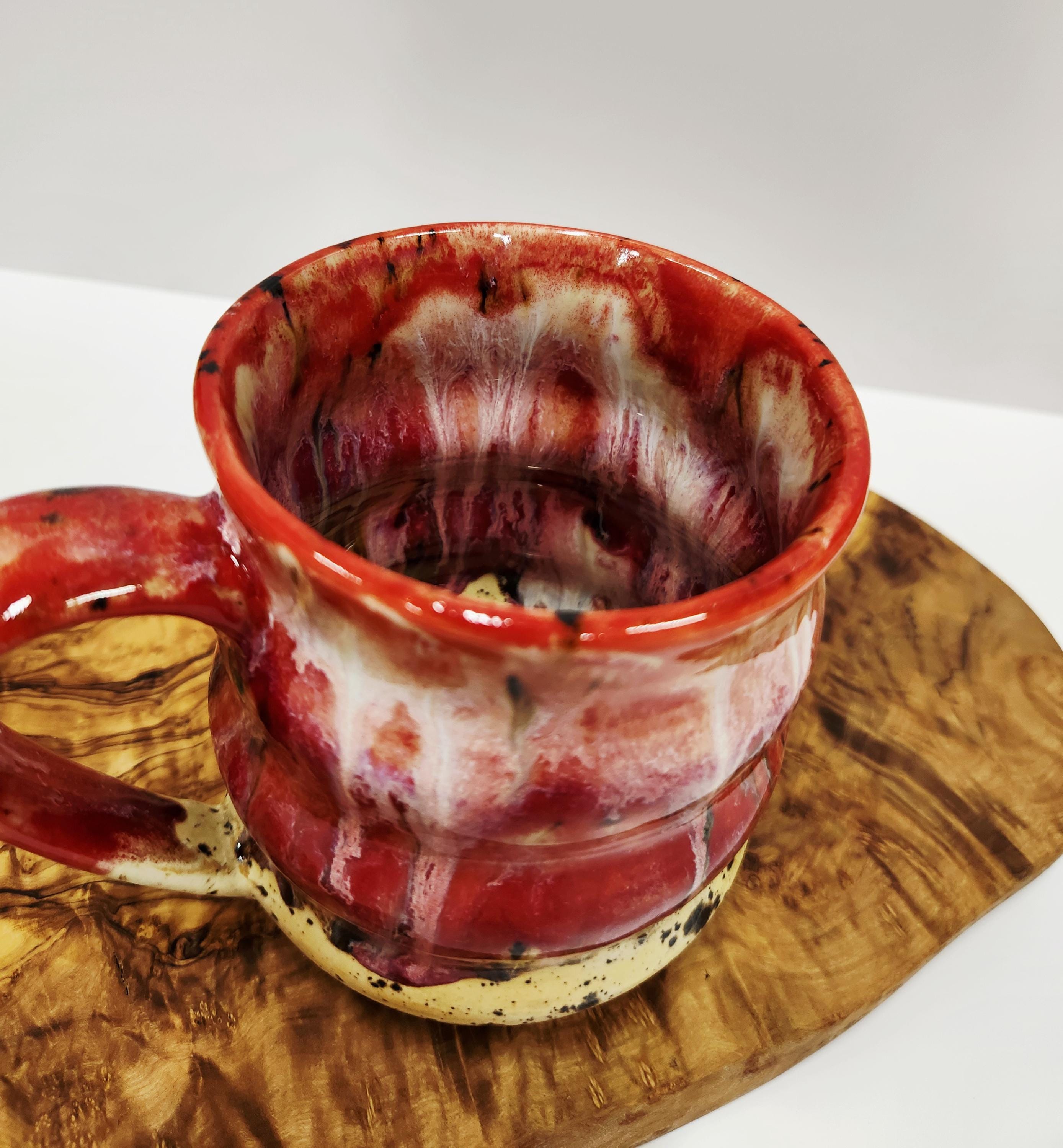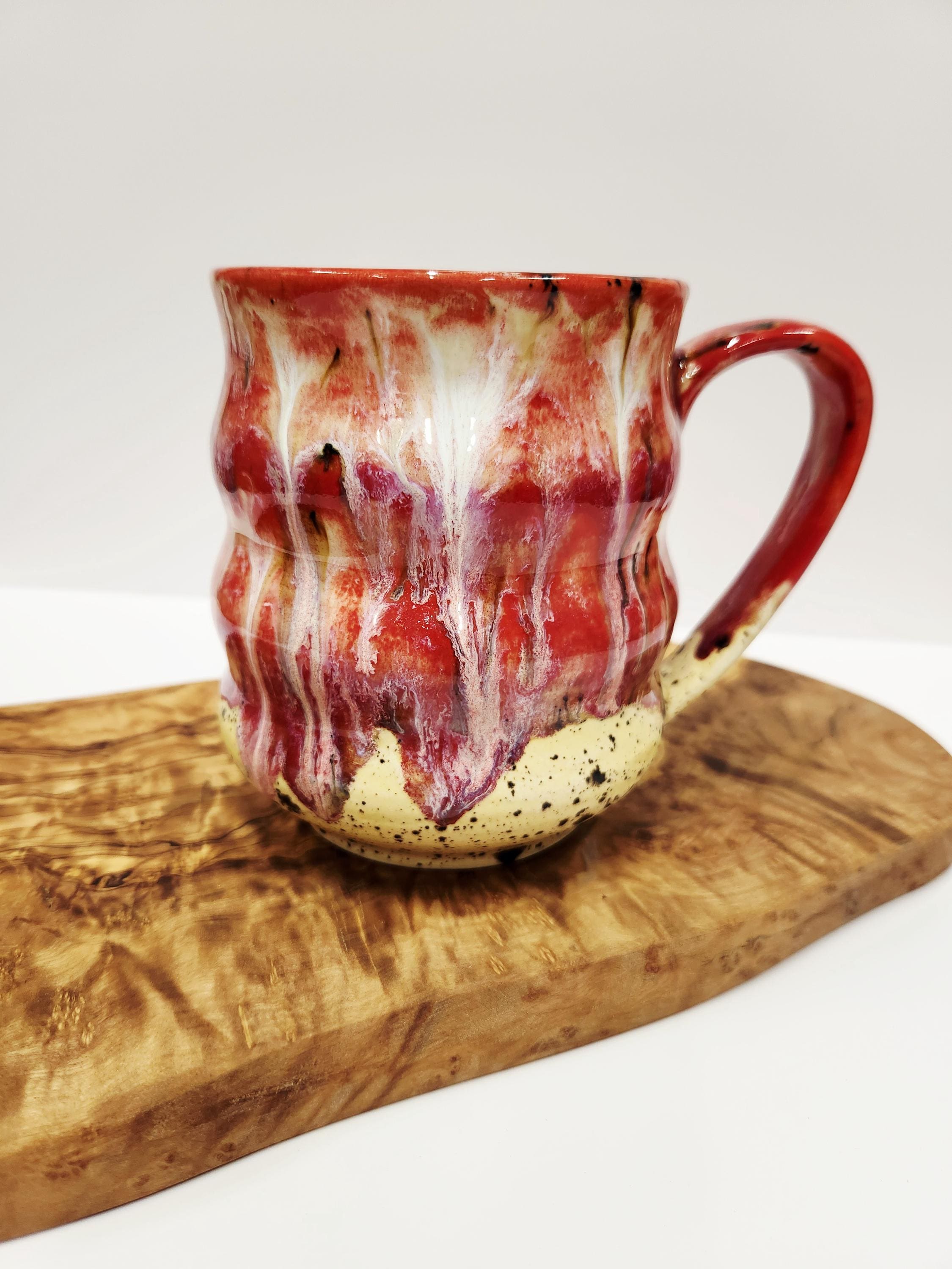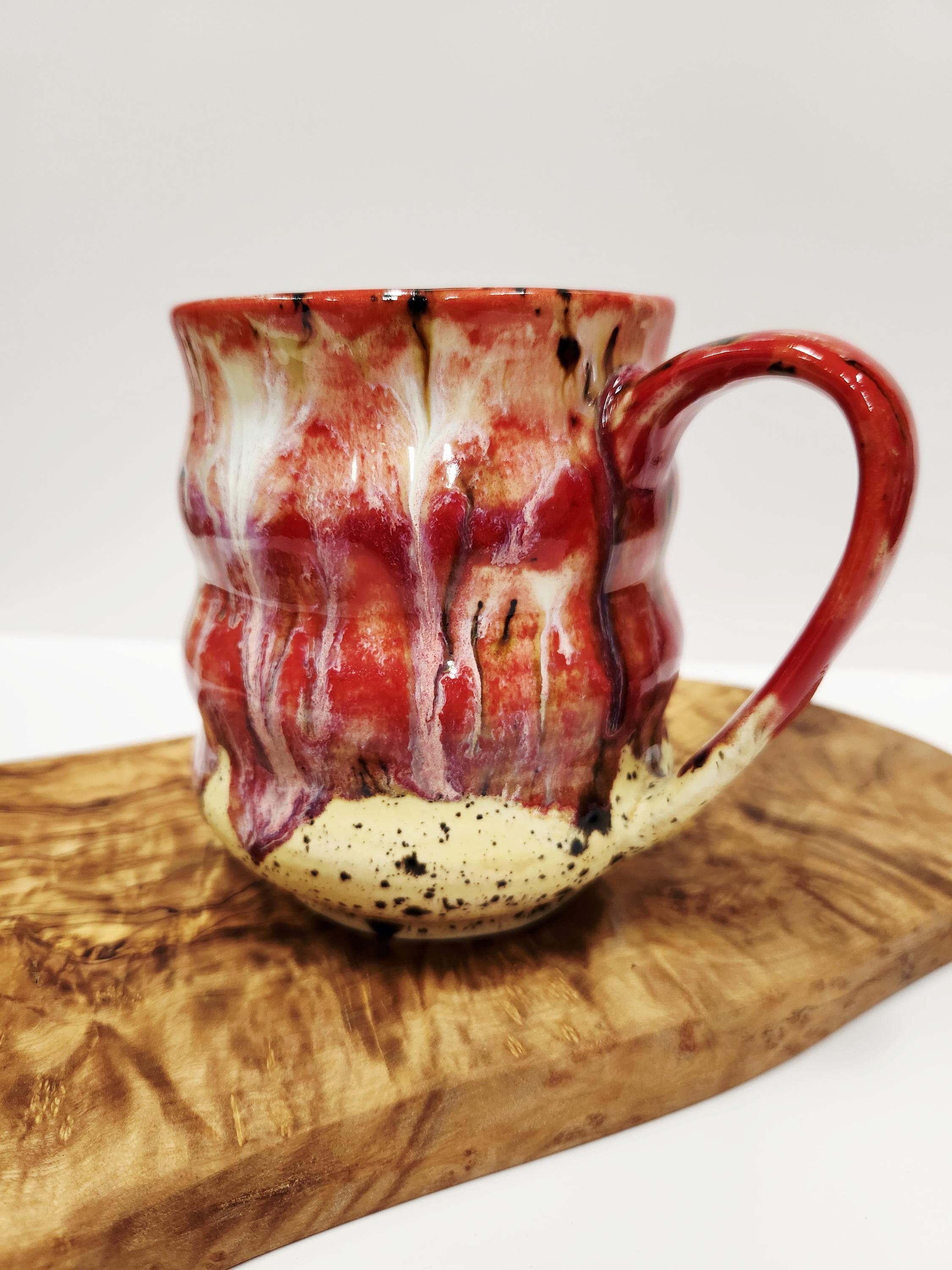 Each of these uniquely crafted ceramic pottery mugs boasts a distinctive drip glaze finish, rendering them truly one of a kind. When I initially embarked on this finishing technique, I've employed six to seven different glazes, gradually increasing the number to nine. Presently, I utilize a range of eleven to thirteen distinct colors and types of glazes for each mug, using various application techniques. These mugs consistently exceed expectations and promise they won't disappoint.