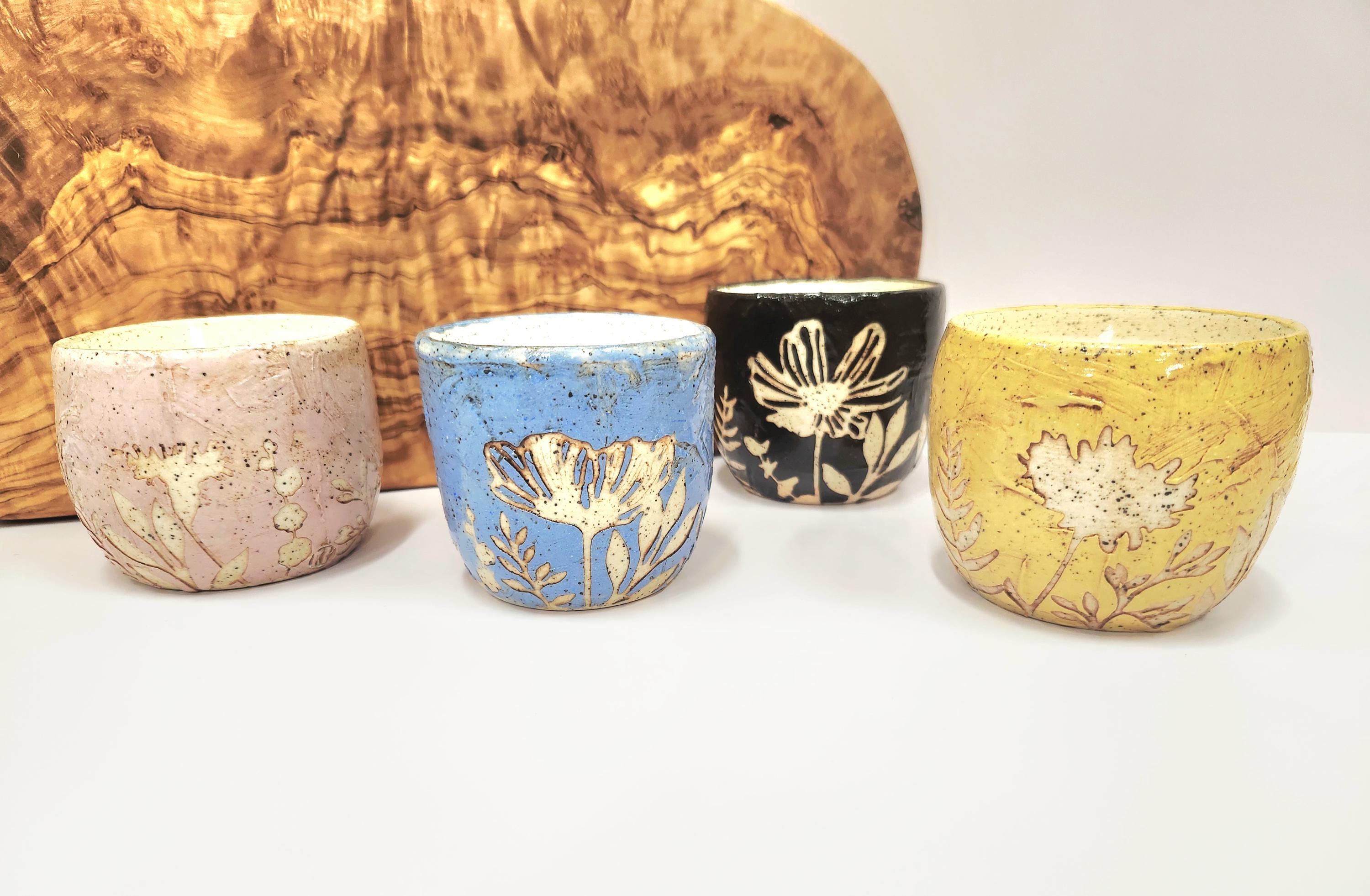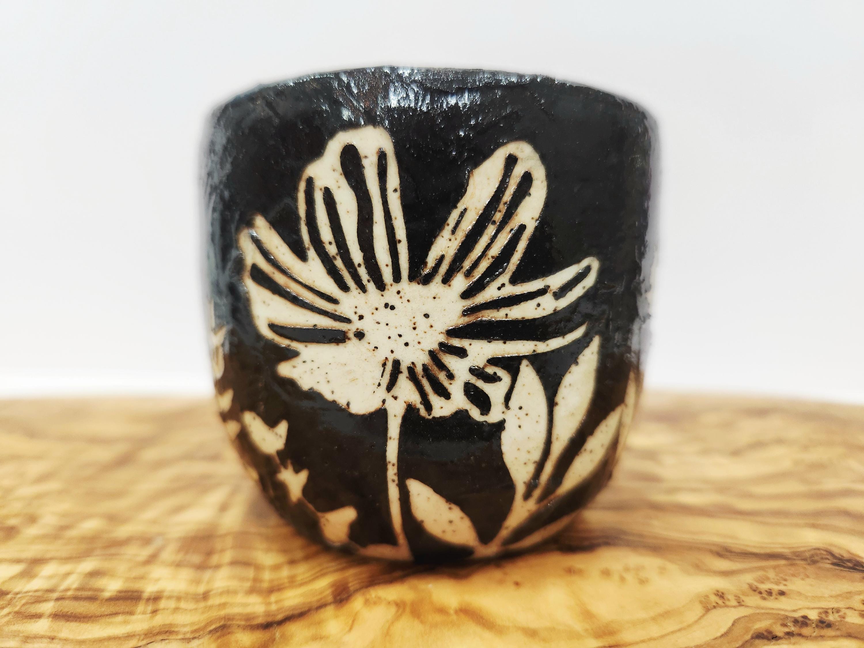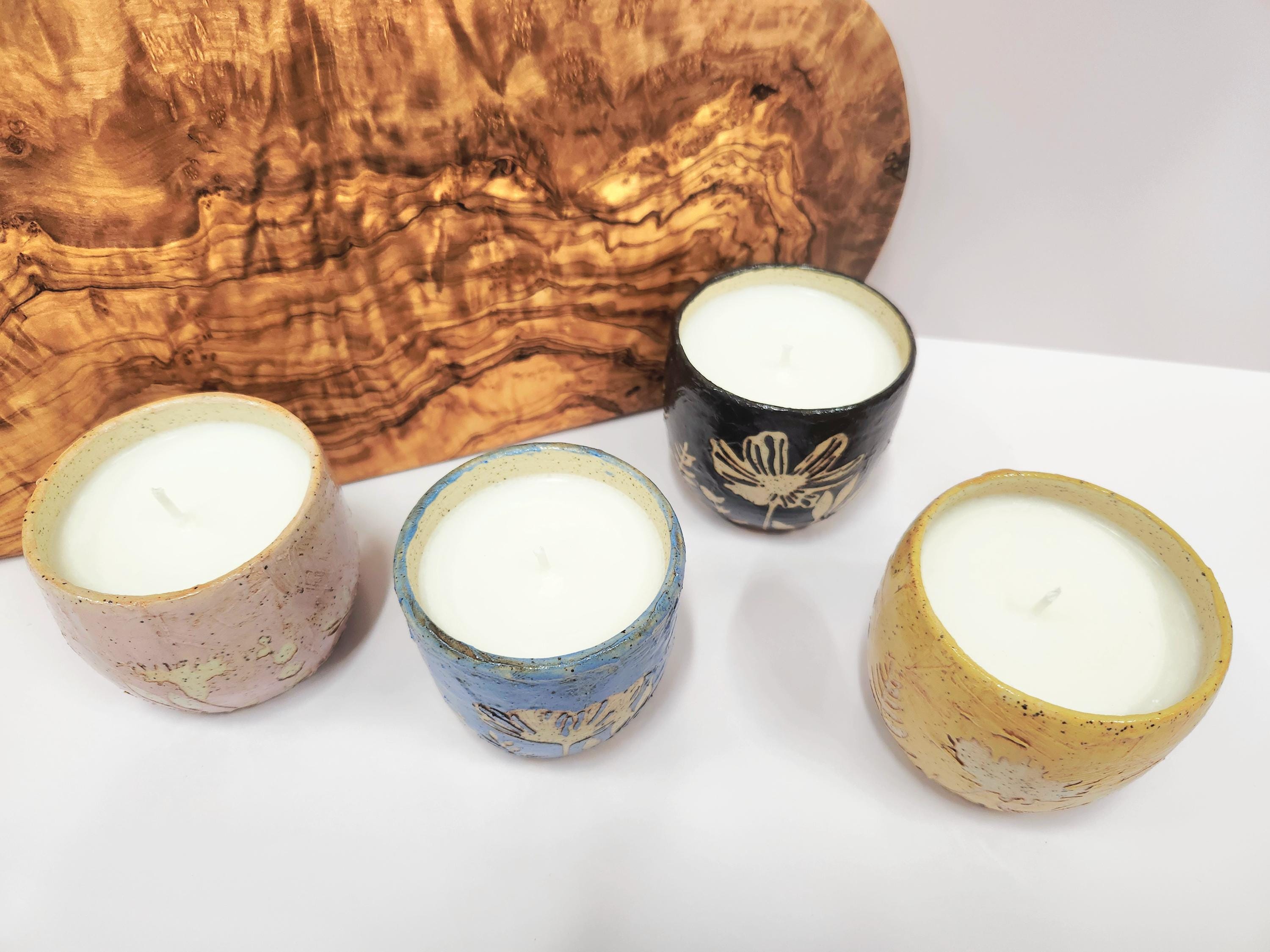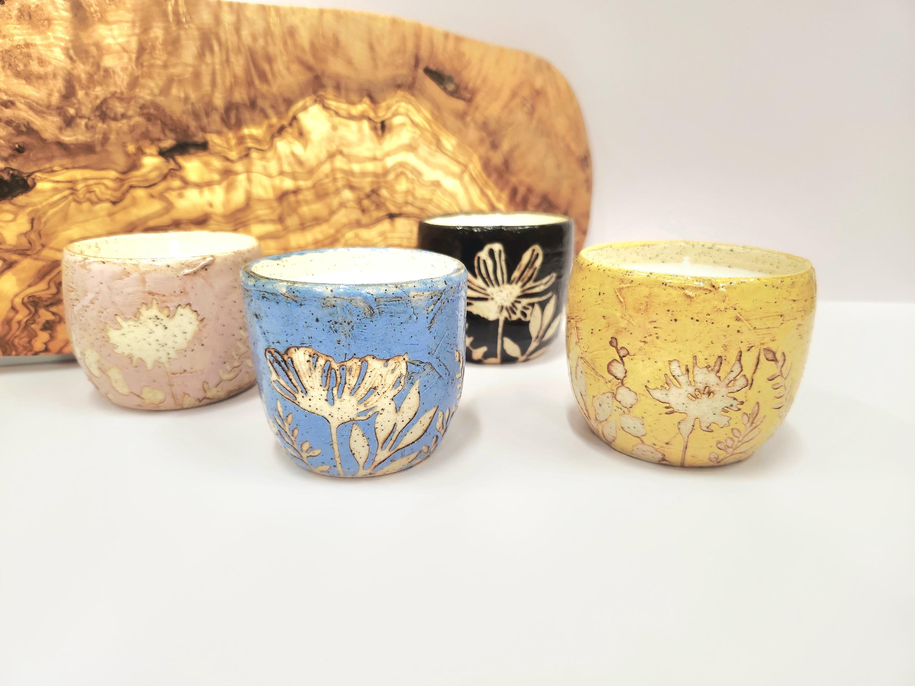 Each of these candles has a unique, organic feel and appearance. It's made from cream speckled clay each with a different colored slip that has been highlighted with a red-brown wash to enhance the brush strokes and stencils. Each candle could be used later as a small succulent planter when finished. Please note there is no drainage hole.