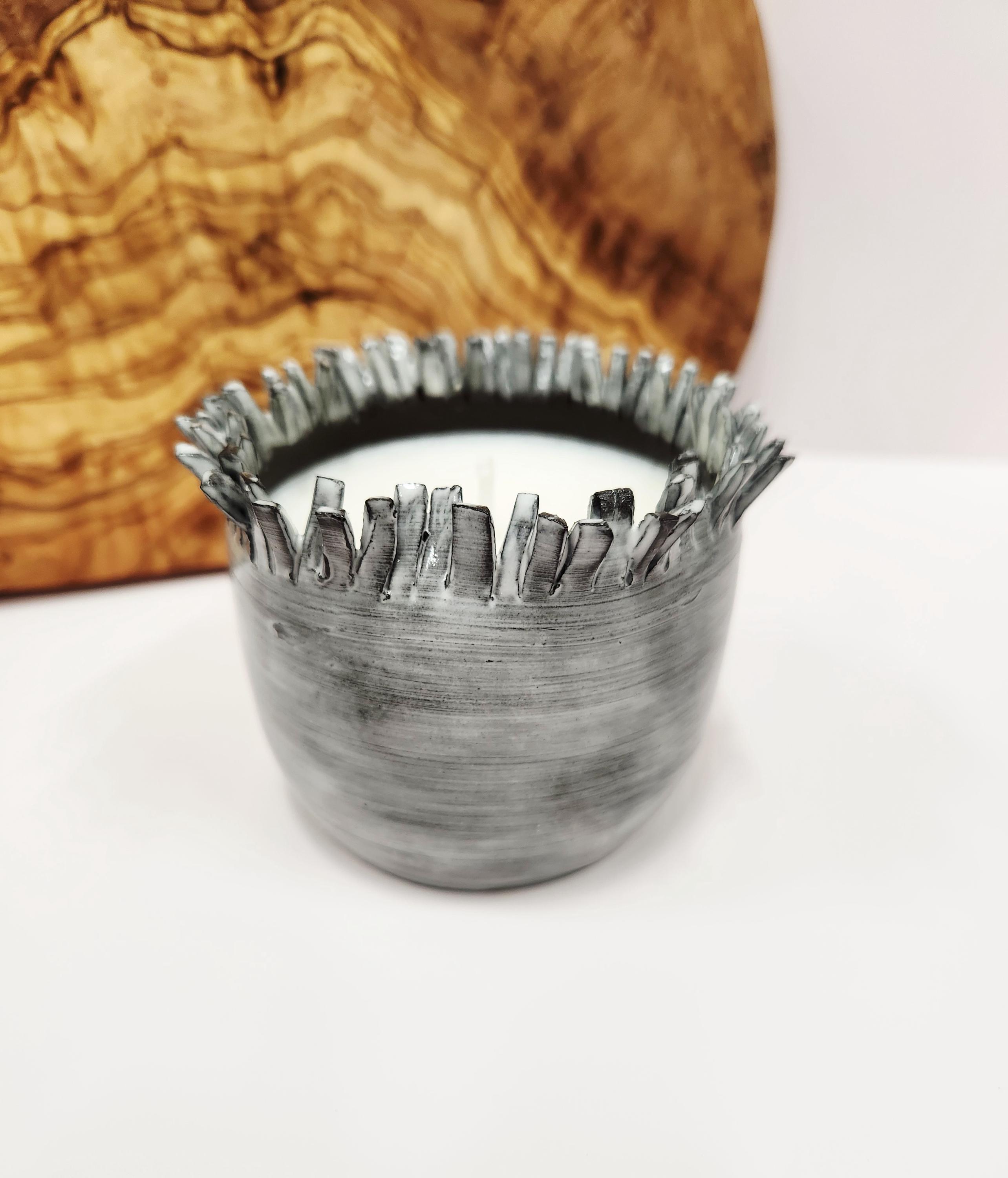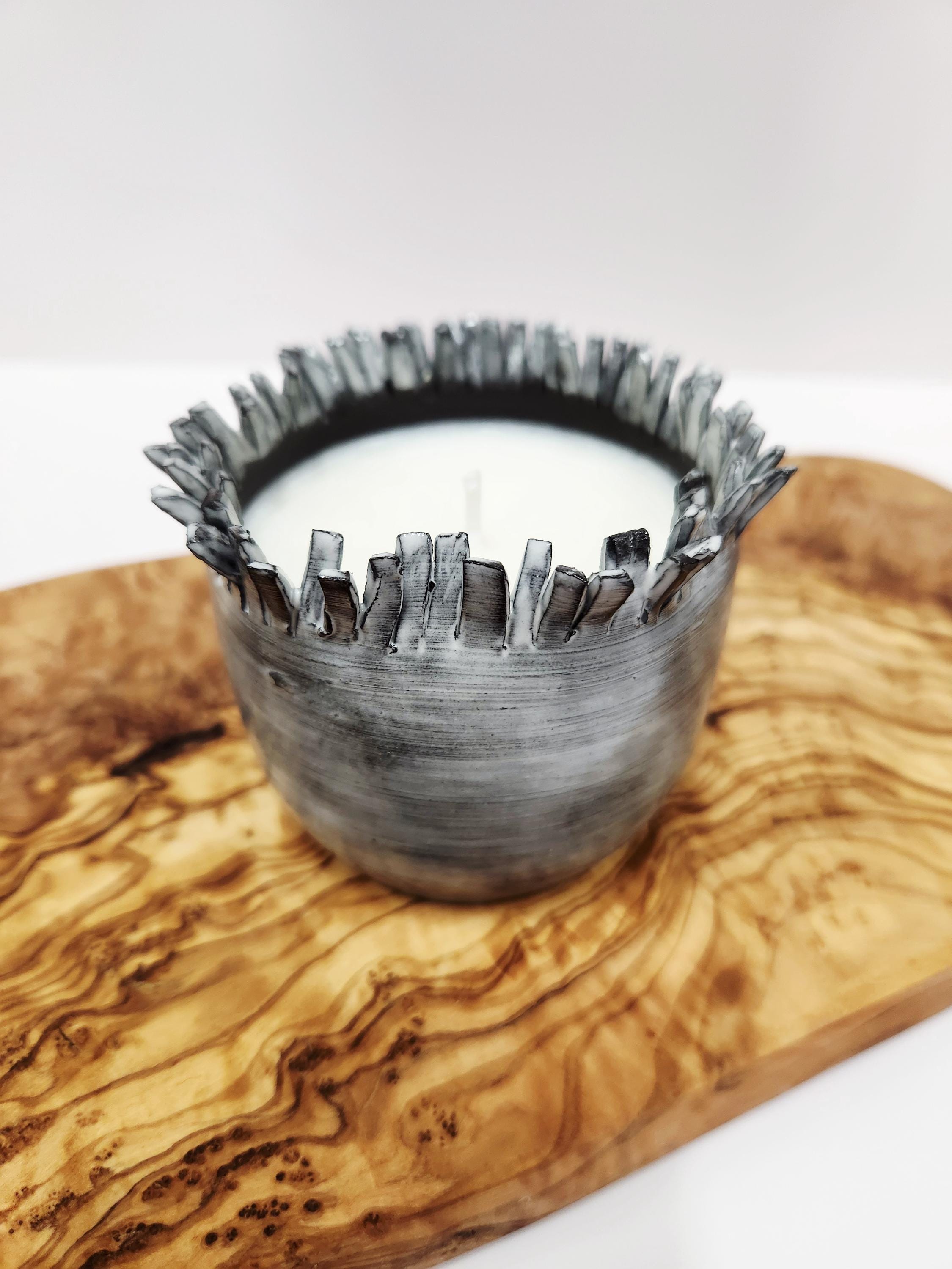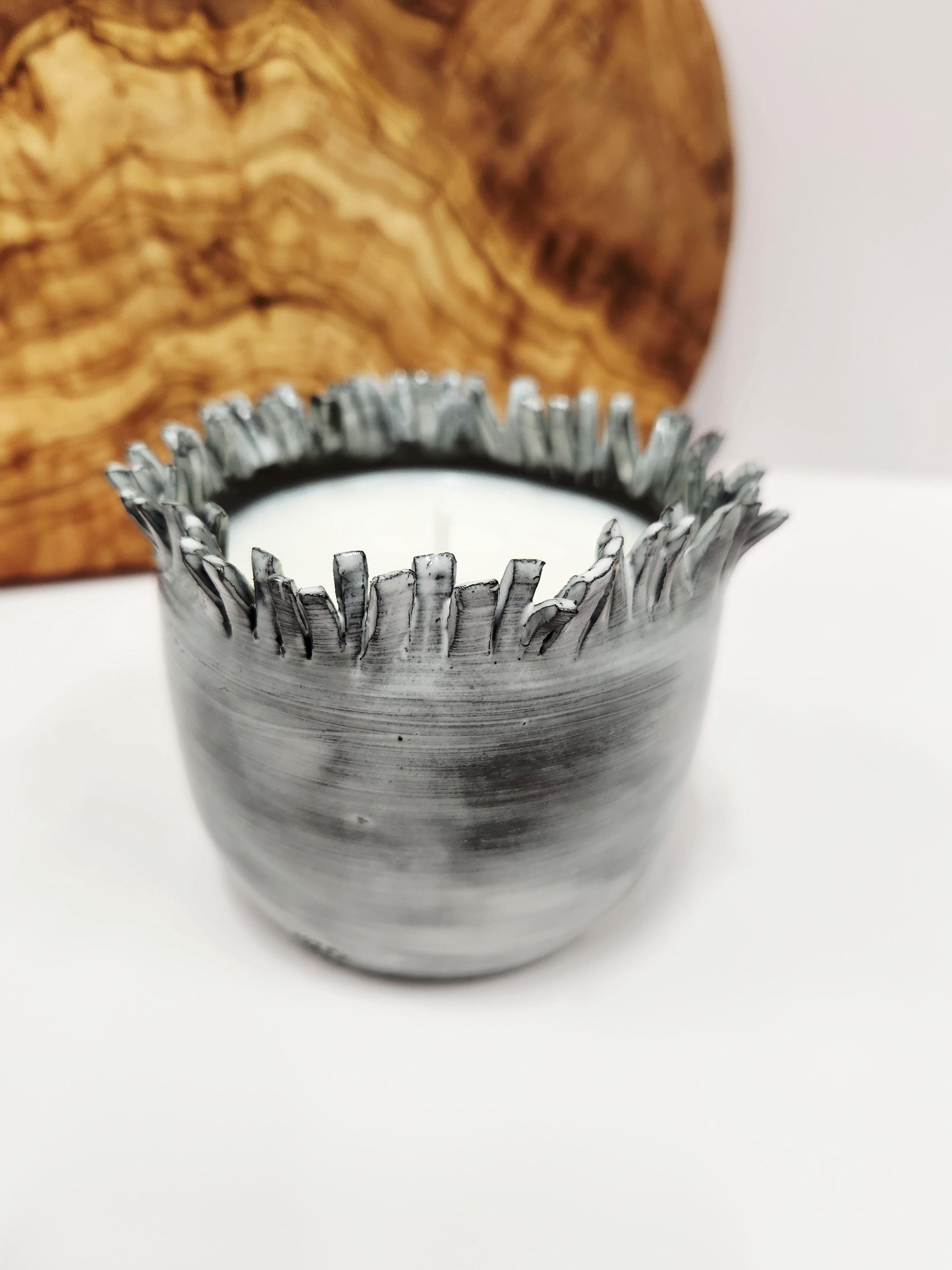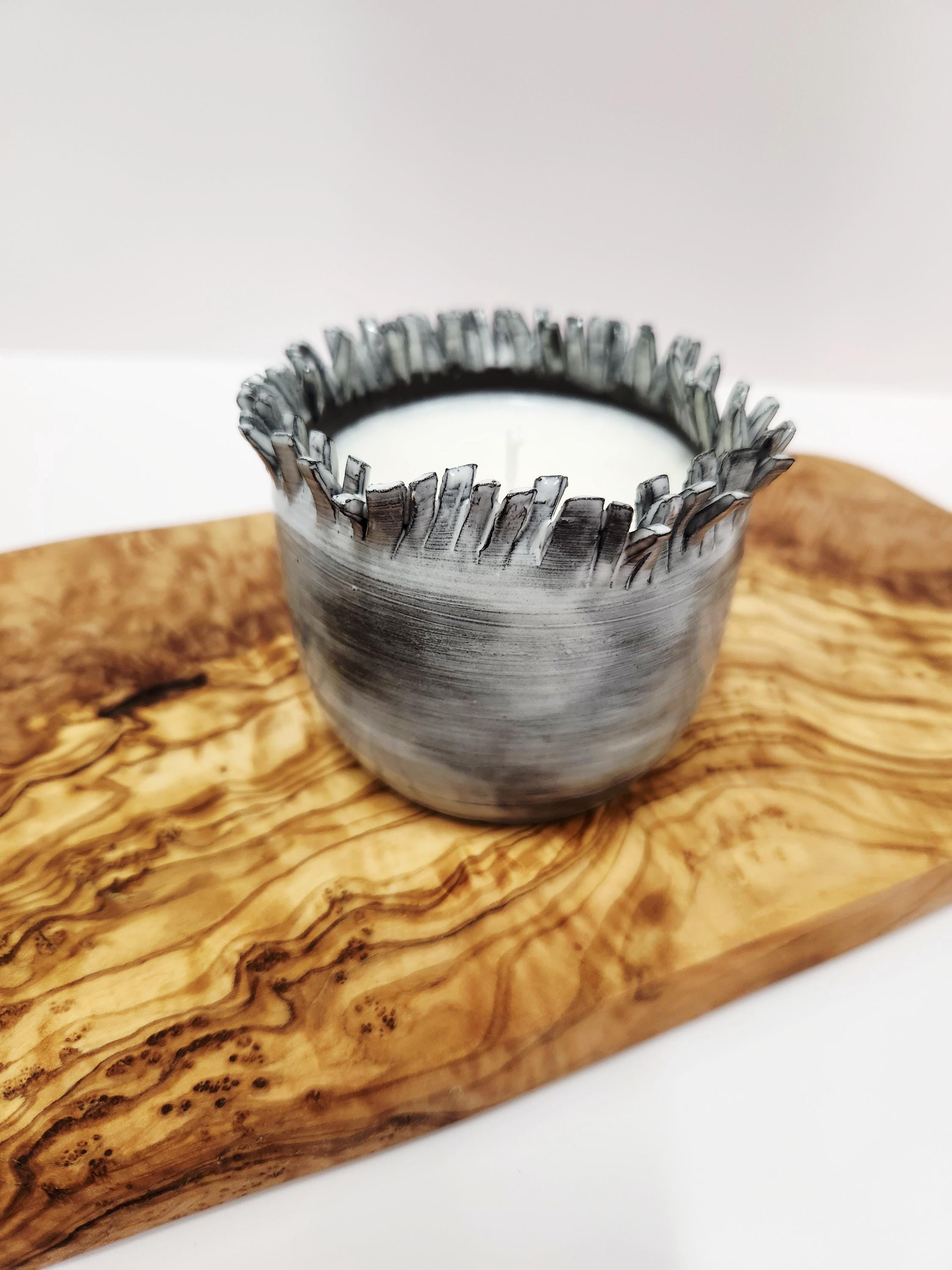 This candle is made from chocolate Brown Clay and highlighted with a glossy white finish. This candle could be used later as a small succulent planter when finished. Please note there is no drainage hole. Measures 2.75" tall and 3.5" wide.