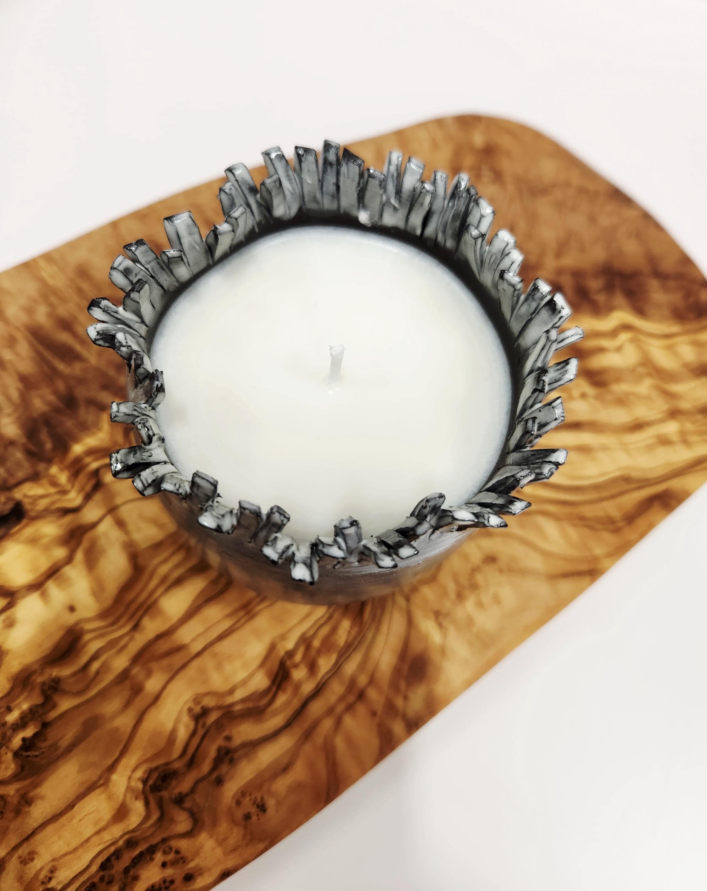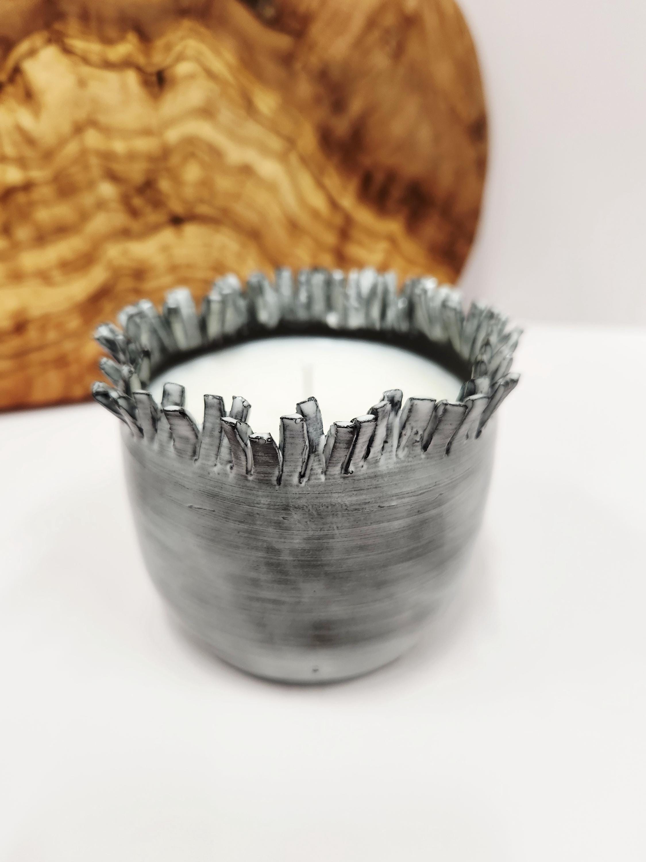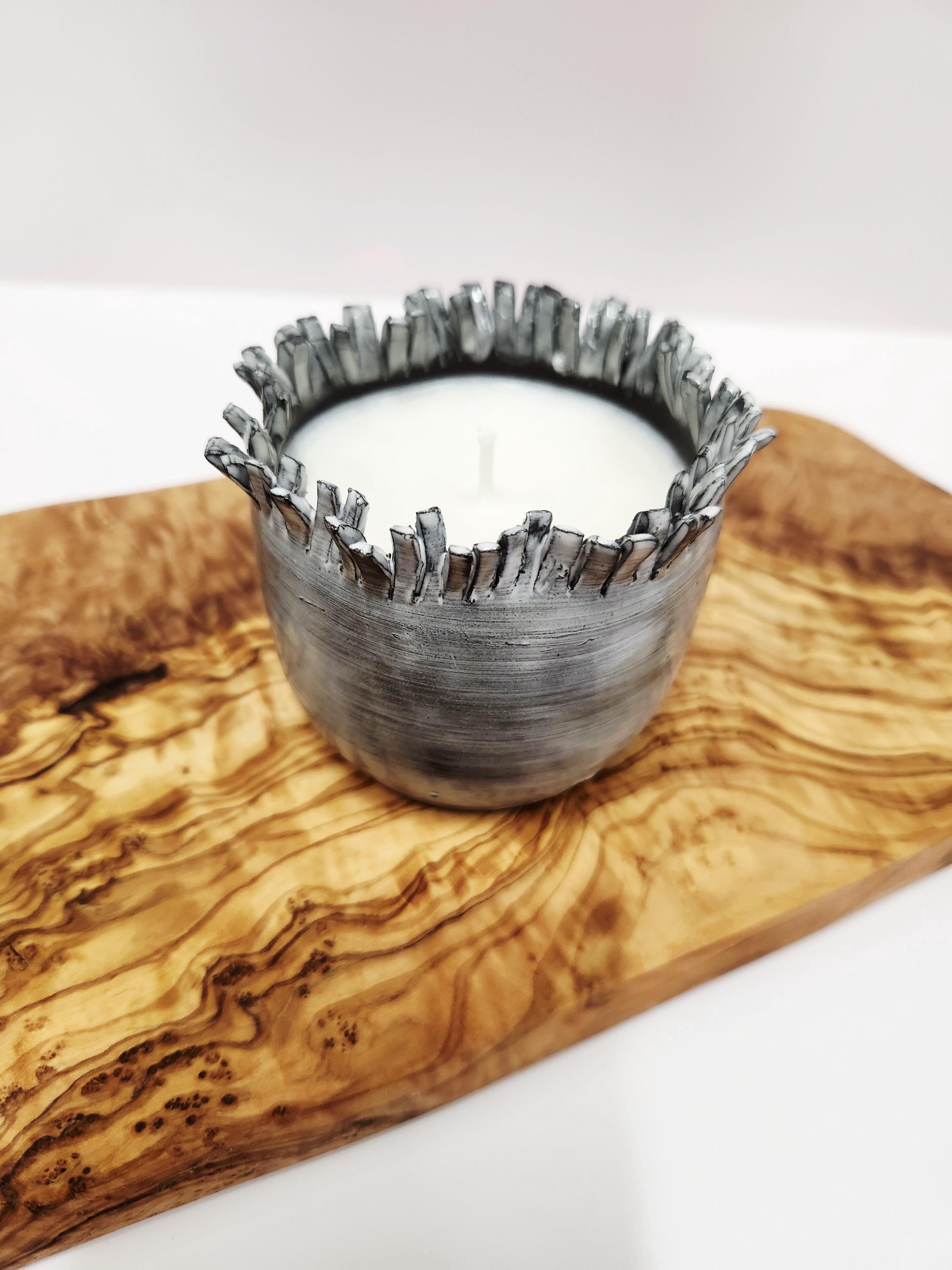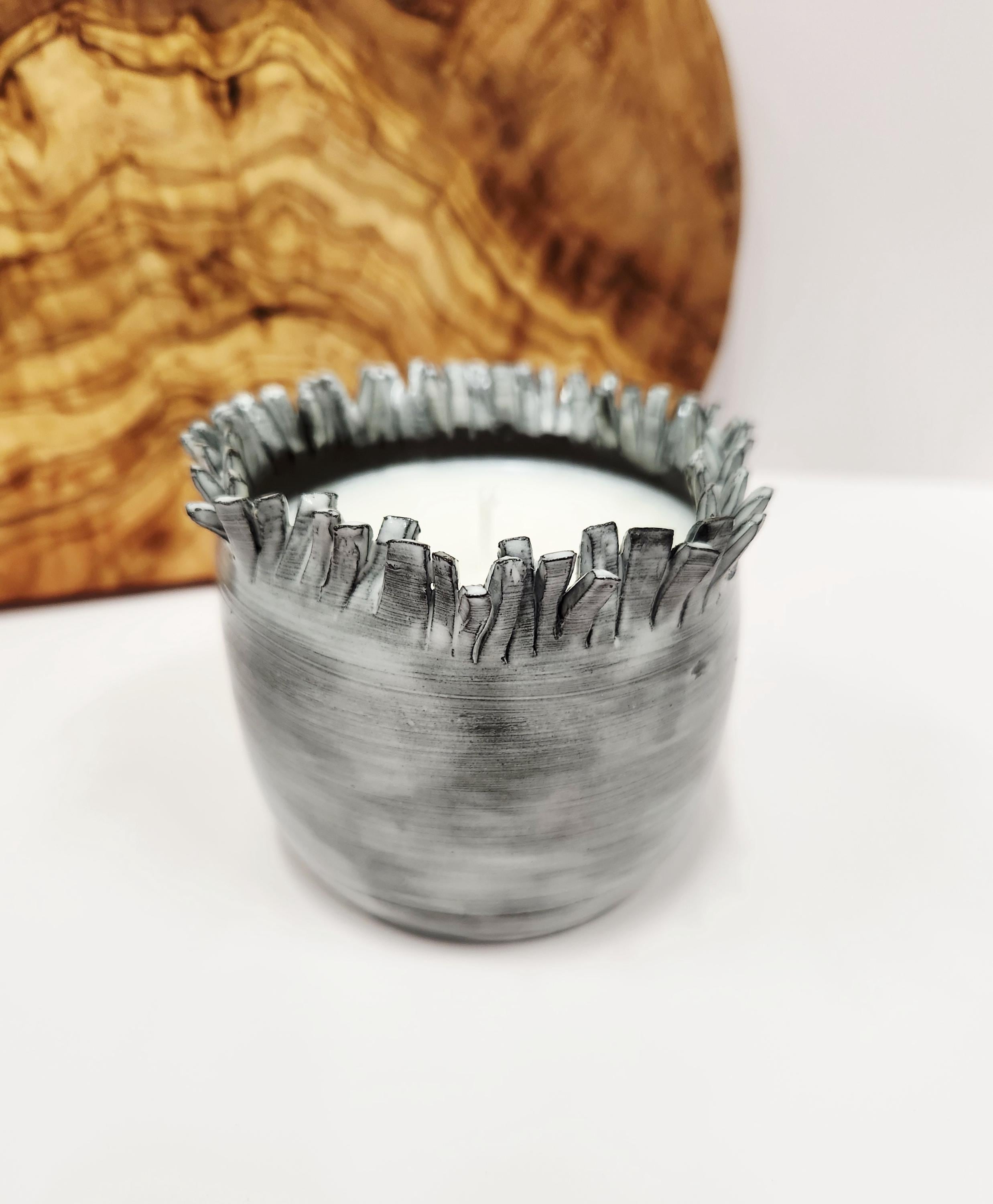 This candle is made from chocolate Brown Clay and highlighted with a glossy white finish. This candle could be used later as a small succulent planter when finished. Please note there is no drainage hole. Measures 2.75" tall and 3.5" wide.