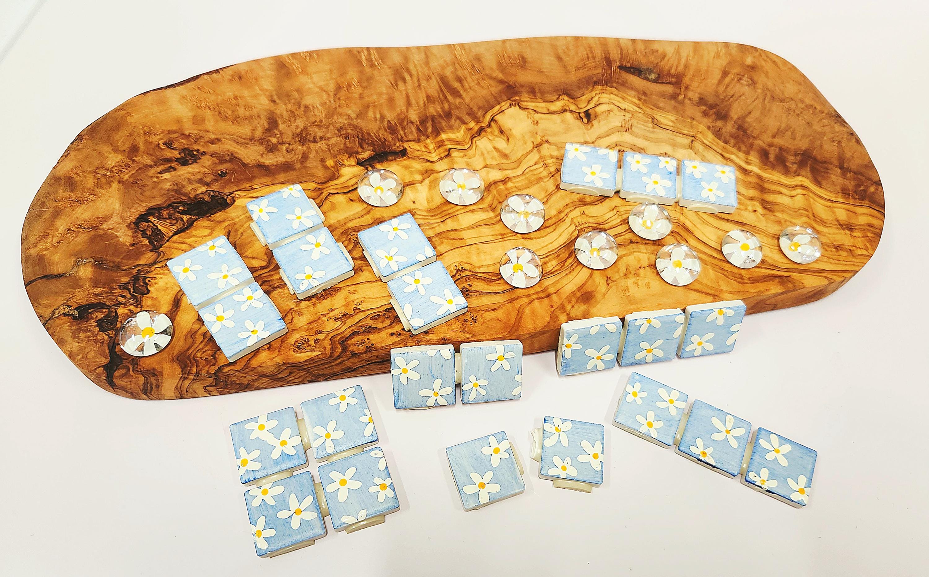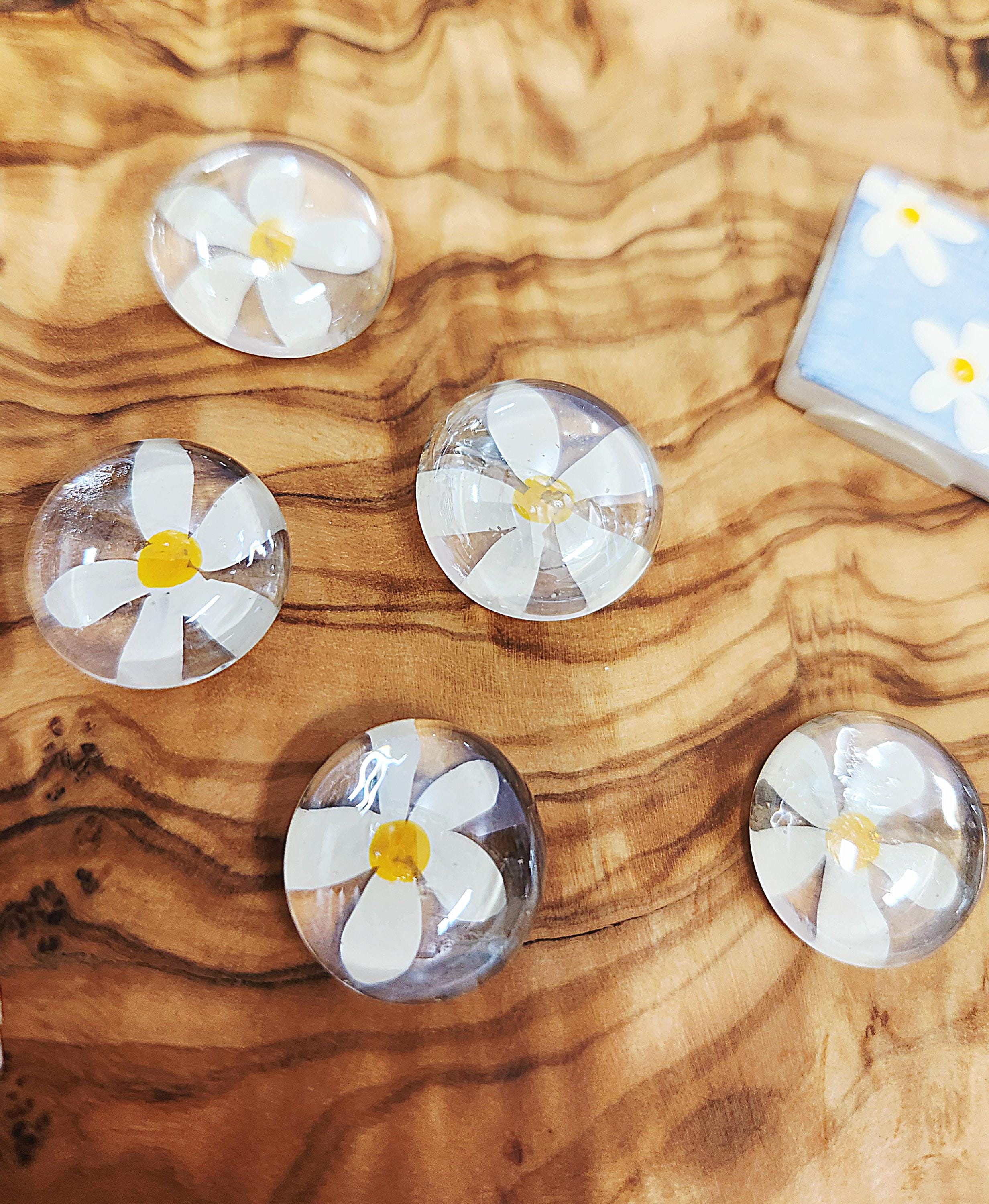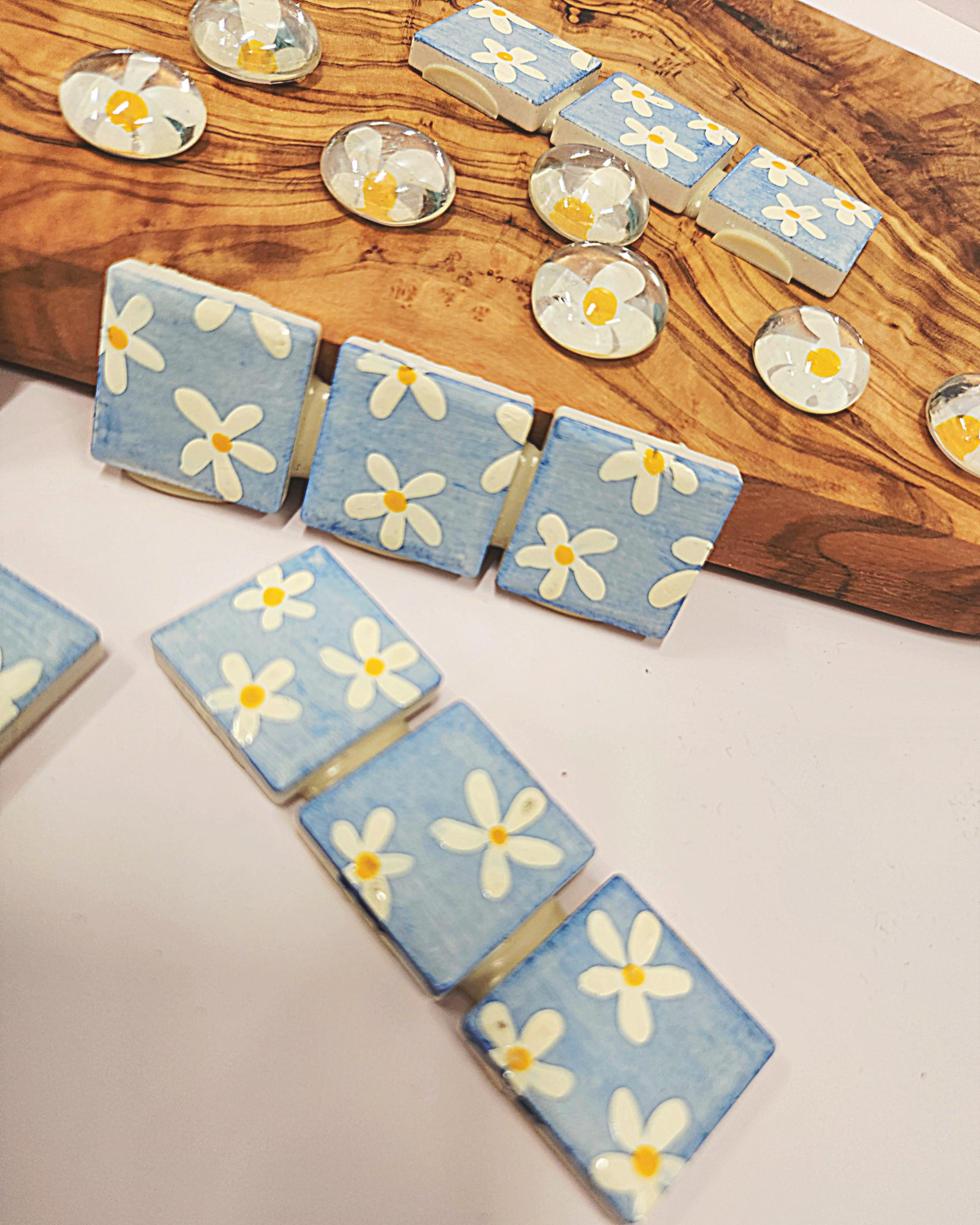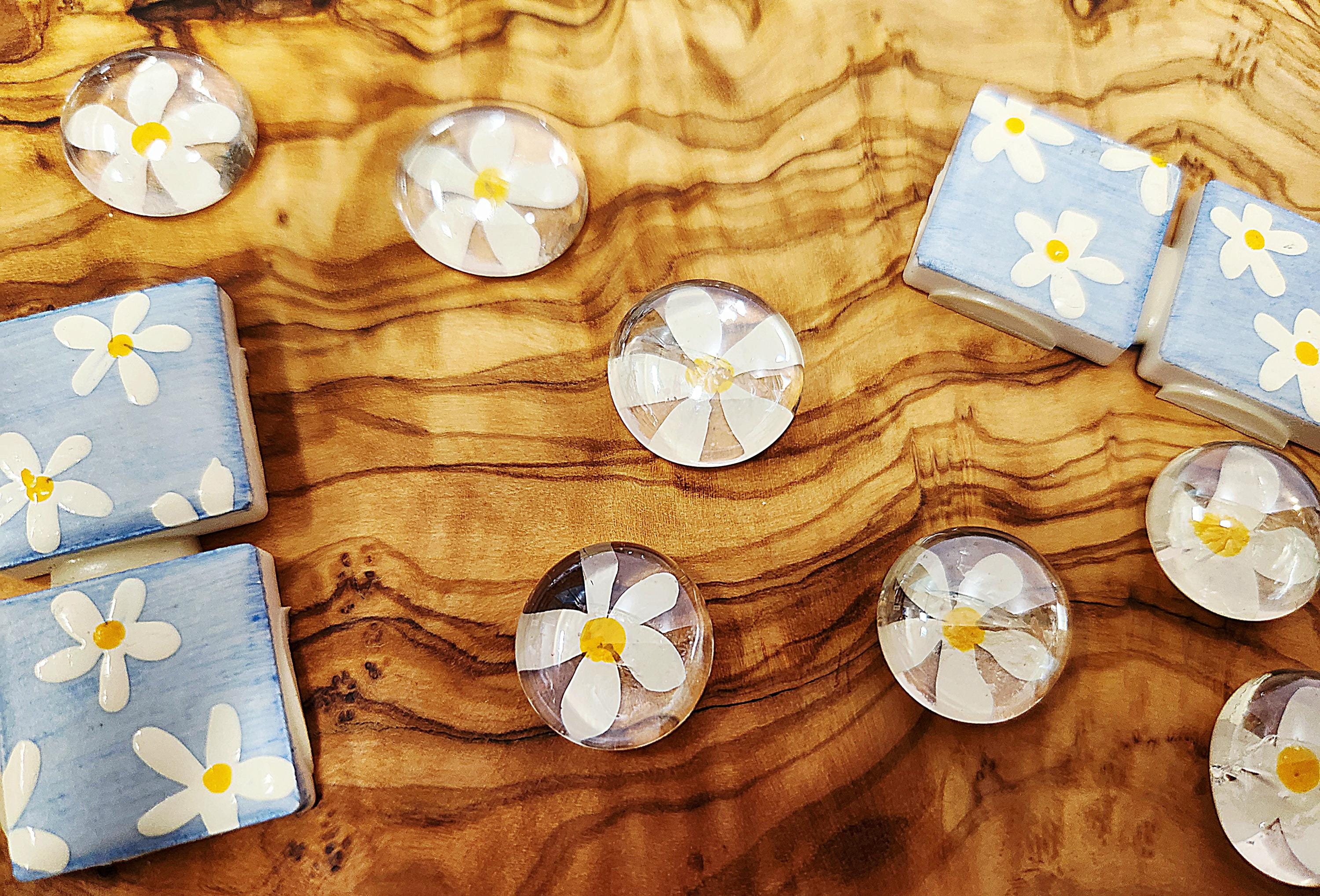 These small floral mosaic tiles would be great for smaller projects such as indoor flowers pots, frames or coasters. Included in this set are 23 hand painted daisy flowers measuring approximately 1" each. Also included, are 10 clear glass flat bottom beads that have the same daisy pattern measure approximately 1/2" in size. These tiles and glass beads were purchased commercially. The floral pattern is hand painted on each tile and glass bead. I do not recommend these to be used on projects that are intended to be outside as this could fade or affect the paint. These are the remnants of what was used for a picture frame project.