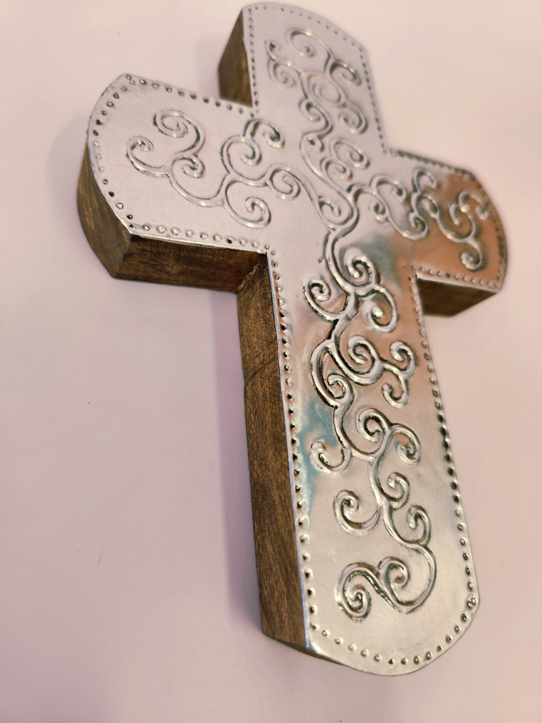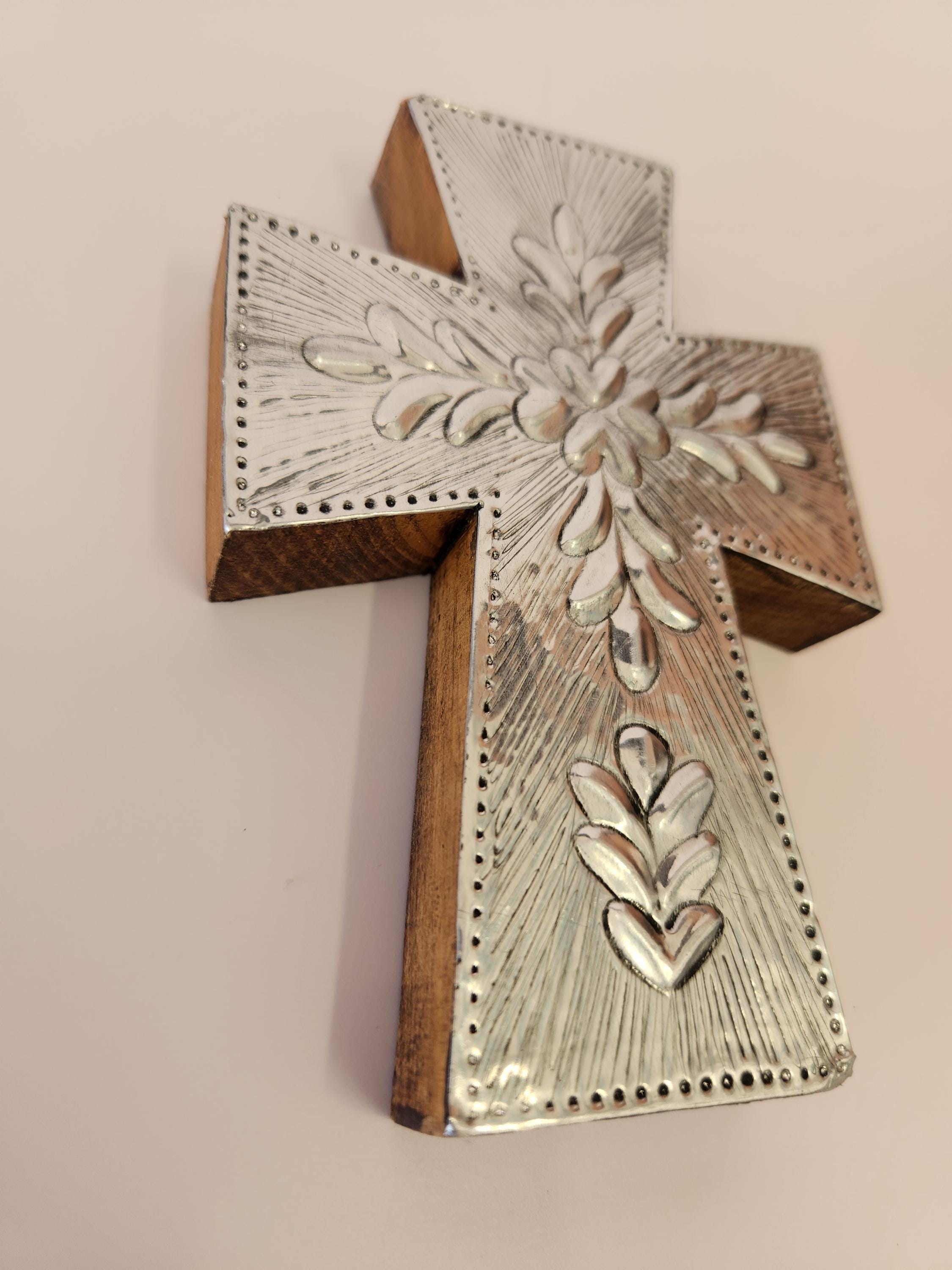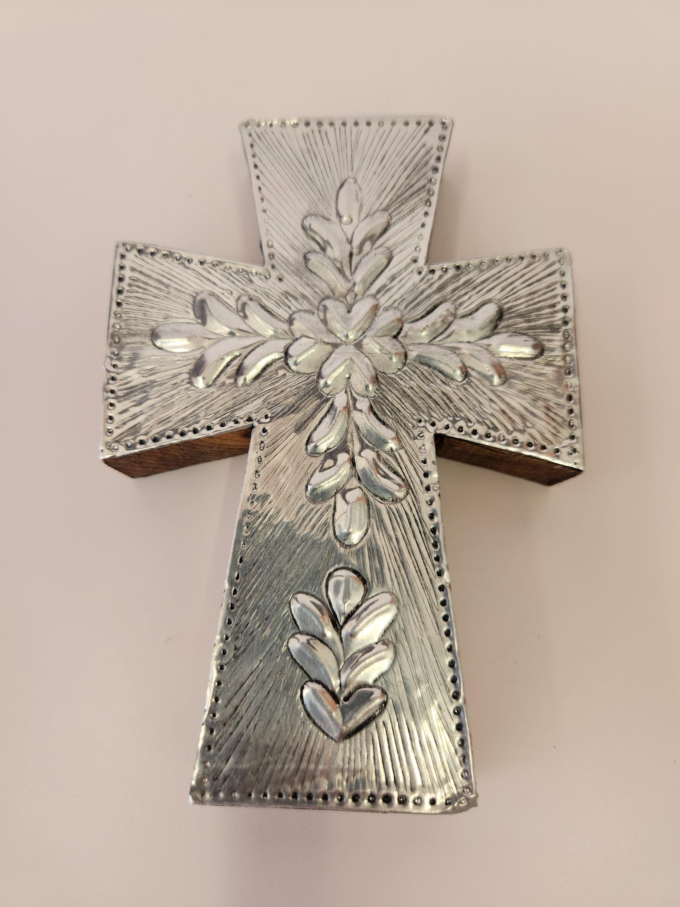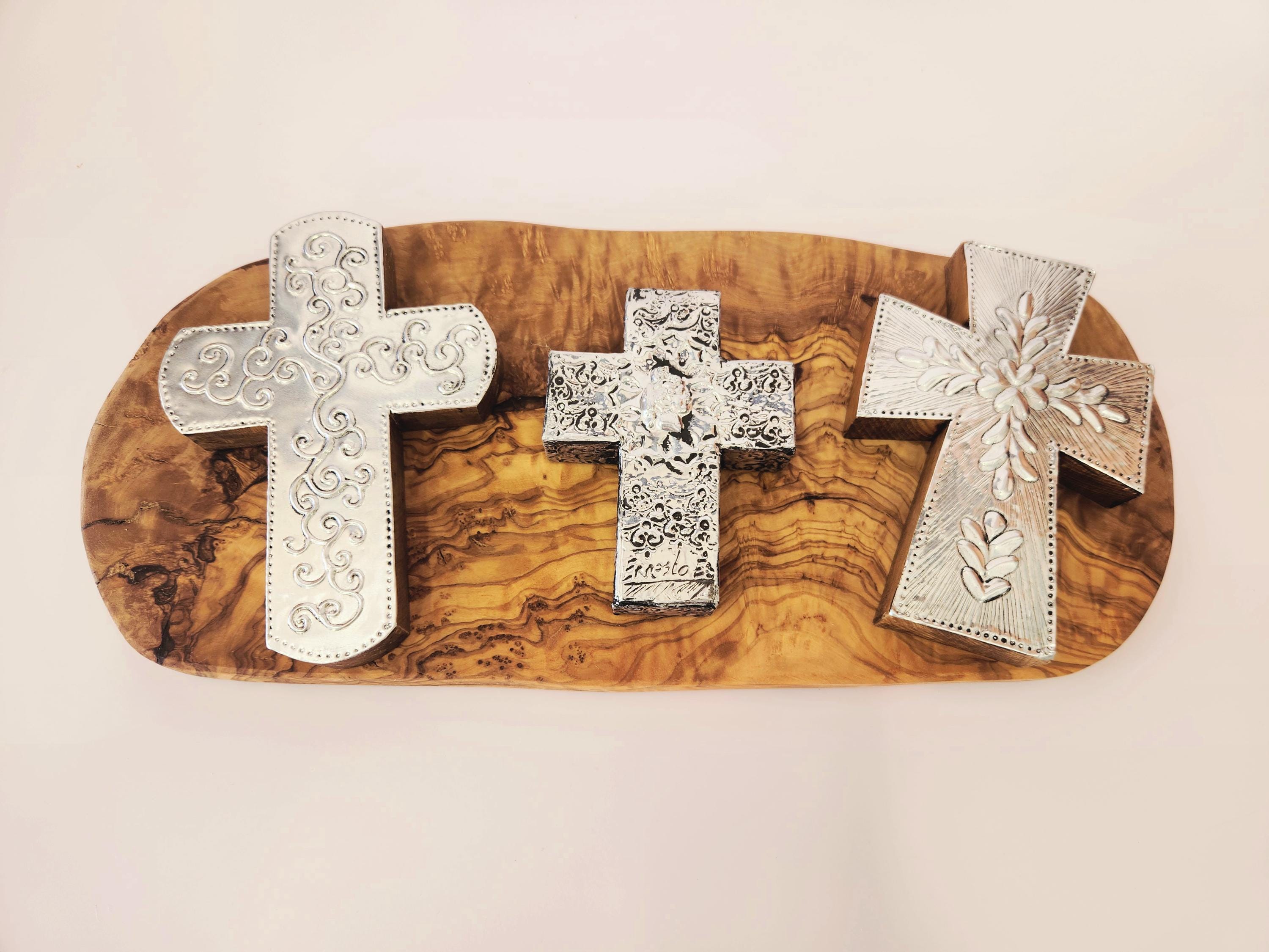 These amazing Handcrafted Art Punched Tin Crosses are sold as a set of 3. Each are distinctly unique and true works of art. All three are signed. The two larger ones have signatures on the back (please see the photos) and the smaller one is signed at the bottom. Although hard to photograph, the smaller cross is singed at the bottom and has a silhouette of a face in the middle. There is no yellowing of the crosses, this is just from the shadows of the photography. I have had these for over 20 years and have been well taken care of. Now it's time for someone else to enjoy.