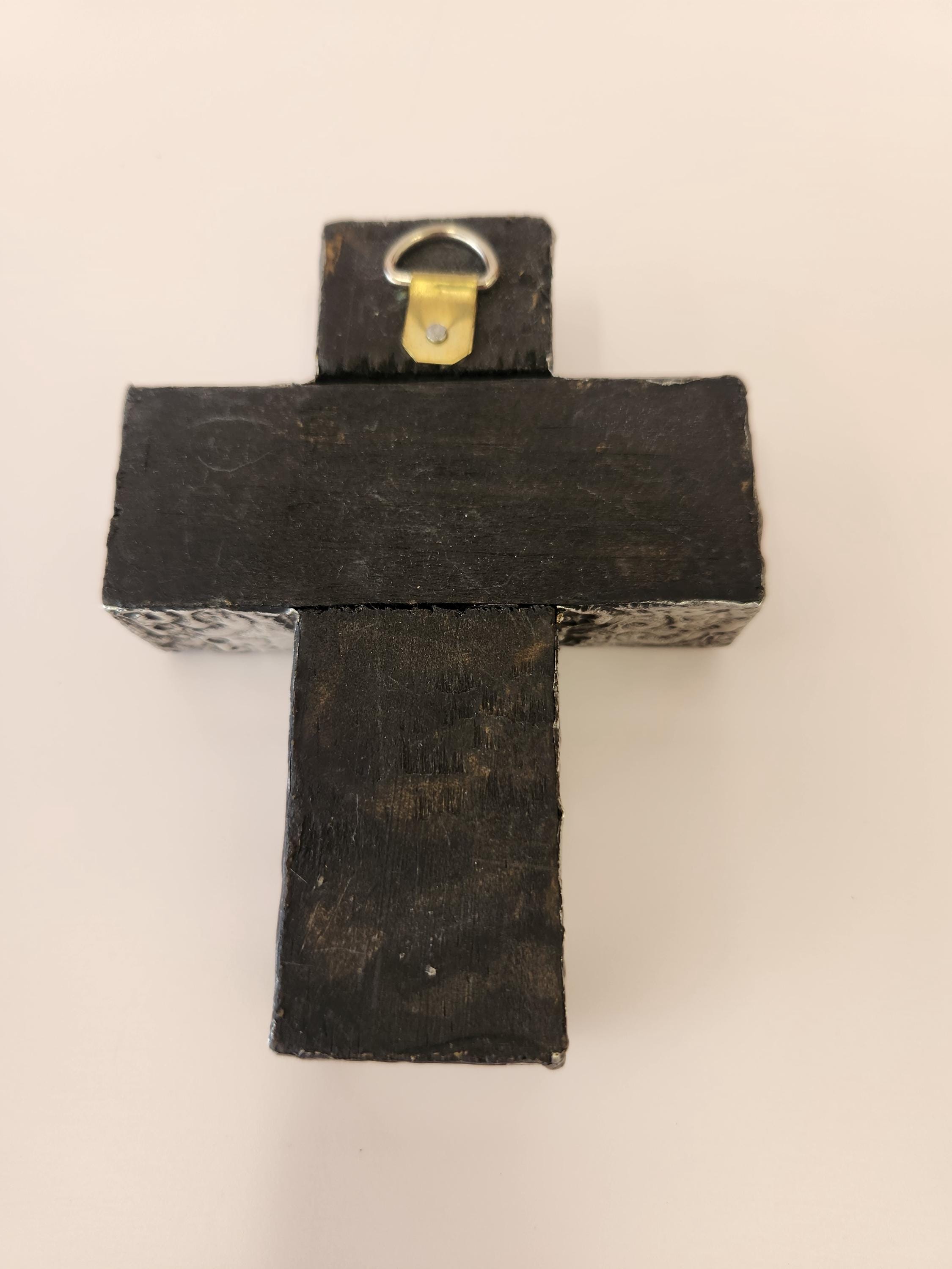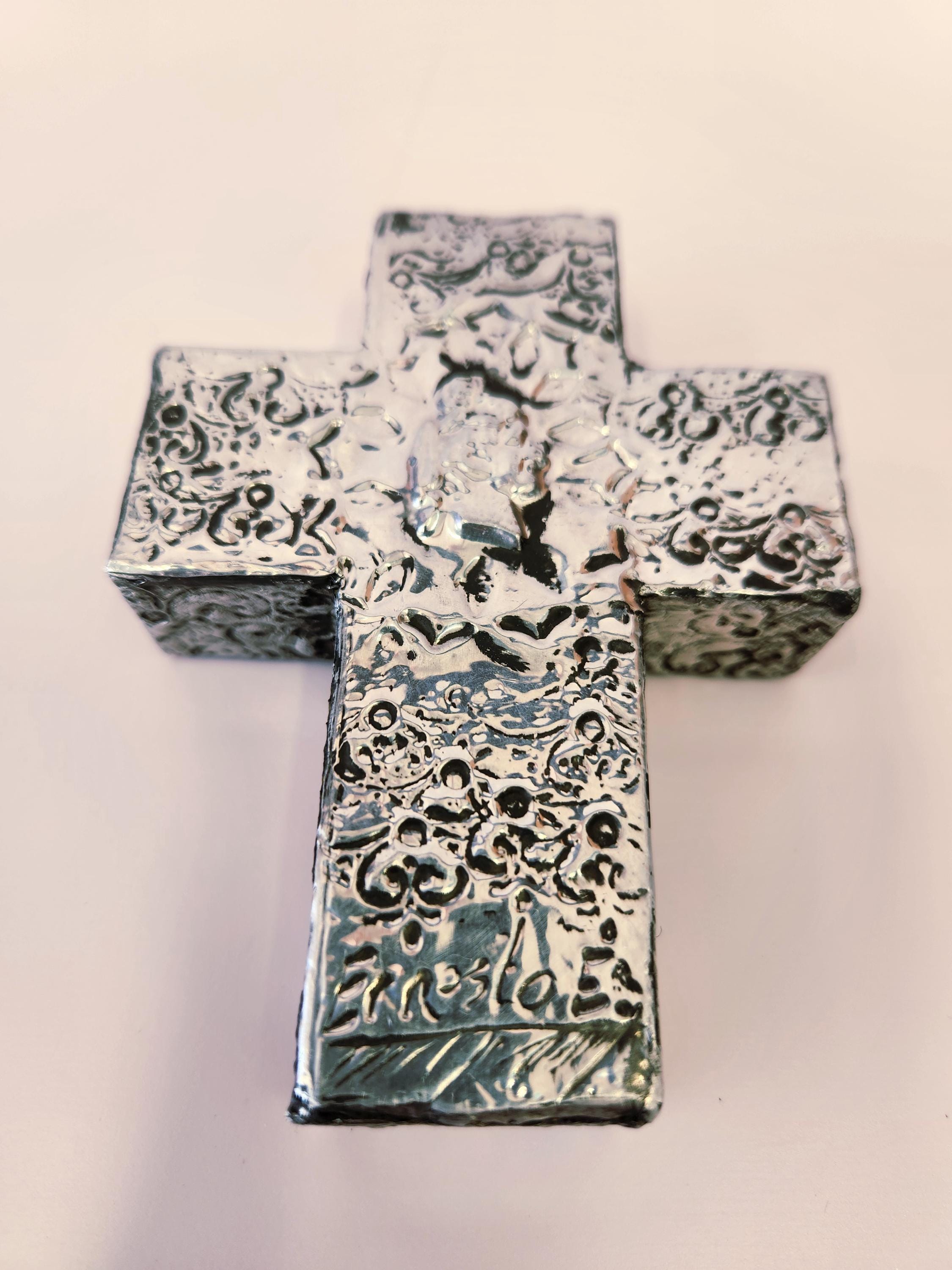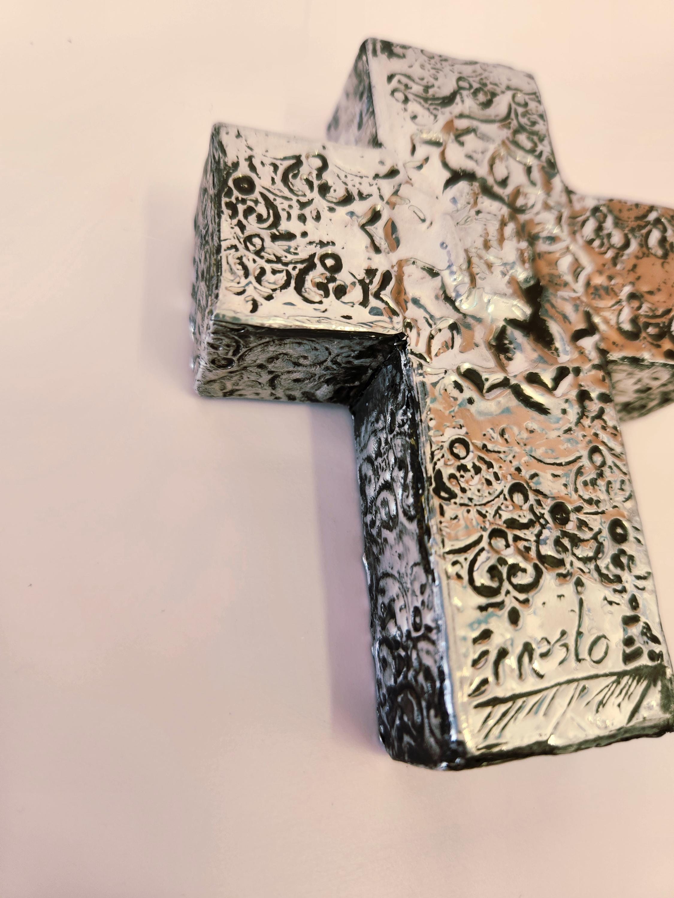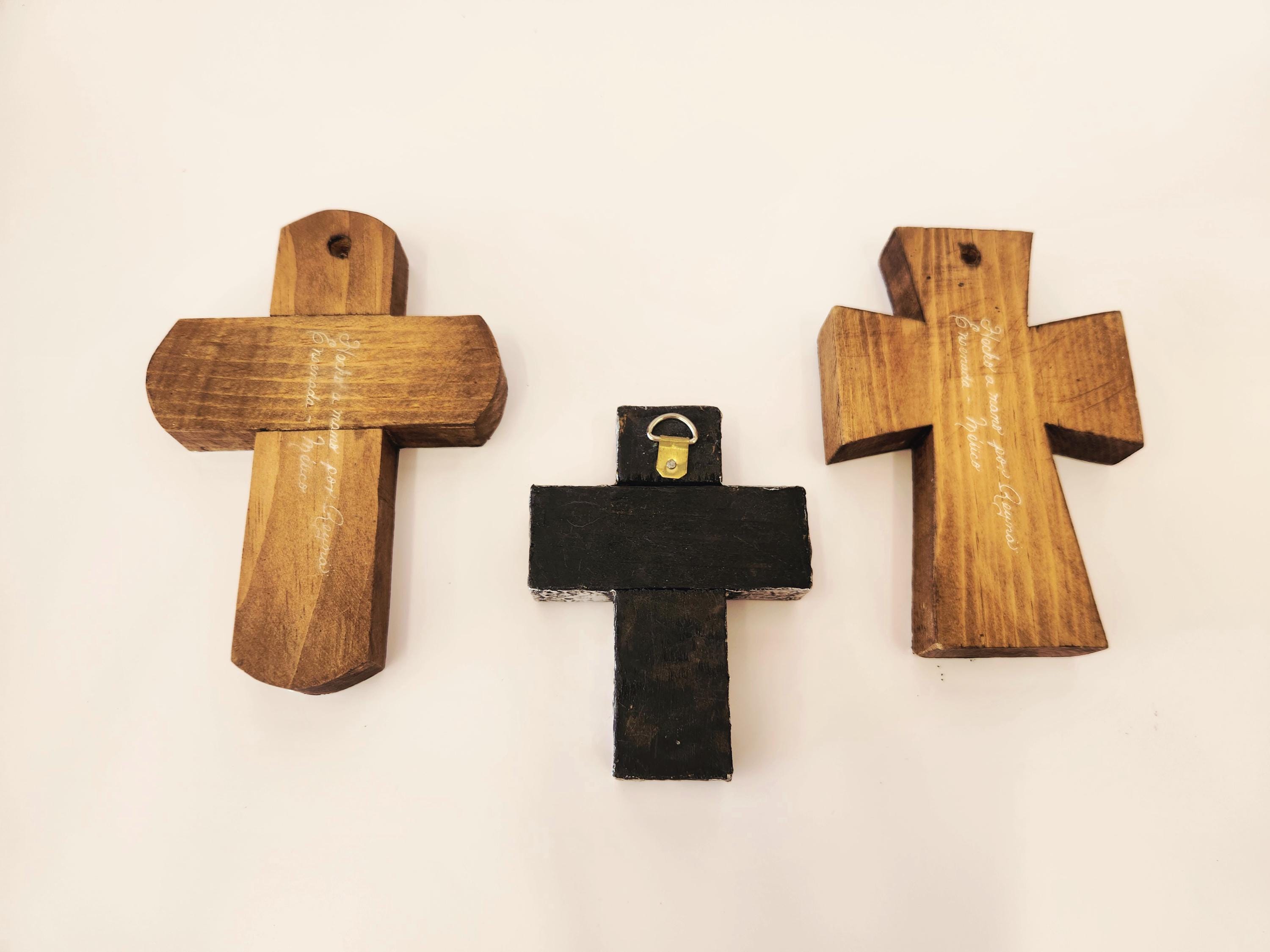 These amazing Handcrafted Art Punched Tin Crosses are sold as a set of 3. Each are distinctly unique and true works of art. All three are signed. The two larger ones have signatures on the back (please see the photos) and the smaller one is signed at the bottom. Although hard to photograph, the smaller cross is singed at the bottom and has a silhouette of a face in the middle. There is no yellowing of the crosses, this is just from the shadows of the photography. I have had these for over 20 years and have been well taken care of. Now it's time for someone else to enjoy.