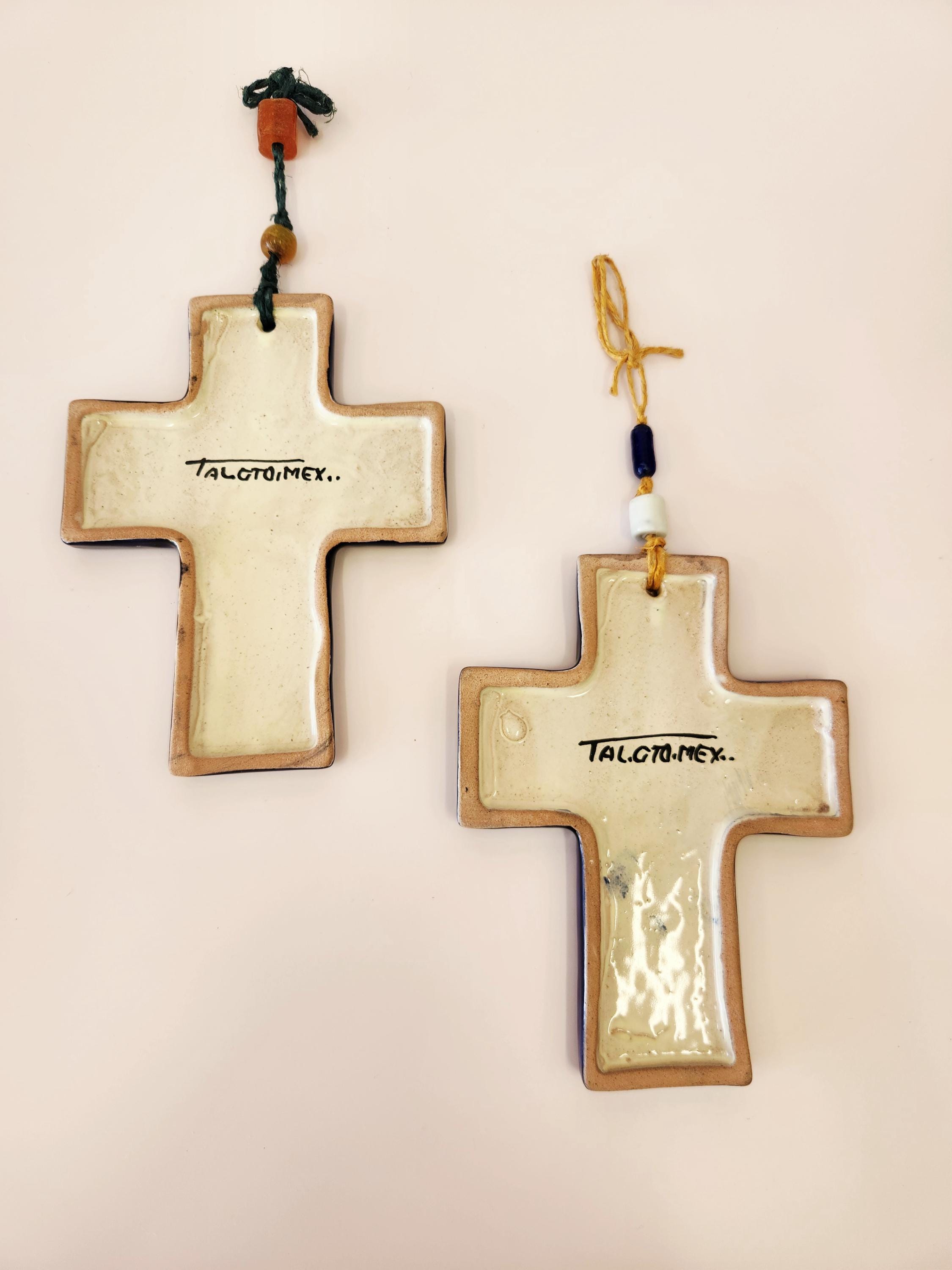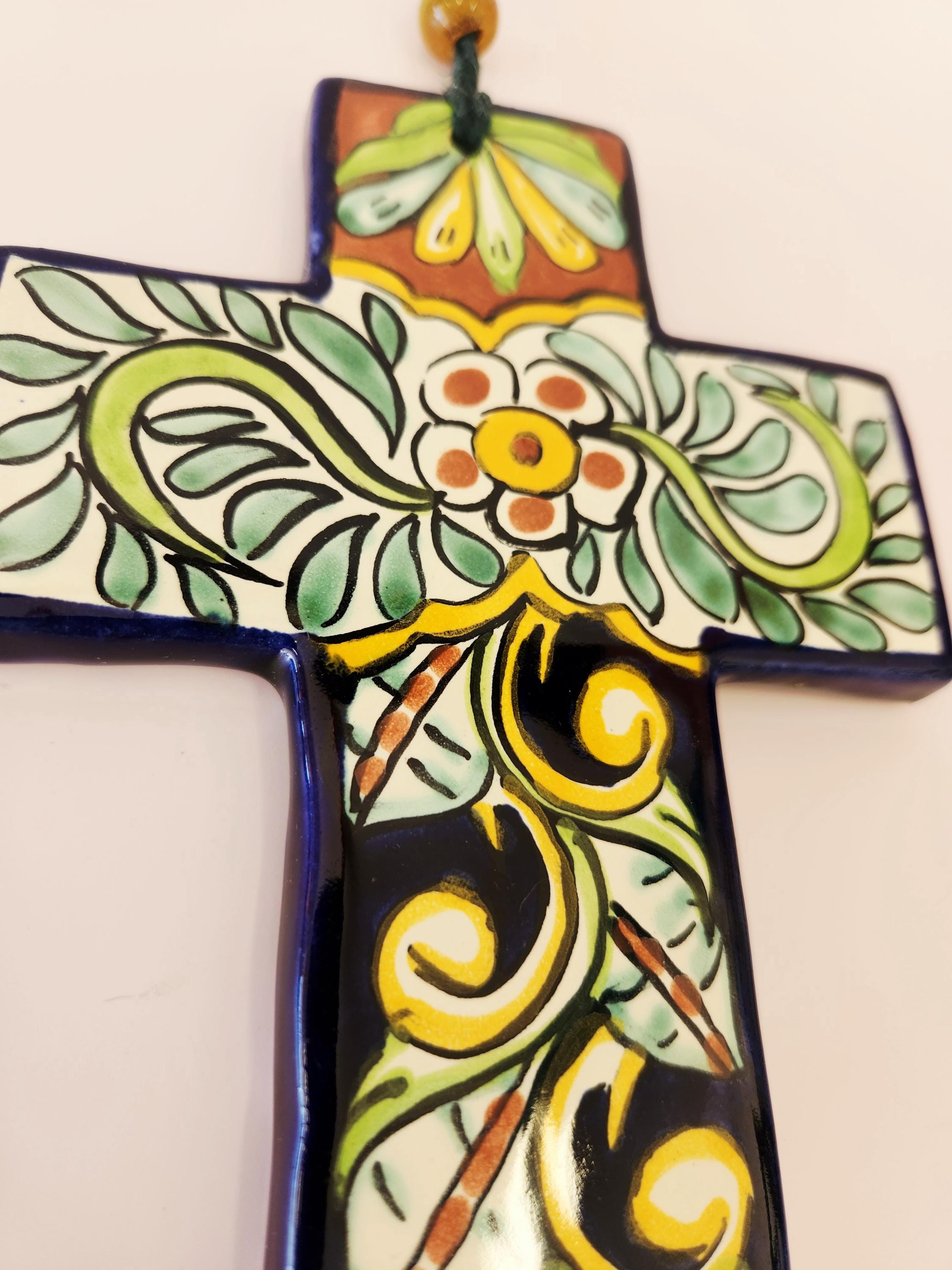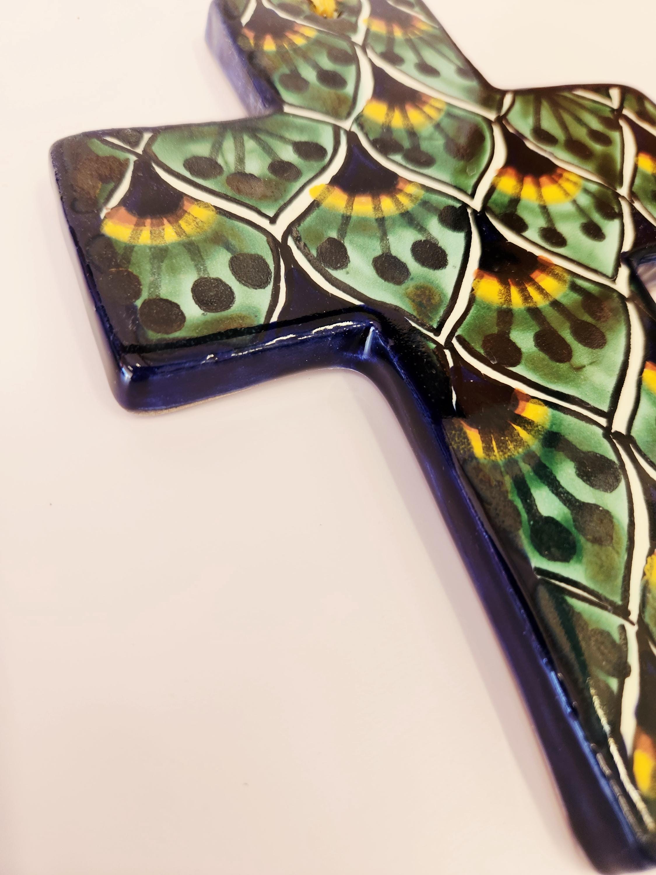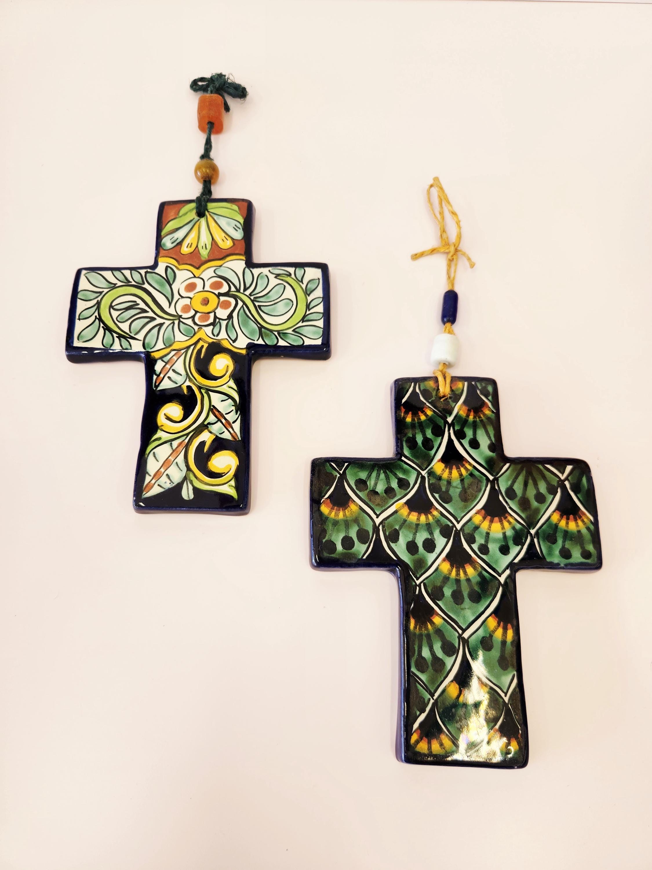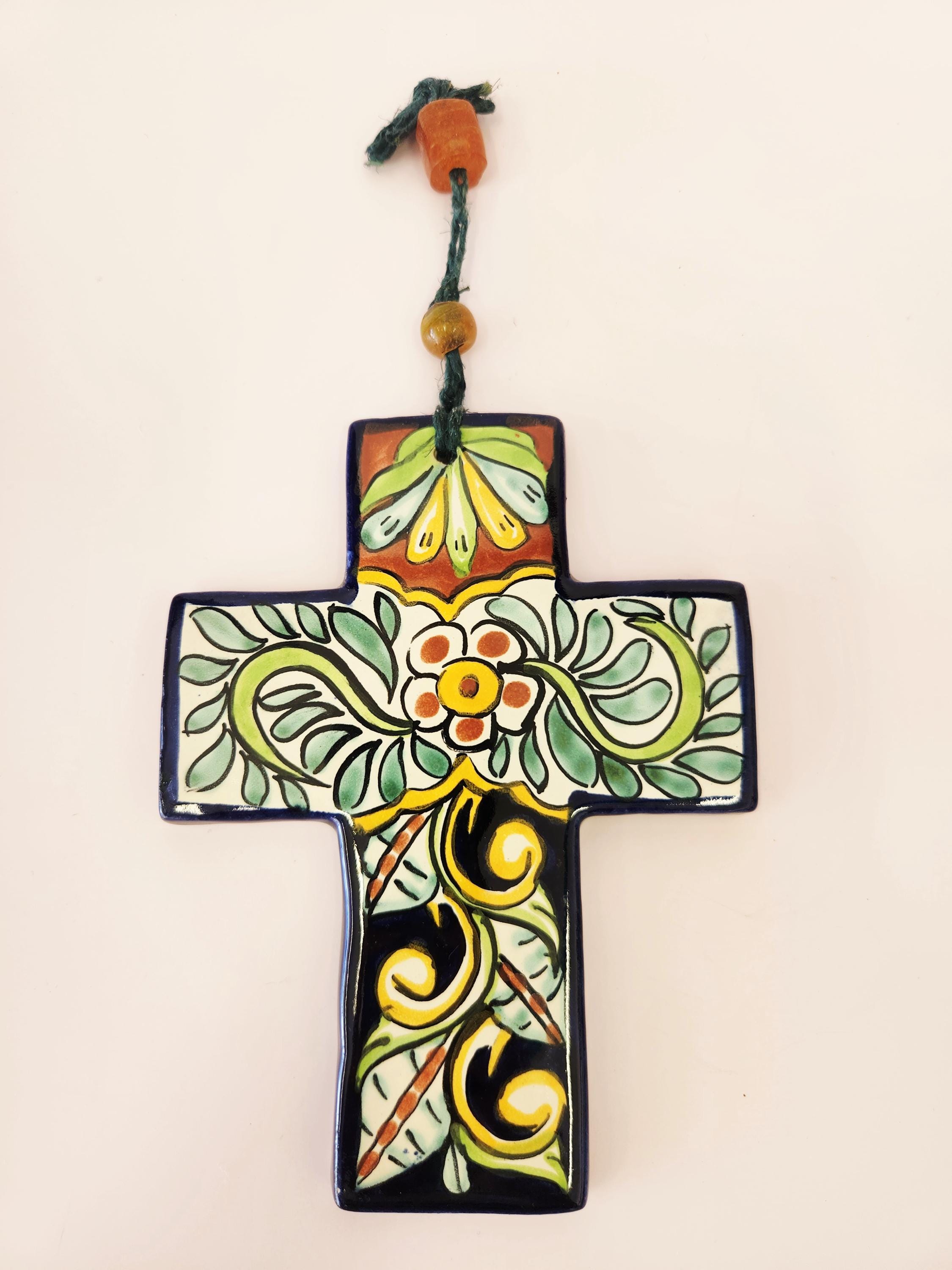 These beautiful hand-painted ceramic cross features folk art design reminiscent of traditional Mexican Talavera pottery. These crosses are decorated in various colors with complimentary beads from the cord attached at the top for hanging. I have had this in my collection for over 20 years and have been well taken care of. Now it's time for someone else to enjoy. Each measure 7" long and 5.5" in width. Please review the measurements to ensure it is the correct size for you.