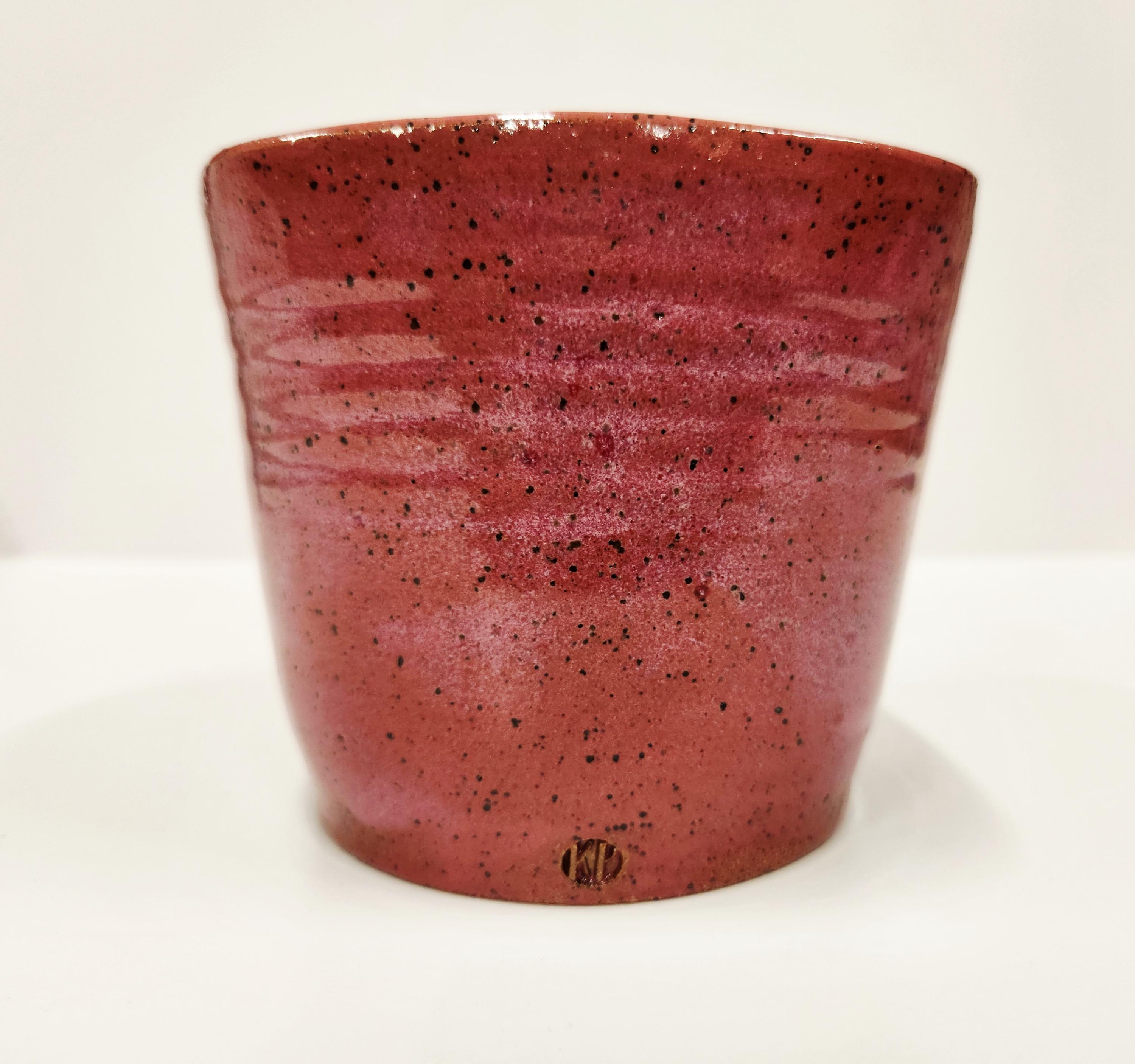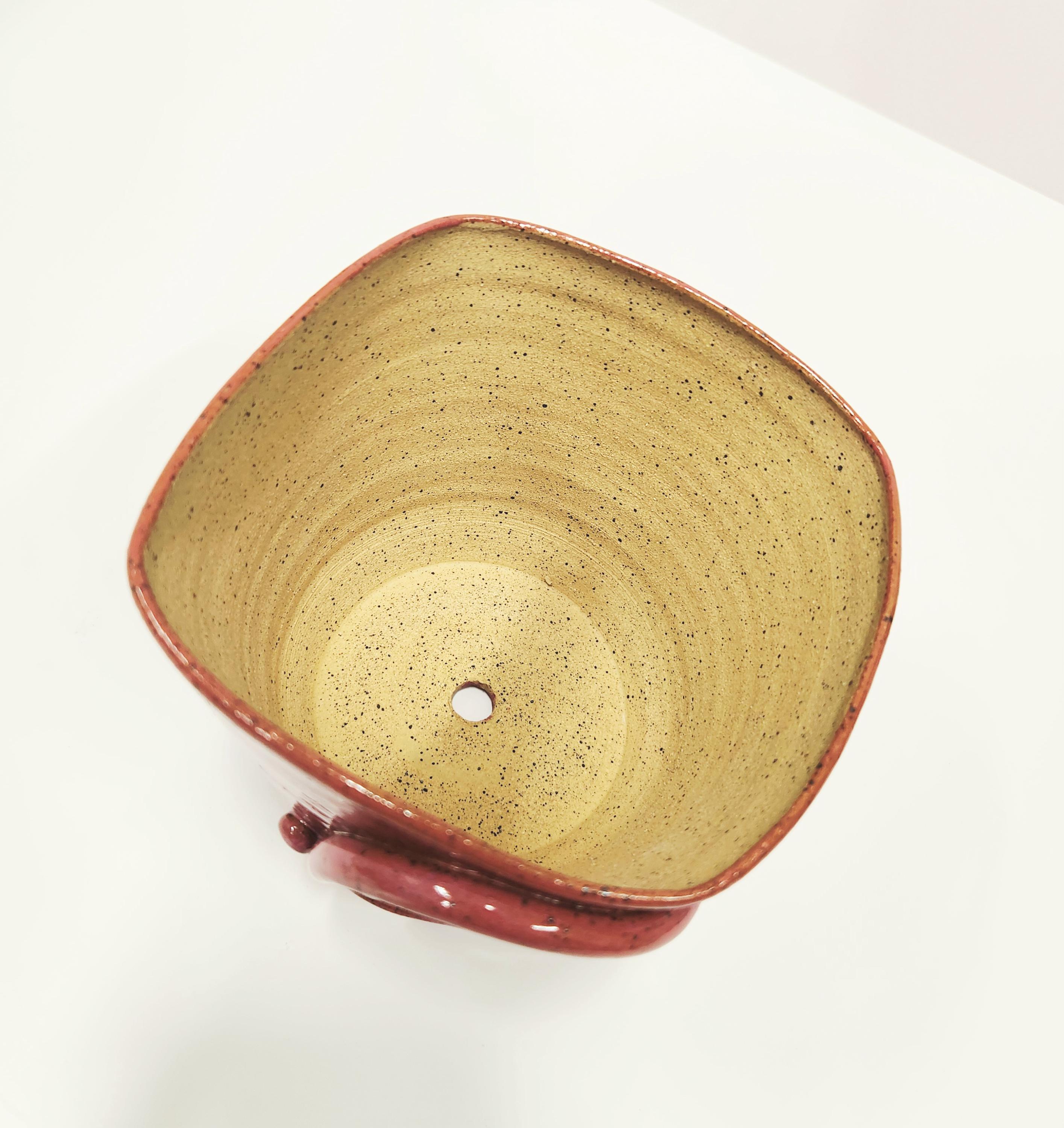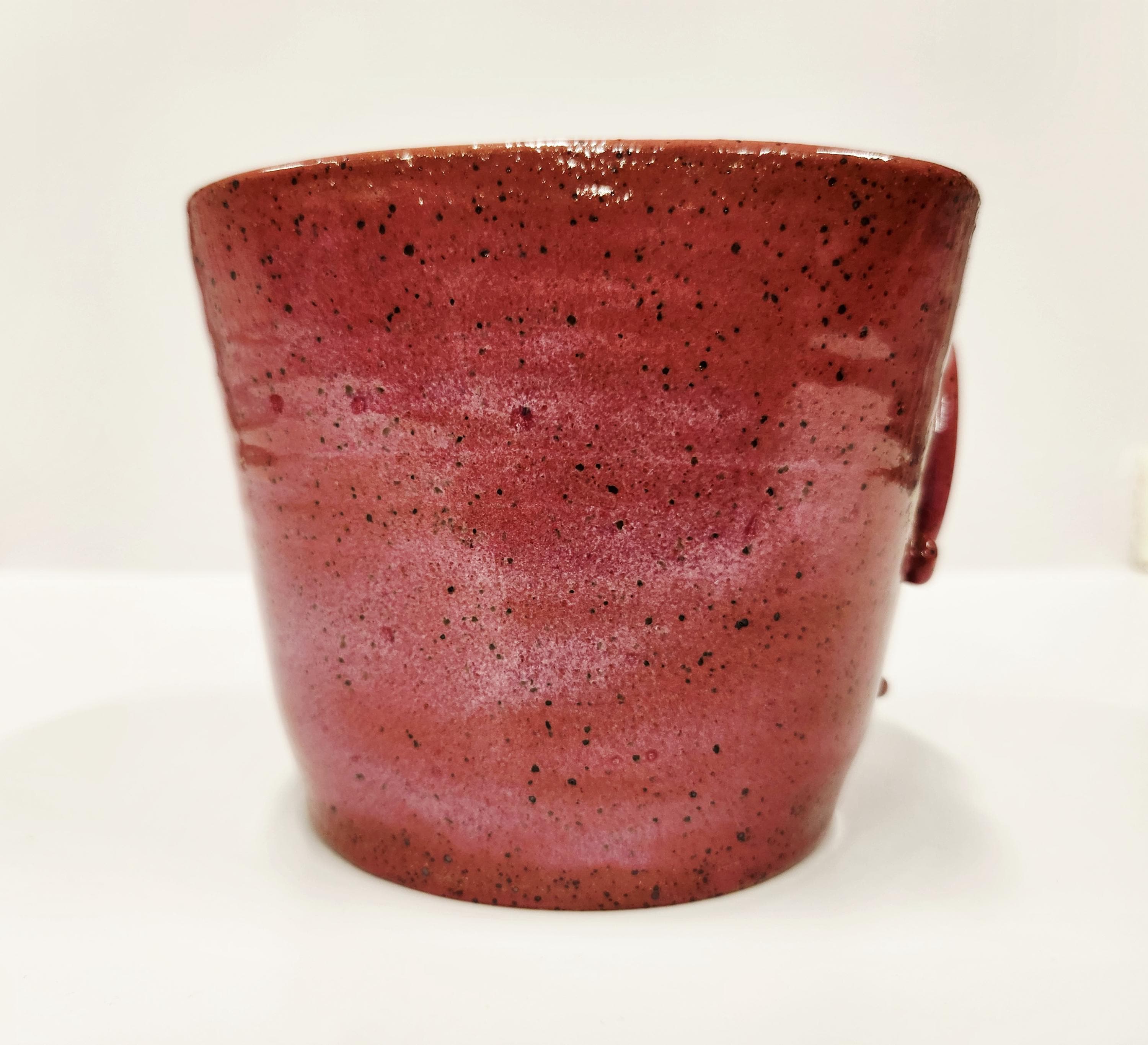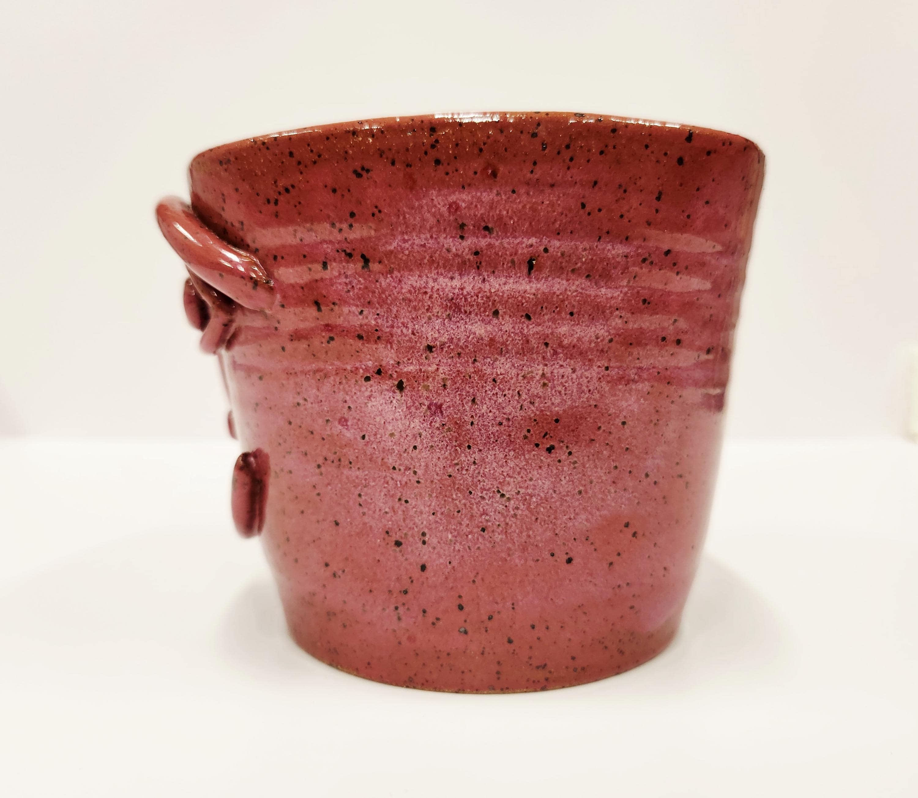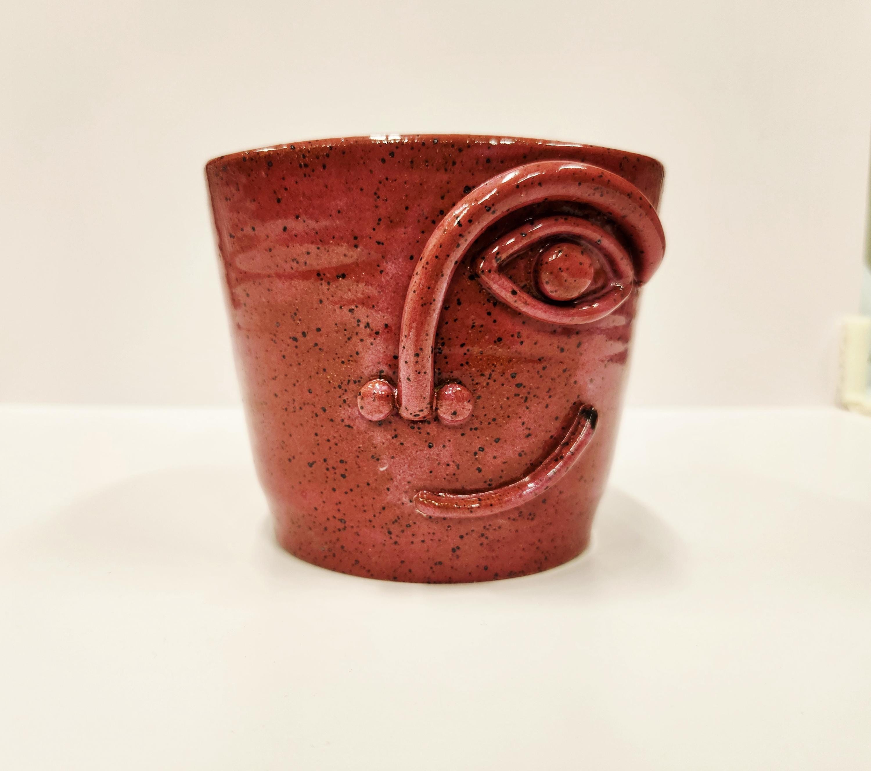 This buff speckled clay planter has a unique "Picaso" like facial expression and finished in a fuchsia pink glaze. Measures approximately 4" tall x 4.5" wide. This would be a great gift for any art lover.