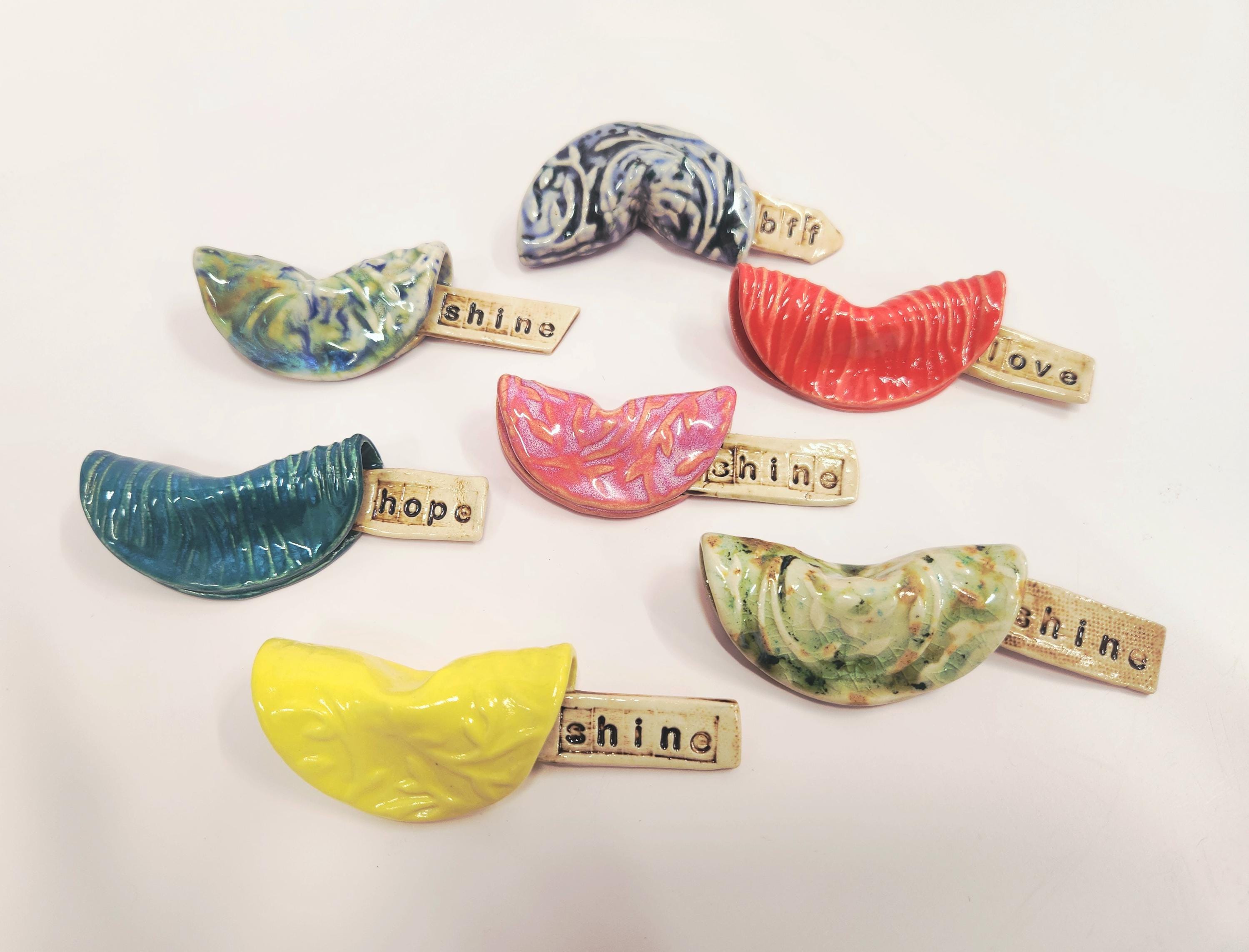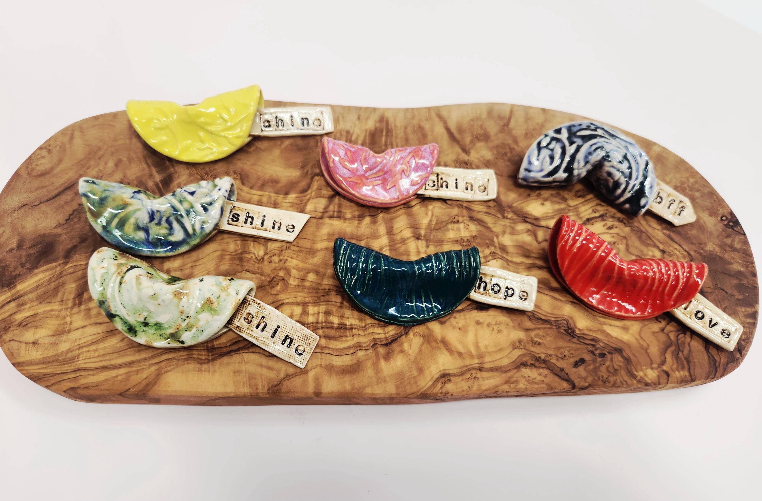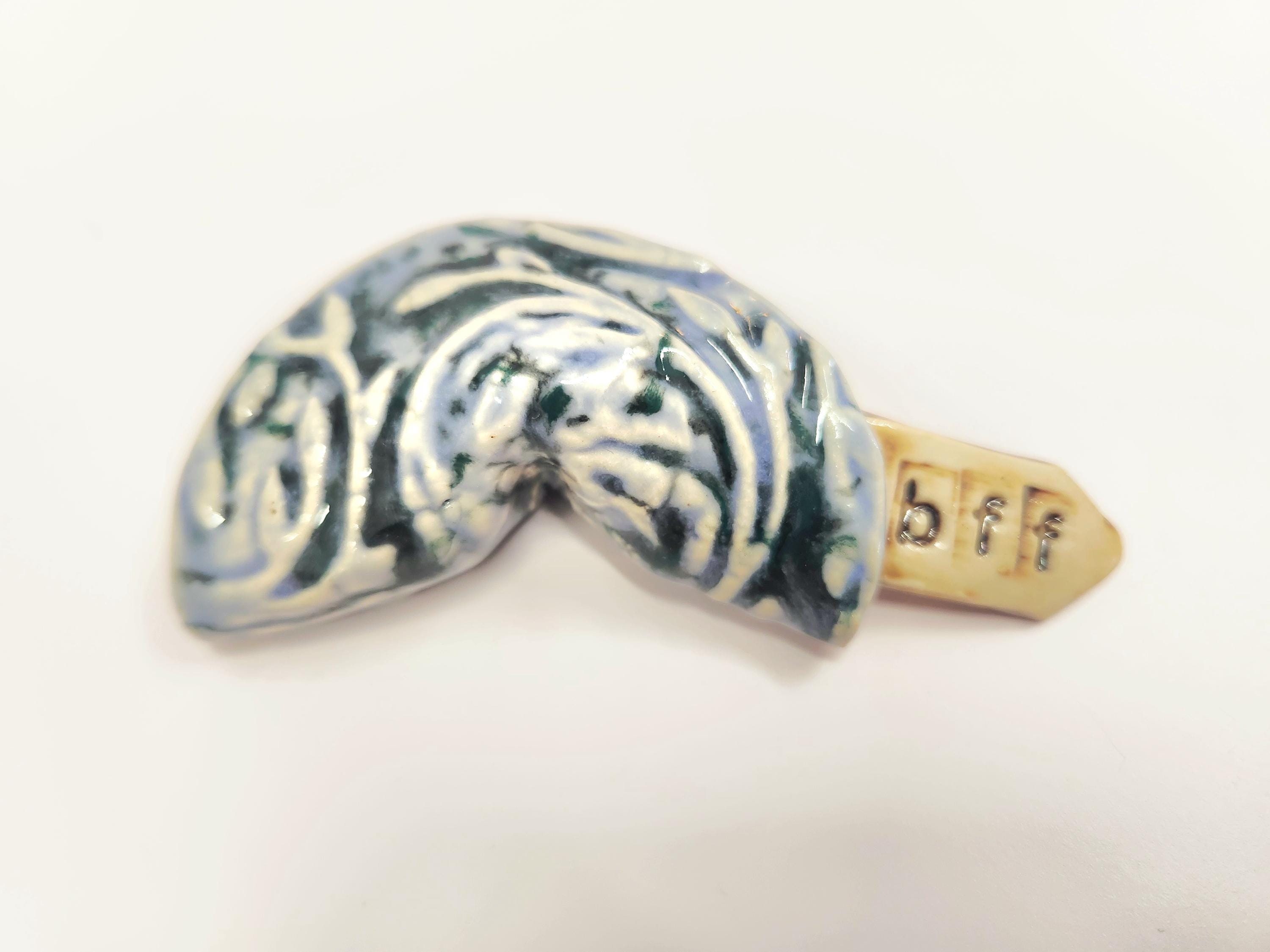 Each Fortune Cookie is unique and one of a kind. Handcrafted each with a unique pattern and glaze, these ceramic cookies have their own special message. Great to tuck in a lunch as a sweet surprise of hidden for that special someone to find. Sure to be a special gift for anyone....
