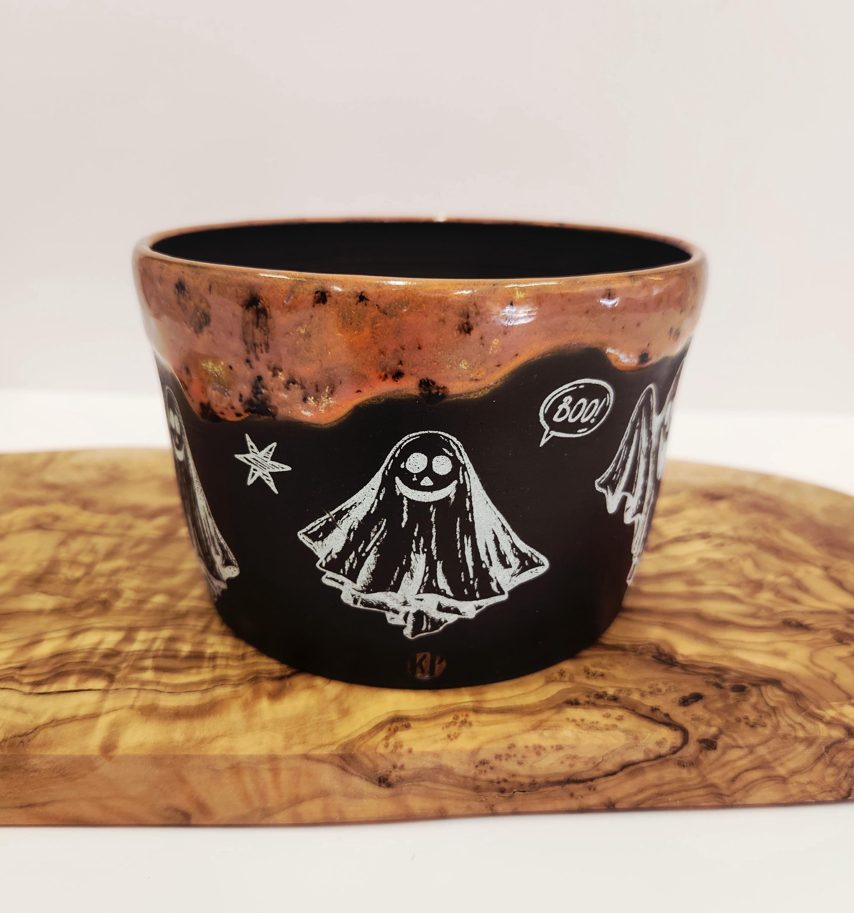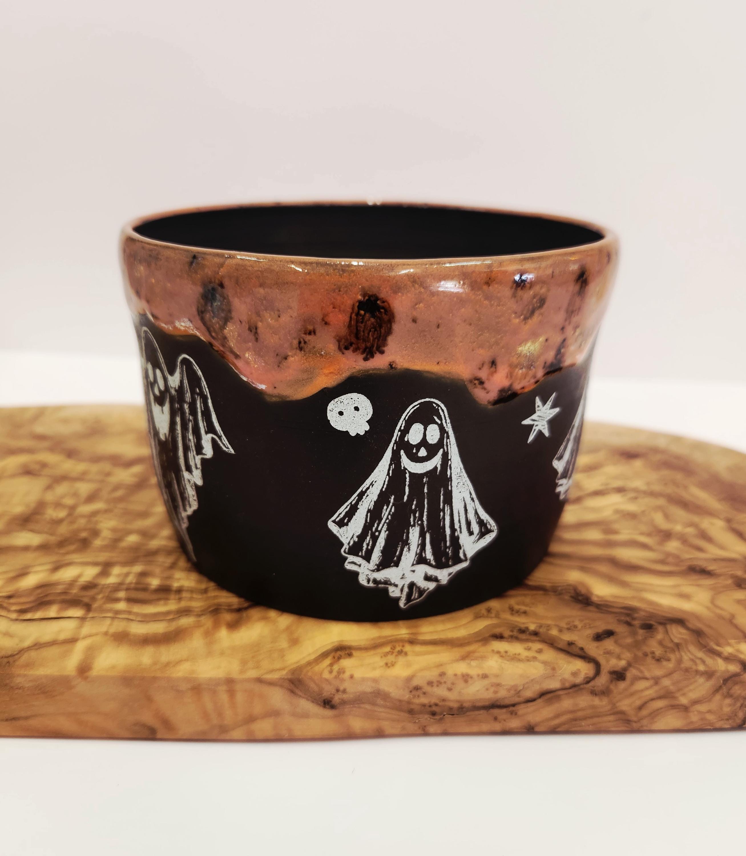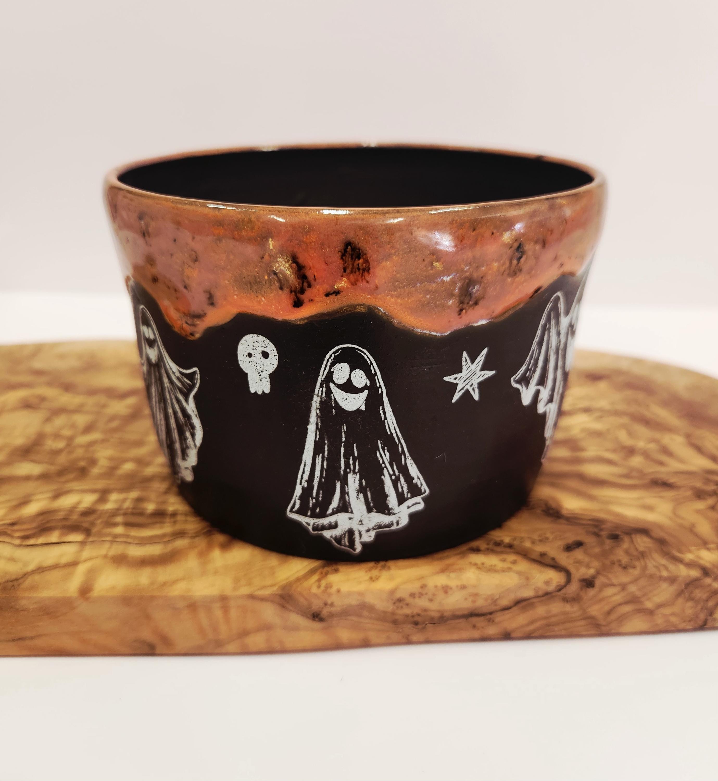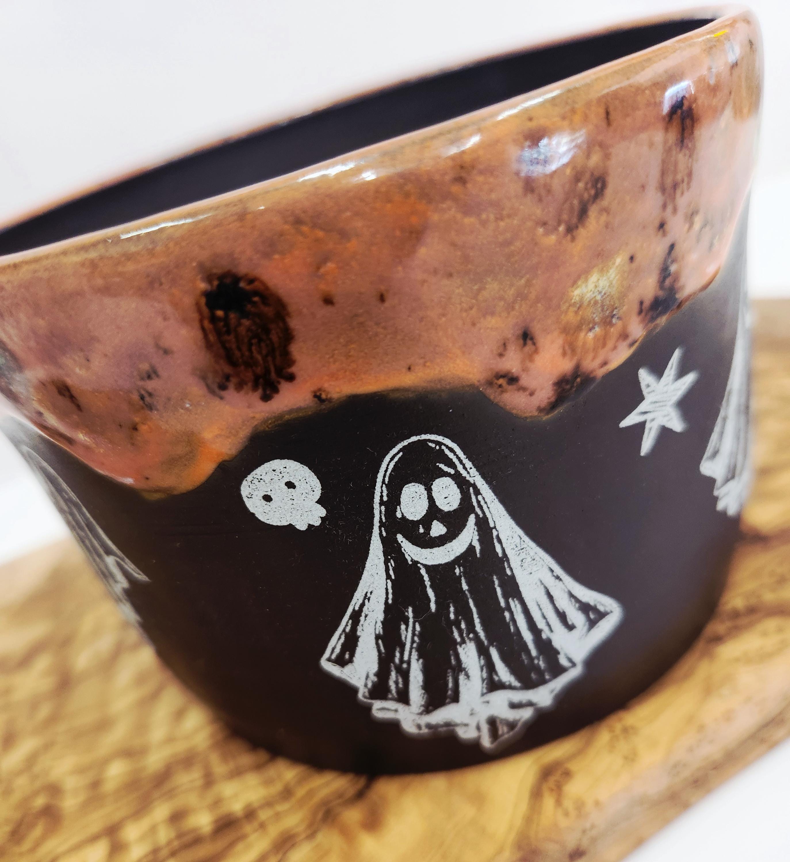 This drippy glaze planter has a whimsical white Ghost pattern with an orange drippy glaze, highlights of cream and hints of brown speckles. This planter measures approximately 3.75" tall and 4.25" wide and drainage hold at the bottom.