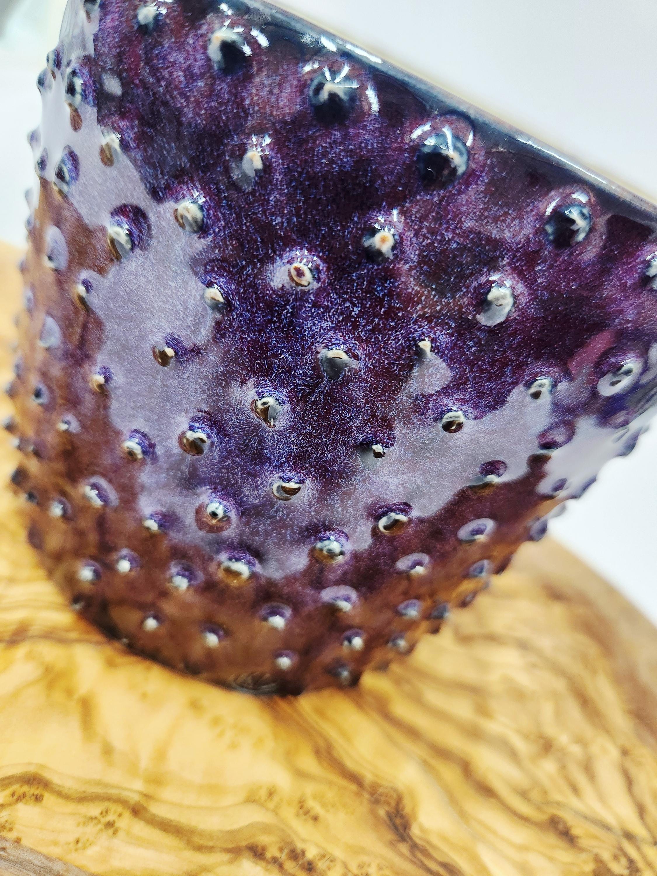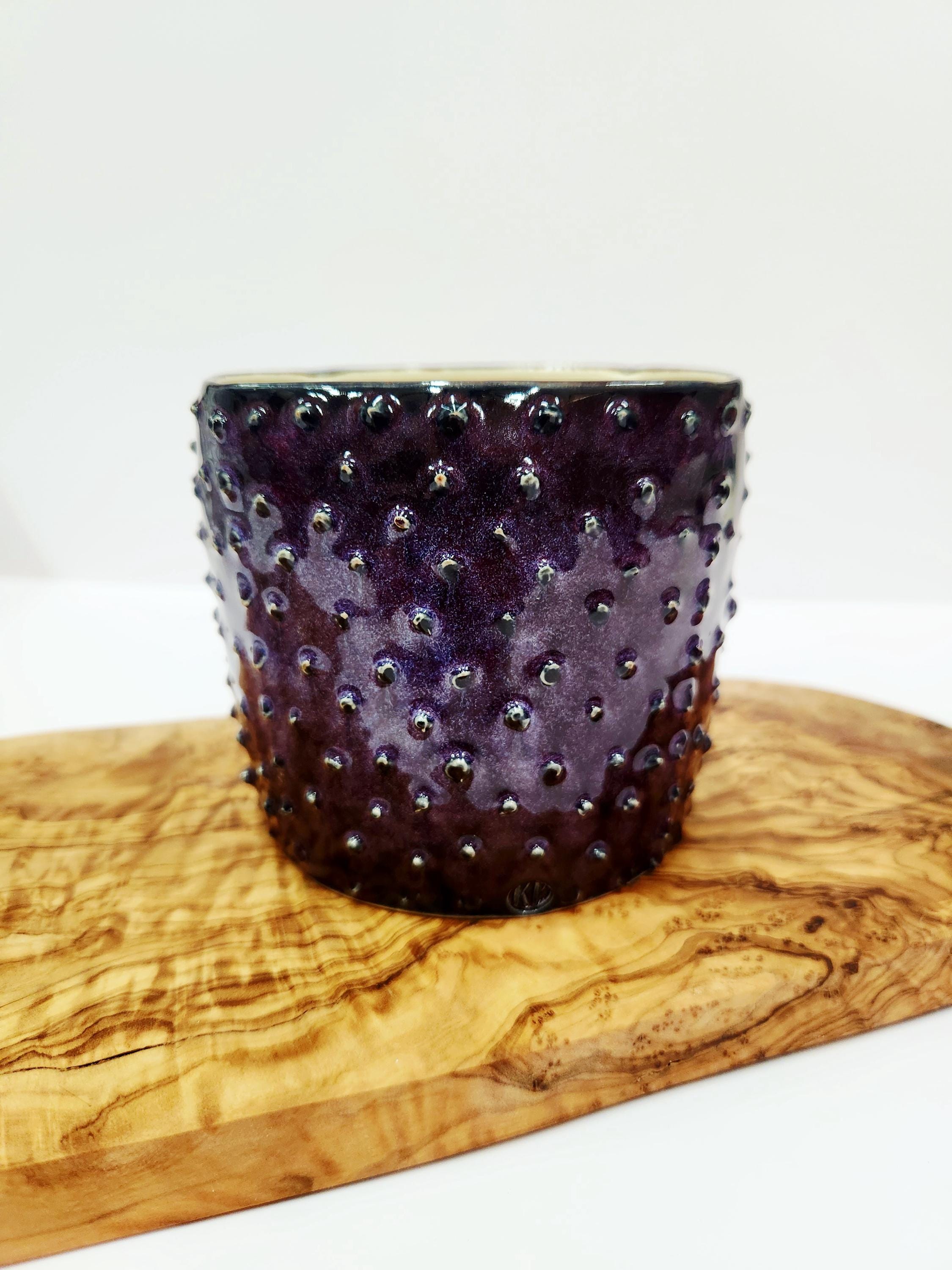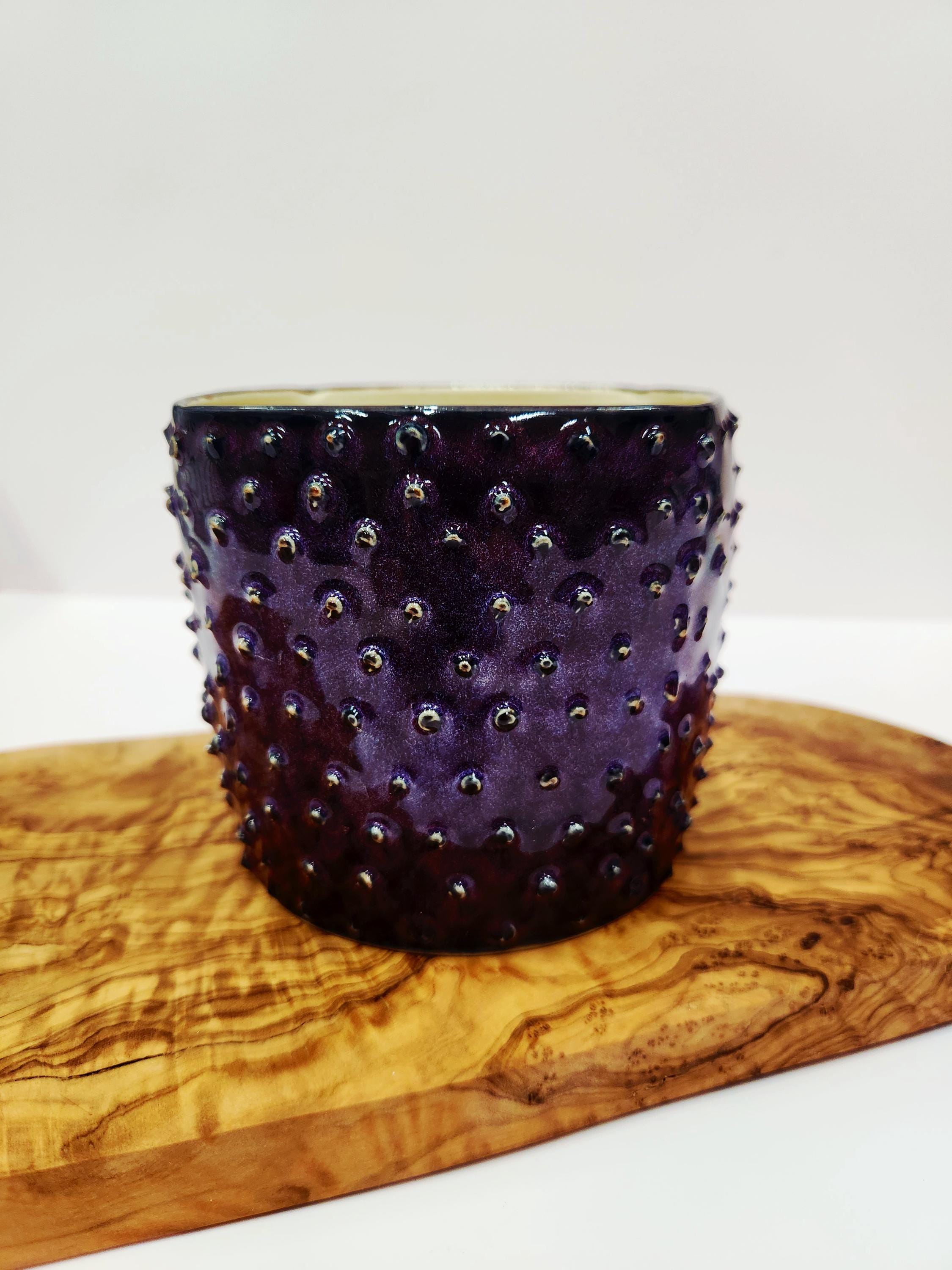 This planter is made with raised ceramic dots and finished in a deep purple glaze that has a bit of iridescence to it. It is square in shape and measuring 4" tall and 4.25".