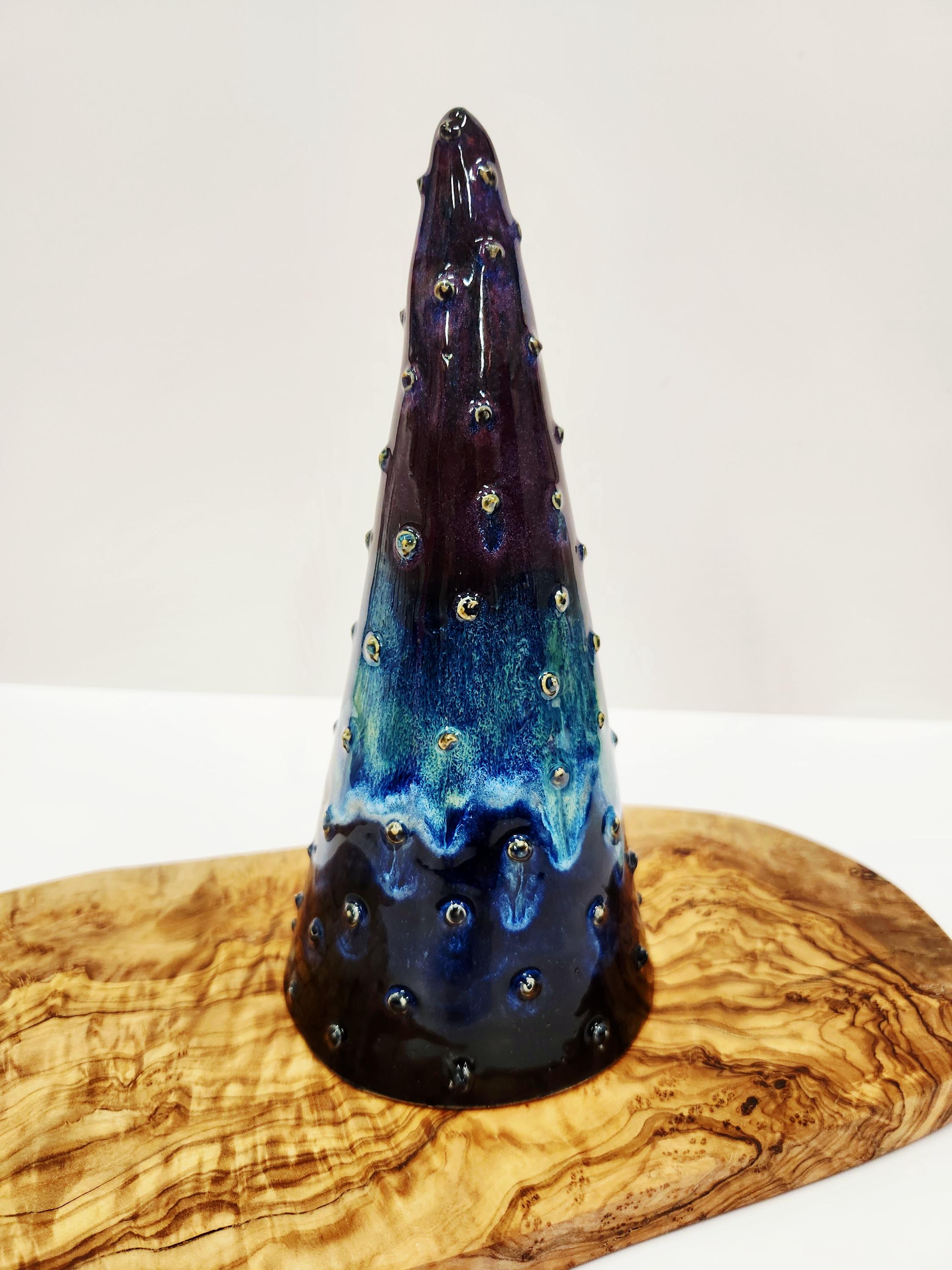 This tree shaped ornament is made with raised ceramic dots and finished in a deep purple, blue, and iridescent green glaze. It is cone/tree in shape and measures 9" tall and 4" wide at the base. This was originally thought to be a Christmas ornament, but I found to love it tucked in my yard with the succulents. It truly made the glaze stand out.